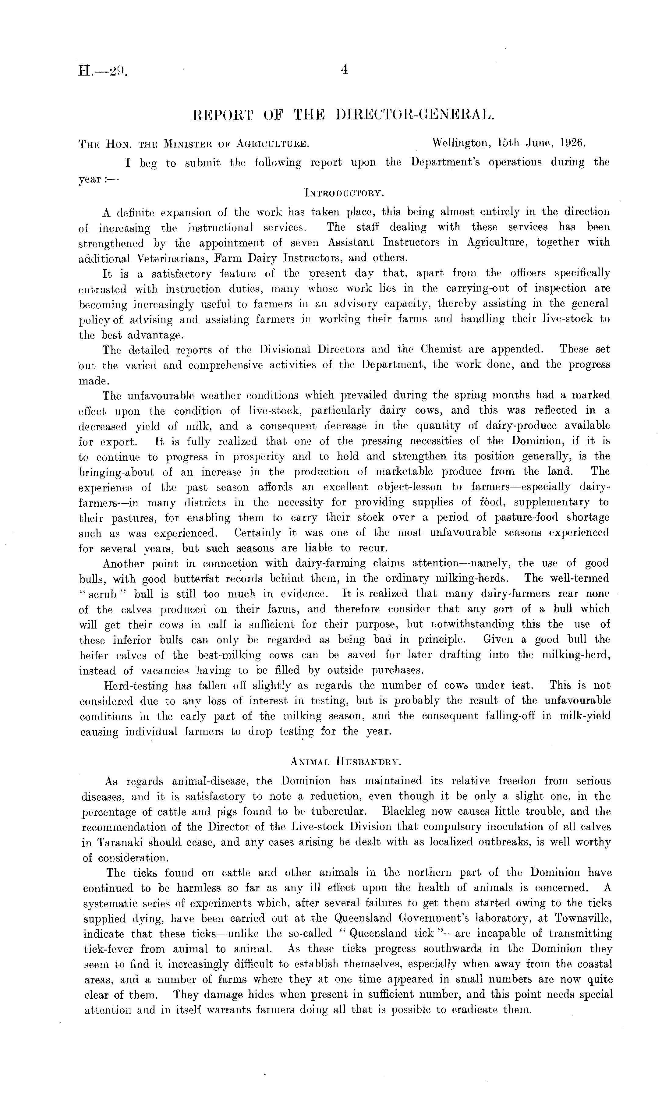 REPORT OF THE DIRECTOR-GENERAL. The Hon. the Minister of Agriculture. Wellington, 15th June, 1926. I beg to submit the following report upon the Department's operations during the year Introductory. A definite expansion of the work has taken place, this being almost entirely in the direction of increasing the instructional services. The staff dealing with these services has been strengthened by the appointment of seven Assistant Instructors in Agriculture, together with additional Veterinarians, Farm Dairy Instructors, and others. It is a satisfactory feature of the present day that, apart from the officers specifically entrusted with instruction duties, many whose work lies in the carrving-out of inspection are becoming increasingly useful to farmers in an advisory capacity, thereby assisting ,in the general policy of advising and assisting farmers in working their farms and handling their live-stock to the best advantage. The detailed reports of the Divisional Directors and the Chemist are appended. These set out the varied and comprehensive activities of the Department, the work done, and the progress made. The unfavourable weather conditions which prevailed during the spring months had a marked effect upon the condition of live-stock, particularly dairy cows, and this was reflected in a decreased yield of milk, and a consequent decrease in the quantity of dairy-produce available for export. It is fully realized that one of the pressing necessities of the Dominion, if it is to continue to progress in prosperity and to hold and strengthen its position generally, is the bringing-about of an increase in the production of marketable produce from the land. The experience of the past season affords an excellent object-lesson to farmers —especially dairyfarmers —in many districts in the necessity for providing supplies of food, supplementary to their pastures, for enabling them to carry their stock over a period of pasture-food shortage such as was experienced. Certainly it was one of the most unfavourable seasons experienced for several years, but such seasons are liable to recur. Another point in connection with dairy-farming claims attention—namely, the use of good bulls, with good butterfat records behind them, in the ordinary milking-herds. The well-termed " scrub " bull is still too much in evidence. It is realized that many dairy-farmers rear none of the calves produced on their farms, and therefore consider that any sort of a bull which will get their cows in calf is sufficient for their purpose, but notwithstanding this the use of these inferior bulls can only be regarded as being bad in principle. Given a good bull the heifer calves of the best-milking cows can be saved for later drafting into the milking-herd, instead of vacancies having to be filled by outside purchases. Herd-testing has fallen off slightly as regards the number of cows under test. This is not considered due to any loss of interest in testing, but is probably the result of the unfavourable conditions in the early part of the milking season, and the consequent falling-off in milk-yield causing individual farmers to drop testing for the year. Animal Husbandry. As regards animal-disease, the Dominion has maintained its relative freedon from serious diseases, and it is satisfactory to note a reduction, even though it be only a slight one, in the percentage of cattle and pigs found to be tubercular. Blackleg now causes little trouble, and the recommendation of the Director of the Live-stock Division that compulsory inoculation of all calves in Taranaki should cease, and any cases arising be dealt with as localized outbreaks, is well worthy of consideration. The ticks found on cattle and other animals in the northern part of the Dominion have continued to be harmless so far as any ill effect upon the health of animals is concerned. A systematic series of experiments which, after several failures to get them started owing to the ticks supplied dying, have been carried out at .the Queensland Government's laboratory, at Townsville, indicate that these ticks —unlike the so-called " Queensland tick " —are incapable of transmitting tick-fever from animal to animal. As these ticks progress southwards in the Dominion they seem to find it increasingly difficult to establish themselves, especially when away from the coastal areas, and a number of farms where they at one time appeared in small numbers are now quite clear of them. They damage hides when present in sufficient number, and this point needs special attention and in itself warrants farmers doing all that is possible to eradicate them.