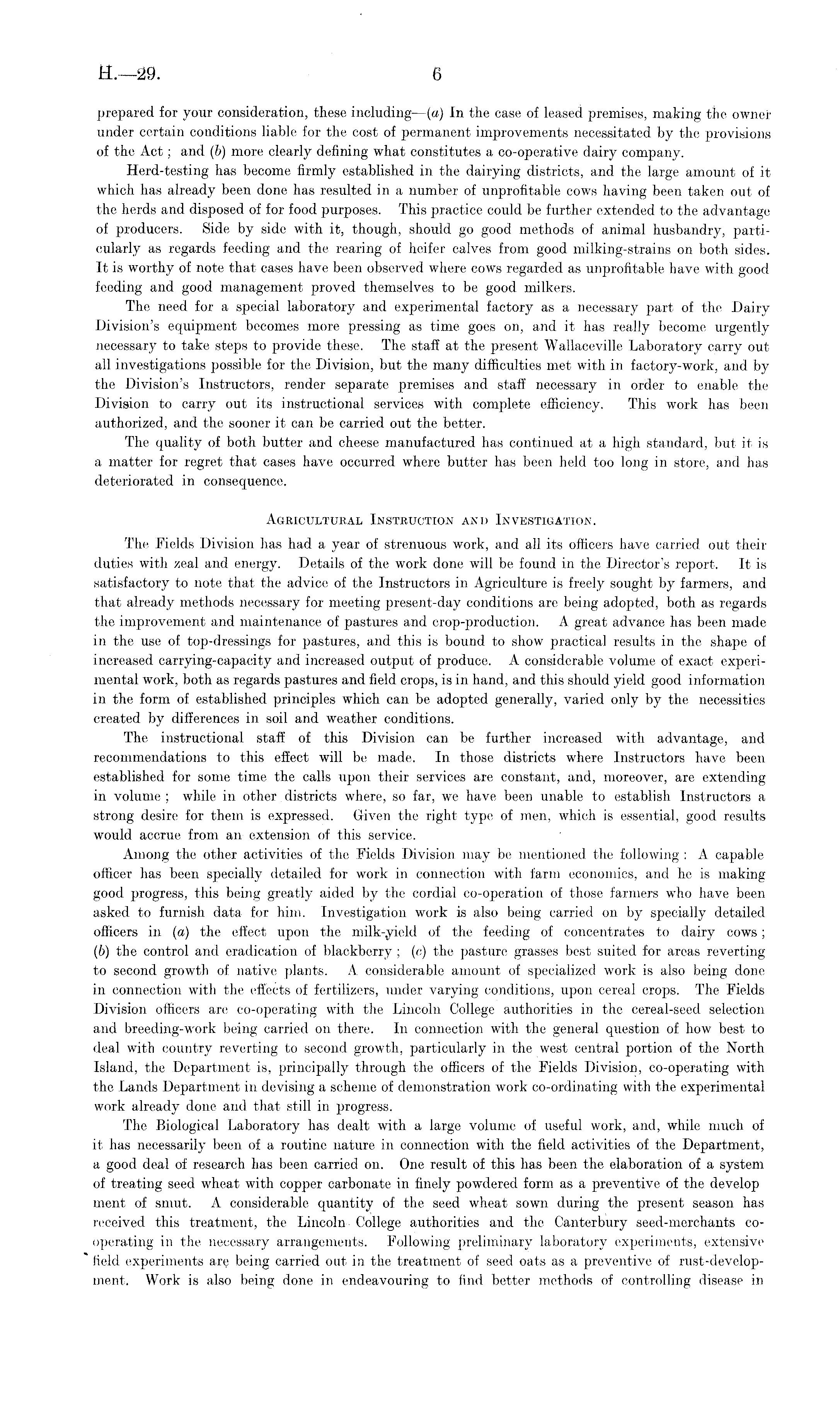 prepared for your consideration, these including —(a) In the case of leased premises, making the owner under certain conditions liable for the cost of permanent improvements necessitated by the provisions of the Act; and (b) more clearly defining what constitutes a co-operative dairy company. Herd-testing has become firmly established in the dairying districts, and the large amount of it which has already been done has resulted in a number of unprofitable cows having been taken out of the herds and disposed of for food purposes. This practice could be further extended to the advantage of producers. Side by side with it, though, should go good methods of animal husbandry, particularly as regards feeding and the rearing of heifer calves from good milking-strains on both sides. It is worthy of note that cases have been observed where cows regarded as unprofitable have with good feeding and good management proved themselves to be good milkers. The need for a special laboratory and experimental factory as a necessary part of the Dairy Division's equipment becomes more pressing as time goes on, and it has really become urgently necessary to take steps to provide these. The staff at the present Wallaceville Laboratory carry out all investigations possible for the Division, but the many difficulties met with in factory-work, and by the Division's Instructors, render separate premises and staff necessary in order to enable the Division to carry out its instructional services with complete efficiency. This work has been authorized, and the sooner it can be carried out the better. The quality of both butter and cheese manufactured has continued at a high standard, but it is a matter for regret that cases have occurred where butter has been held too long in store, and has deteriorated in consequence. Agricultural Instruction and Investigation. The Fields Division has had a year of strenuous work, and all its officers have carried out their duties with zeal and energy. Details of the work done will be found in the Director's report. It is satisfactory to note that the advice of the Instructors in Agriculture is freely sought by farmers, and that already methods necessary for meeting present-day conditions are being adopted, both as regards the improvement and maintenance of pastures and crop-production. A great advance has been made in the use of top-dressings for pastures, and this is bound to show practical results in the shape of increased carrying-capacity and increased output of produce. A considerable volume of exact experimental work, both as regards pastures and field crops, is in hand, and this should yield good information in the form of established principles which can be adopted generally, varied only by the necessities created by differences in soil and weather conditions. The instructional staff of this Division can be further increased with advantage, and recommendations to this effect will be made. In those districts where Instructors have been established for some time the calls upon their services are constant, and, moreover, are extending in volume; while in other districts where, so far, we have been unable to establish Instructors a strong desire for them is expressed. Given the right type of men, which is essential, good results would accrue from an extension of this service. Among the other activities of the Fields Division may be mentioned the following : A capable officer has been specially detailed for work in connection with farm economics, and he is making good progress, this being greatly aided by the cordial co-operation of those farmers who have been asked to furnish data for him. Investigation work is also being carried on by specially detailed officers in (a) the effect upon the milk-.yield of the feeding of concentrates to dairy cows; (b) the control and eradication of blackberry ; (c) the pasture grasses best suited for areas reverting to second growth of native plants. A considerable amount of specialized work is also being done in connection with the effects of fertilizers, under varying conditions, upon cereal crops. The Fields Division officers are co-operating with the Lincoln College authorities in the cereal-seed selection and breeding-work being carried on there. In connection with the general question of how best to deal with country reverting to second growth, particularly in the west central portion of the North Island, the Department is, principally through the officers of the Fields Division, co-operating with the Lands Department in devising a scheme of demonstration work co-ordinating with the experimental work already done and that still in progress. The Biological Laboratory has dealt with a large volume of useful work, and, while much of it has necessarily been of a routine nature in connection with the field activities of the Department, a good deal of research has been carried on. One result of this has been the elaboration of a system of treating seed wheat with copper carbonate in finely powdered form as a preventive of the develop ment of smut. A considerable quantity of the seed wheat sown during the present season has received this treatment, the Lincoln College authorities and the Canterbury seed-merchants cooperating in the necessary arrangements. Following preliminary laboratory experiments, extensive field experiments are being carried out in the treatment of seed oats as a preventive of rust-develop-ment. Work is also being done in endeavouring to find better methods of controlling disease in