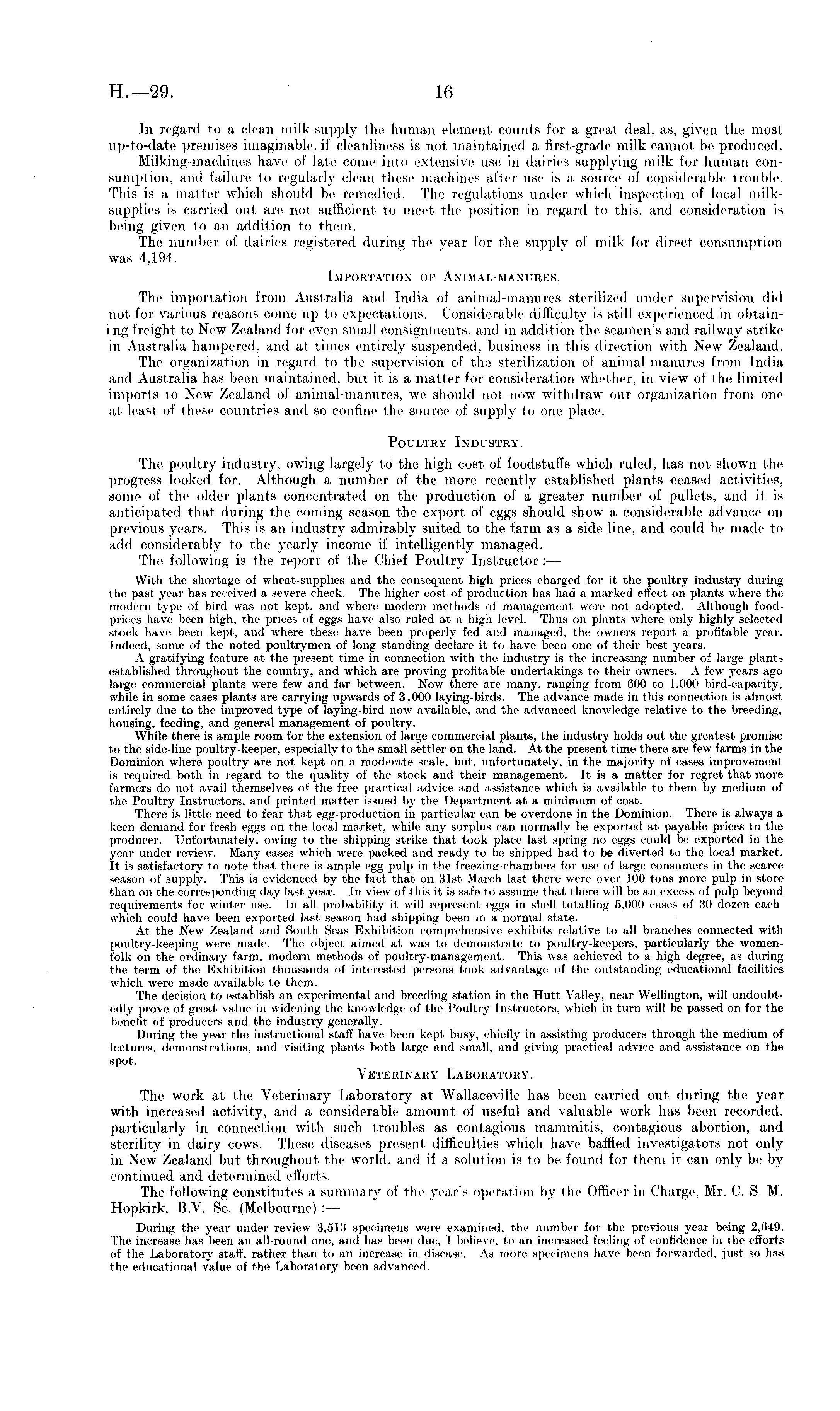 In regard to a clean milk-supply the human element counts for a great deal, as, given the most up-to-date premises imaginable, if cleanliness is not maintained a first-grade milk cannot be produced. Milking-machines have of late come into extensive vise in dairies supplying milk for human consumption, and failure to regularly clean these machines after use is a source of considerable trouble. This is a matter which should be remedied. The regulations under which inspection of local milksupplies is carried out are not sufficient to meet the position in regard to this, and consideration is being given to an addition to them. The number of dairies registered during the year for the supply of milk for direct consumption was 4,194. Importation of Animal-manures. The importation from Australia and India of animal-manures sterilized under supervision did not for various reasons come up to expectations. Considerable difficulty is still experienced in obtaining freight to New Zealand for even small consignments, and in addition the seamen's and railway strike in Australia hampered, and at times entirely suspended, business in this direction with New Zealand. The organization in regard to the supervision of the sterilization of animal-manures from India and Australia has been maintained, but it is a matter for consideration whether, in view of the limited imports to New Zealand of animal-manures, we should not now withdraw our organization from one at least of these countries and so confine the source of supply to one place. Poultry Industry. The poultry industry, owing largely to the high cost of foodstuffs which ruled, has not shown the progress looked for. Although a number of the more recently established plants ceased activities, some of the older plants concentrated on the production of a greater number of pullets, and it is anticipated that during the coming season the export of eggs should show a considerable advance on previous years. This is an industry admirably suited to the farm as a side line, and could be made to add considerably to the yearly income if intelligently managed. The following is the report of the Chief Poultry Instructor : — With the shortage of wheat-supplies and the consequent high prices charged for it the poultry industry during the past year has received a severe check. The higher cost of production has had a marked effect on plants where the modern type of bird was not kept, and where modern methods of management were not adopted. Although foodprices have been high, the prices of eggs have also ruled at a high level. Thus on plants where only highly selected stock have been kept, and where these have been properly fed and managed, the owners report a profitable year. Indeed, some of the noted poultrymen of long standing declare it to have been one of their best years. A gratifying feature at the present time in connection with the industry is the increasing number of large plants established throughout the country, and which are proving profitable undertakings to their owners. A few years ago large commercial plants were few and far between. Now there are many, ranging from 600 to 1,000 bird-capacity, while in some cases plants are carrying upwards of 3,000 laying-birds. The advance made in this connection is almost entirely due to the improved type of laying-bird now available, and the advanced knowledge relative to the breeding, housing, feeding, and general management of poultry. While there is ample room for the extension of large commercial plants, the industry holds out the greatest promise to the side-line poultry-keeper, especially to the small settler on the land. At the present time there are few farms in the Dominion where poultry are not kept on a moderate scale, but, unfortunately, in the majority of cases improvement is required both in regard to the quality of the stock and their management. It is a matter for regret that more farmers do not avail themselves of the free practical advice and assistance which is available to them by medium of the Poultry Instructors, and printed matter issued by the Department at a minimum of cost. There is little need to fear that egg-production in particular can be overdone in the Dominion. There is always a keen demand for fresh eggs on the local market, while any surplus can normally be exported at payable prices to the producer. Unfortunately, owing to the shipping strike that took place last spring no eggs could be exported in the year under review. Many cases which were packed and ready to be shipped had to be diverted to the local market. It is satisfactory to note that there is "ample egg-pulp in the freezing-chambers for use of large consumers in the scarce season of supply. This is evidenced by the fact that on 31st March last there were over 100 tons more pulp in store than on the corresponding day last year. In view of this it is safe to assume that there will be an excess of pulp beyond requirements for winter use. In all probability it will represent eggs in shell totalling 5,000 cases of 30 dozen each which could have been exported last season had shipping been m a normal state. At the New Zealand and South Seas Exhibition comprehensive exhibits relative to all branches connected with poultry-keeping were made. The object aimed at was to demonstrate to poultry-keepers, particularly the womenfolk on the ordinary farm, modern methods of poultry-management. This was achieved to a high degree, as during the term of the Exhibition thousands of interested persons took advantage of the outstanding educational facilities which were made available to them. The decision to establish an experimental and breeding station in the Hutt Valley, near Wellington, will undoubtedly prove of great value in widening the knowledge of the Poultry Instructors, which in turn will be passed on for the benefit of producers and the industry generally. During the year the instructional staff have been kept busy, chiefly in assis