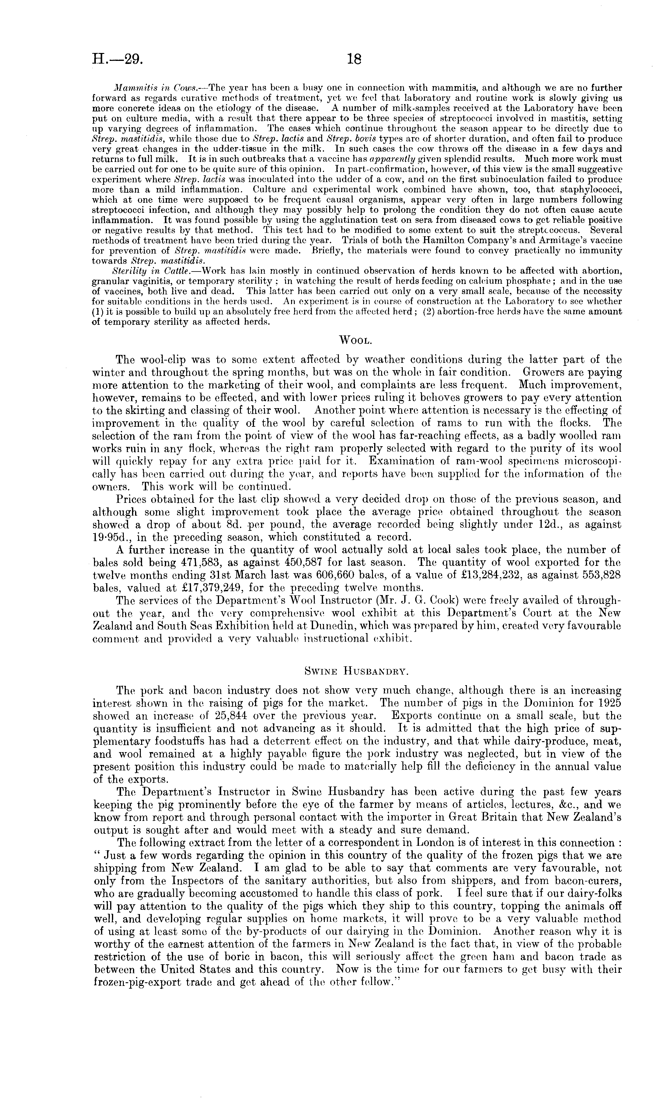 Mammitis in Cows.—The year has been a busy one in connection with mammitis, and although we are no further forward as regards curative methods of treatment, yet we feel that laboratory and routine work is slowly giving us more concrete ideas on the etiology of the disease. A number of milk-samples received at the Laboratory have been put on culture media, with a result that there appear to be three species of streptococci involved in mastitis, setting up varying degrees of inflammation. The cases which continue throughout the season appear to be directly due to Strep, mastitidis, while those due to Strep, laetis and Strep, bovis types are of shorter duration, and often fail to produce very great changes in the udder-tissue in the milk. In such cases the cow throws off the disease in a few days and returns to full milk. It is in such outbreaks that a vaccine has apparently given splendid results. Much more work must be carried out for one to be quite sure of this opinion. In part-confirmation, however, of this view is the small suggestive experiment where Strep, laetis was inoculated into the udder of a cow, and on the first subinoculation failed to produce more than a mild inflammation. Culture and experimental work combined have shown, too, that staphylococci, which at one time were supposed to be frequent causal organisms, appear very often in large numbers following streptococci infection, and although they may possibly help to prolong the condition they do not often cause acute inflammation. It was found possible by using the agglutination test on sera from diseased cows to get reliable positive or negative results by that method. This test had to be modified to some extent to suit the streptococcus. Several methods of treatment have been tried during the year. Trials of both the Hamilton Company's and Armitage's vaccine for prevention of Strep, mastitidis were made. Briefly, the materials were found to convey practically no immunity towards Strep, mastitidis. Sterility in Cattle. —Work has lain mostly in continued observation of herds known to be affected with abortion, granular vaginitis, or temporary sterility ; in watching the result of herds feeding on calcium phosphate; and in the use of vaccines, both live and dead. This latter has been carried out only on a very small scale, because of the necessity for suitable conditions in the herds used. An experiment is in course of construction at the Laboratory to see whether (1) it is possible to build up an absolutely free herd from the affected herd; (2) abortion-free herds have the same amount of temporary sterility as affected herds. Wool. The wool-clip was to some extent affected by weather conditions during the latter part of the winter and throughout the spring months, but was on the whole in fair condition. Growers are paying more attention to the marketing of their wool, and complaints are less frequent. Much improvement, however, remains to be effected, and with lower prices ruling it behoves growers to pay every attention to the skirting and classing of their wool. Another point where attention is necessary is the effecting of improvement in the quality of the wool by careful selection of rams to run with the flocks. The selection of the ram from the point of view of the wool has far-reaching effects, as a badly woolled ram works ruin in any flock, whereas the right ram properly selected with regard to the purity of its wool will quickly repay for any extra price paid for it. Examination of ram-wool specimens microscopically has been carried out during the year, and reports have been supplied for the information of the owners. This work will be continued. Prices obtained for the last clip showed a very decided drop on those of the previous season, and although some slight improvement took place the average price obtained throughout the season showed a drop of about Bd. per pound, the average recorded being slightly under 12d., as against 19-95 d., in the preceding season, which constituted a record. A further increase in the quantity of wool actually sold at local sales took place, the number of bales sold being 471,583, as against 450,587 for last season. The quantity of wool exported for the twelve months ending 31st March last was 606,660 bales, of a value of £13,284,232, as against 553,828 bales, valued at £17,379,249, for the preceding twelve months. The services of the Department's Wool Instructor (Mr. J. G. Cook) were freely availed of throughout the year, and the very comprehensive wool exhibit at this Department's Court at the New Zealand and South Seas Exhibition held at Dunedin, which was prepared by him, created very favourable comment and provided a very valuable instructional exhibit. Swine Husbandry. The pork and bacon industry does not show very much change, although there is an increasing interest shown in the raising of pigs for the market. The number of pigs in the Dominion for 1925 showed an increase of 25,844 over the previous year. Exports continue on a small scale, but the quantity is insufficient and not advancing as it should. It is admitted that the high price of supplementary foodstuffs has had a deterrent effect on the industry, and that while dairy-produce, meat, and wool remained at a highly payable figure the pork industry was neglected, but in view of the present position this industry could be made to materially help fill the deficiency in the annual value of the exports. The Department's Instructor in Swine Husbandry has been active during the past few years keeping the pig prominently before the eye of the farmer by means of articles, lectures, &c., and we know from report and through personal contact with the importer in Great Britain that New Zealand's output is sought after and would meet with a steady and sure demand. The following extract from the letter of a correspondent in London is of interest in this connection : " Just a few words regarding the opinion in this country of t