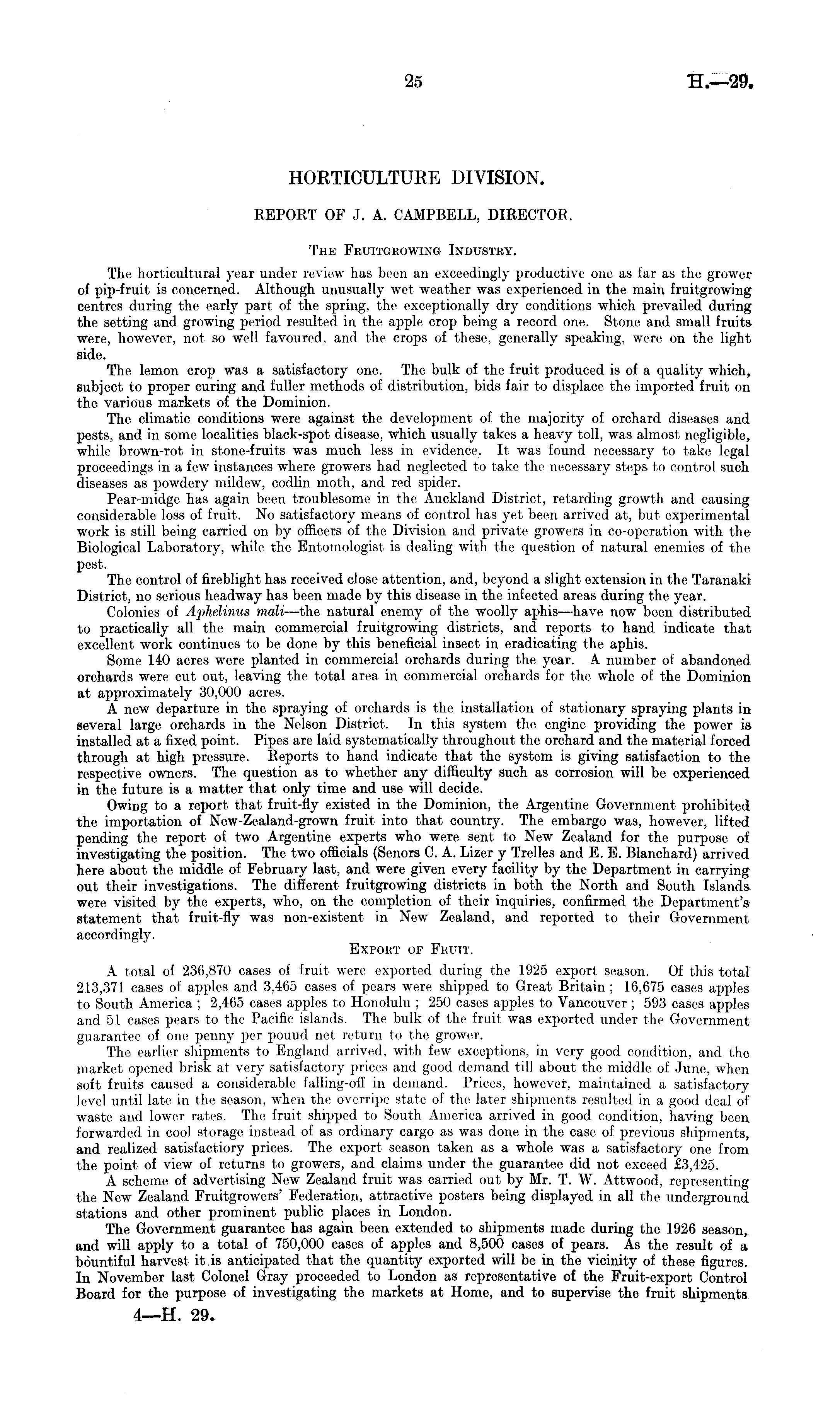 HORTICULTURE DIVISION. REPORT OF J. A. CAMPBELL, DIRECTOR. The Fruitgrowing Industry. The horticultural year under review has been an exceedingly productive one as far as the grower of pip-fruit is concerned. Although unusually wet weather was experienced in the main fruitgrowing centres during the early part of the spring, the exceptionally dry conditions which prevailed during the setting and growing period resulted in the apple crop being a record one. Stone and small fruits were, however, not so well favoured, and the crops of these, generally speaking, were on the light side. The lemon crop was a satisfactory one. The bulk of the fruit produced is of a quality which, subject to proper curing and fuller methods of distribution, bids fair to displace the imported fruit on the various markets of the Dominion. The climatic conditions were against the development of the majority of orchard diseases and pests, and in some localities black-spot disease, which usually takes a heavy toll, was almost negligible, while brown-rot in stone-fruits was much less in evidence. It was found necessary to take legal proceedings in a few instances where growers had neglected to take the necessary steps to control such diseases as powdery mildew, codlin moth, and red spider. Pear-midge has again been troublesome in the Auckland District, retarding growth and causing considerable loss of fruit. No satisfactory means of control has yet been arrived at, but experimental work is still being carried on by officers of the Division and private growers in co-operation with the Biological Laboratory, while the Entomologist is dealing with the question of natural enemies of the pest. The control of fireblight has received close attention, and, beyond a slight extension in the Taranaki District, no serious headway has been made by this disease in the infected areas during the year. Colonies of Aj)helinus mali —the natural enemy of the woolly aphis —have now been distributed to practically all the main commercial fruitgrowing districts, and reports to hand indicate that excellent work continues to be done by this beneficial insect in eradicating the aphis. Some 140 acres were planted in commercial orchards during the year. A number of abandoned orchards were cut out, leaving the total area in commercial orchards for the whole of the Dominion at approximately 30,000 acres. A new departure in the spraying of orchards is the installation of stationary spraying plants in several large orchards in the Nelson District. In this system the engine providing the power is installed at a fixed point. Pipes are laid systematically throughout the orchard and the material forced through at high pressure. Reports to hand indicate that the system is giving satisfaction to the respective owners. The question as to whether any difficulty such as corrosion will be experienced in the future is a matter that only time and use will decide. Owing to a report that fruit-fly existed in the Dominion, the Argentine Government prohibited the importation of New-Zealand-grown fruit into that country. The embargo was, however, lifted pending the report of two Argentine experts who were sent to New Zealand for the purpose of investigating the position. The two officials (Senors C. A. Lizer y Trelles and E. E. Blanchard) arrived here about the middle of February last, and were given every facility by the Department in carrying out their investigations. The different fruitgrowing districts in both the North and South Islanda were visited by the experts, who, on the completion of their inquiries, confirmed the Department's statement that fruit-fly was non-existent in New Zealand, and reported to their Government accordingly. Export of Fruit. A total of 236,870 cases of fruit were exported during the 1925 export season. Of this total 213,371 cases of apples and 3,465 cases of pears were shipped to Great Britain ; 16,675 cases apples to South America ; 2,465 cases apples to Honolulu ; 250 cases apples to Vancouver; 593 cases apples and 51 cases pears to the Pacific islands. The bulk of the fruit was exported under the Government guarantee of one penny per pouud net return to the grower. The earlier shipments to England arrived, with few exceptions, in very good condition, and the market opened brisk at very satisfactory prices and good demand till about the middle of June, when soft fruits caused a considerable falling-off in demand. Prices, however, maintained a satisfactory level until late in the season, when the overripe state of the later shipments resulted in a good deal of waste and lower rates. The fruit shipped to South America arrived in good condition, having been forwarded in cool storage instead of as ordinary cargo as was done in the case of previous shipments, and realized satisfactiory prices. The export season taken as a whole was a satisfactory one from the point of view of returns to growers, and claims under the guarantee did not exceed £3,425. A scheme, of advertising New Zealand fruit was carried out by Mr. T. W. Attwood, representing the New Zealand Fruitgrowers' Federation, attractive posters being displayed in all the underground stations and other prominent public places in London. The Government guarantee has again been extended to shipments made during the 1926 season, and will apply to a total of 750,000 cases of apples and 8,500 cases of pears. As the result of a bountiful harvest it is anticipated that the quantity exported will be in the vicinity of these figures. In November last Colonel Gray proceeded to London as representative of the Fruit-export Control Board for the purpose of investigating the markets at Home, and to supervise the fruit shipments
