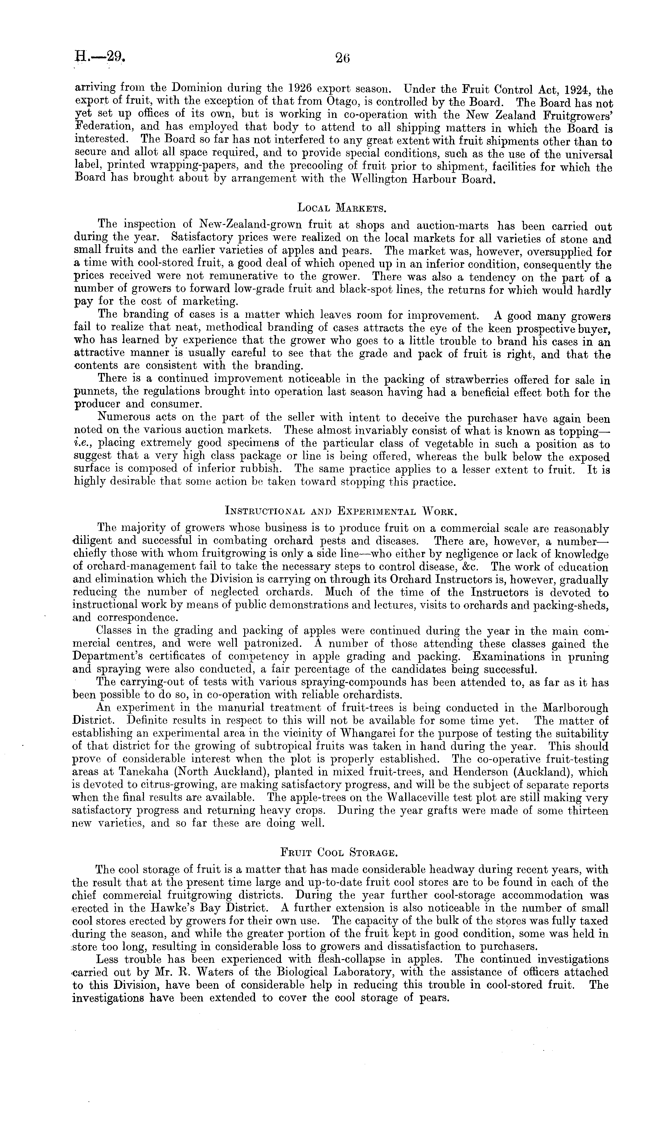 arriving from the Dominion during the 1926 export season. Under the Fruit Control Act, 1924, the export of fruit, with the exception of that from Otago, is controlled by the Board. The Board has not yet set up offices of its own, but is working in co-operation with the New Zealand Fruitgrowers' Federation, and has employed that body to attend to all shipping matters in which the Board is interested. The Board so far has not interfered to any great extent with fruit shipments other than to secure and allot all space required, and to provide special conditions, such as the use of the universal label, printed wrapping-papers, and the precooling of fruit prior to shipment, facilities for which the Board has brought about by arrangement with the Wellington Harbour Board. Local Markets. The inspection of New-Zealand-grown fruit at shops and auction-marts has been carried out during the year. Satisfactory prices were realized on the local markets for all varieties of stone and small fruits and the earlier varieties of apples and pears. The market was, however, oversupplied for a time with cool-stored fruit, a good deal of which opened up in an inferior condition, consequently the prices received were not remunerative to the grower. There was also a tendency on the part of a number of growers to forward low-grade fruit and black-spot lines, the returns for which would hardly pay for the cost of marketing. The branding of cases is a matter which leaves room for improvement. A good many growers fail to realize that neat, methodical branding of cases attracts the eye of the keen prospective buyer, who has learned by experience that the grower who goes to a little trouble to brand his cases in a.n attractive manner is usually careful to see that the grade and pack of fruit is right, and that the contents are consistent with the branding. There is a continued improvement noticeable in the packing of strawberries offered for sale in punnets, the regulations brought into operation last season having had a beneficial effect both for the producer and consumer. Numerous acts on the part of the seller with intent to deceive the purchaser have again been noted on the various auction markets. These almost invariably consist of what is known as topping— i.e., placing extremely good specimens of the particular class of vegetable in such a position as to suggest that a very high class package or line is being offered, whereas the bulk below the exposed surface is composed of inferior rubbish. The same practice applies to a lesser extent to fruit. It is highly desirable that some action be taken toward stopping this practice. Instructional and Experimental Work. The majority of growers whose business is to produce fruit on a commercial scale are reasonably ■diligent and successful in combating orchard pests and diseases. There are, however, a numberchiefly those with whom fruitgrowing is only a side line—who either by negligence or lack of knowledge of orchard-management fail to take the necessary steps to control disease, &c. The work of education and elimination which the Division is carrying on through its Orchard Instructors is, however, gradually reducing the number of neglected orchards. Much of the time of the Instructors is devoted to instructional work by means of public demonstrations and lectures, visits to orchards and packing-sheds, and correspondence. Classes in the grading and packing of apples were continued during the year in the main commercial centres, and were well patronized. A number of those attending these classes gained the Department's certificates of competency in apple grading and packing. Examinations in pruning and spraying were also conducted, a fair percentage of the candidates being successful. The carrying-out of tests with various spraying-compounds has been attended to, as far as it has been possible to do so, in co-operation with reliable orchardists. An experiment in the manurial treatment of fruit-trees is being conducted in the Marlborough District. Definite results in respect to this will not be available for some time yet. The matter of establishing an experimental area in the vicinity of Whangarei for the purpose of testing the suitability of that district for the growing of subtropical fruits was taken in hand during the year. This should prove of considerable interest when the plot is properly established. The co-operative fruit-testing areas at Tanekaha (North Auckland), planted in mixed fruit-trees, and Henderson (Auckland), which is devoted to citrus-growing, are making satisfactory progress, and will be the subject of separate reports when the final results are available. The apple-trees on the Wallaceville test plot are still making very satisfactory progress and returning heavy crops. During the year grafts were made of some thirteen new varieties, and so far these are doing well. Fruit Cool Storage. The cool storage of fruit is a matter that has made considerable headway during recent years, with the result that at the present time large and up-to-date fruit cool stores are to be found in each of the chief commercial fruitgrowing districts. During the year further cool-storage accommodation was «rected in the Hawke's Bay District. A further extension is also noticeable in the number of small cool stores erected by growers for their own use. The capacity of the bulk of the stores was fully taxed during the season, and while the greater portion of the fruit kept in good condition, some was held in ;store too long, resulting in considerable loss to growers and dissatisfaction to purchasers. Less trouble has been experienced with flesh-collapse in apples. The continued investigations carried out by Mr. R. Waters of the Biological Laboratory, with the assistance of officers attached to this Division, have been of considerable help in reducing this trouble in cool-stored fruit. The investigations have been extended to cover the cool storage of pears.