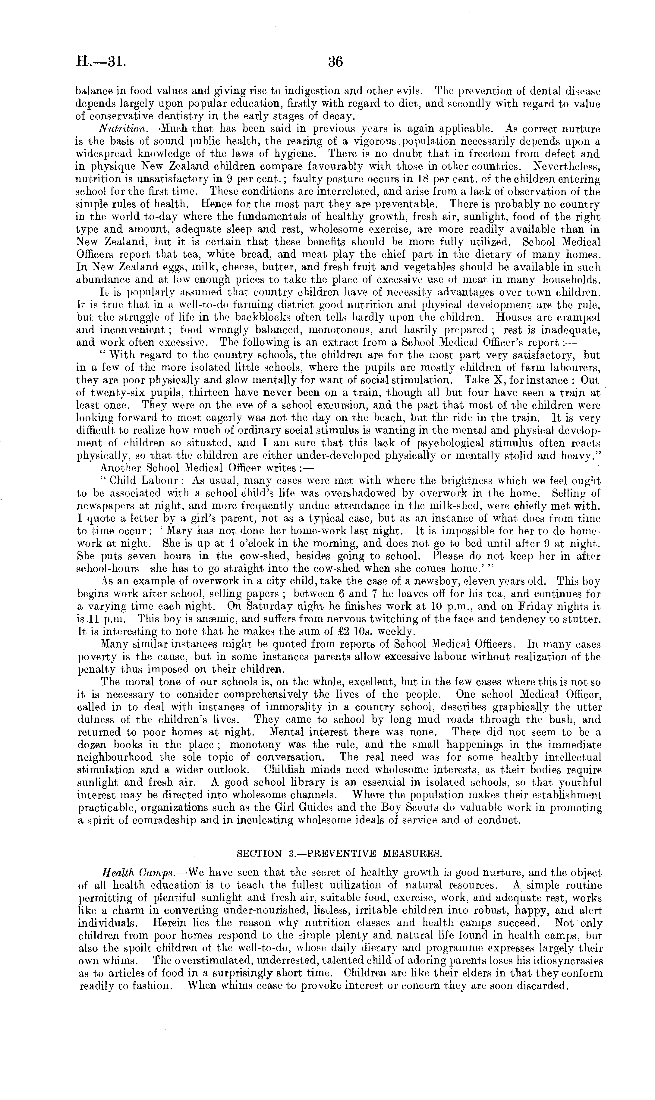 balance in food values and giving rise to indigestion and other evils. The prevention of dental disease depends largely upon popular education, firstly with regard to diet, and secondly with regard to value of conservative dentistry in the early stages of decay. Nutrition. —-Much that has been said in previous years is again applicable. As correct nurture is the basis of sound public health, the rearing of a vigorous population necessarily depends upon a widespread knowledge of the laws of hygiene. There is no doubt that in freedom from defect and in physique New Zealand children compare favourably with those in other countries. Nevertheless, nutrition is unsatisfactory in 9 per cent.; faulty posture occurs in 18 per cent, of the children entering school for the first time. These conditions are interrelated, and arise from a lack of observation of the simple rules of health. Hence for the most part they are preventable. There is probably no country in the world to-day where the fundamentals of healthy growth, fresh air, sunlight, food of the right type and amount, adequate sleep and rest, wholesome exercise, are more readily available than in New Zealand, but it is certain that these benefits should be more fully utilized. School Medical Officers report that tea, white bread, and meat play the chief part in the dietary of many homes. In New Zealand eggs, milk, cheese, butter, and fresh fruit and vegetables should be available in such abundance and at low enough prices to take the place of excessive use of meat in many households. It is popularly assumed that country children have of necessity advantages over town children. It is true that in a well-to-do farming district good nutrition and physical development are the rule, but the struggle of life in the backblocks often tells hardly upon the children. Houses are cramped and inconvenient; food wrongly balanced, monotonous, and hastily prepared ; rest is inadequate, and work often excessive. The following is an extract from a School Medical Officer's report:— " With regard to the country schools, the children are for the most part very satisfactory, but in a few of the more isolated little schools, where the pupils are mostly children of farm labourers, they are poor physically and slow mentally for want of social stimulation. Take X, for instance : Out of twenty-six pupils, thirteen have never been on a train, though all but four have seen a train at least once. They were on the eve of a school excursion, and the part that most of the children were looking forward to most eagerly was not the day on the beach, but the ride in the train. It is very difficult to realize how much of ordinary social stimulus is wanting in the mental and physical development of children so situated, and I am sure that this lack of psychological stimulus often reacts physically, so that the children are either under-developed physically or mentally stolid and heavy." Another School Medical Officer writes : — " Child Labour : As usual, many cases were met with where the brightness which we feel ought to be associated with a school-child's life was overshadowed by overwork in the home. Selling of newspapers at night, and more frequently undue attendance in the milk-shed, were chiefly met with. I quote a letter by a girl's parent, not as a typical case, but as an instance of what does from time to time occur : ' Mary has not done her home-work last night. It is impossible for her to do homework at night. She is up at 4 o'clock in the morning, and does not go to bed until after 9at night. She puts seven hours in the cow-shed, besides going to school. Please do not keep her in after school-hours —she has to go straight into the cow-shed when she comes home.' " As au example of overwork in a city child, take the case of a newsboy, eleven years old. This boy begins work after school, selling papers ; between 6 and 7 he leaves off for his tea, and continues for a varying time each night. On Saturday night he finishes work at 10 p.m., and on Friday nights it is 11 p.m. This boy is anaemic, and suffers from nervous twitching of the face and tendency to stutter. It is interesting to note that he makes the sum of £2 10s. weekly. Many similar instances might be quoted from reports of School Medical Officers. In many cases poverty is the cause, but in some instances parents allow excessive labour without realization of the penalty thus imposed on their children. The moral tone of our schools is, on the whole, excellent, but in the few cases where this is not so it is necessary to consider comprehensively the lives of the people. One school Medical Officer, called in to deal with instances of immorality in a country school, describes graphically the utter dulness of the children's lives. They came to school by long mud roads through the bush, and returned to poor homes at night. Mental interest there was none. There did not seem to be a dozen books in the place ; monotony was the rule, and the small happenings in the immediate neighbourhood the sole topic of conversation. The real need was for some healthy intellectual stimulation and a wider outlook. Childish minds need wholesome interests, as their bodies require sunlight and fresh air. A good school library is an essential in isolated schools, so that youthful interest may be directed into wholesome channels. Where the population makes their establishment practicable, organizations such as the Girl Guides and the Boy Scouts do valuable work in promoting a spirit of comradeship and in inculcating wholesome ideals of service and of conduct. SECTION 3.—PREVENTIVE MEASURES. Health Camps. —-We have seen that the secret of healthy growth is good nurture, and the object of all health education is to teach the fullest utilization of natural resources. A simple routine permitting of plentiful sunlight and fresh air, suitable food, exercise, work, and adequate rest, works like a charm in converting under-nourished, lis