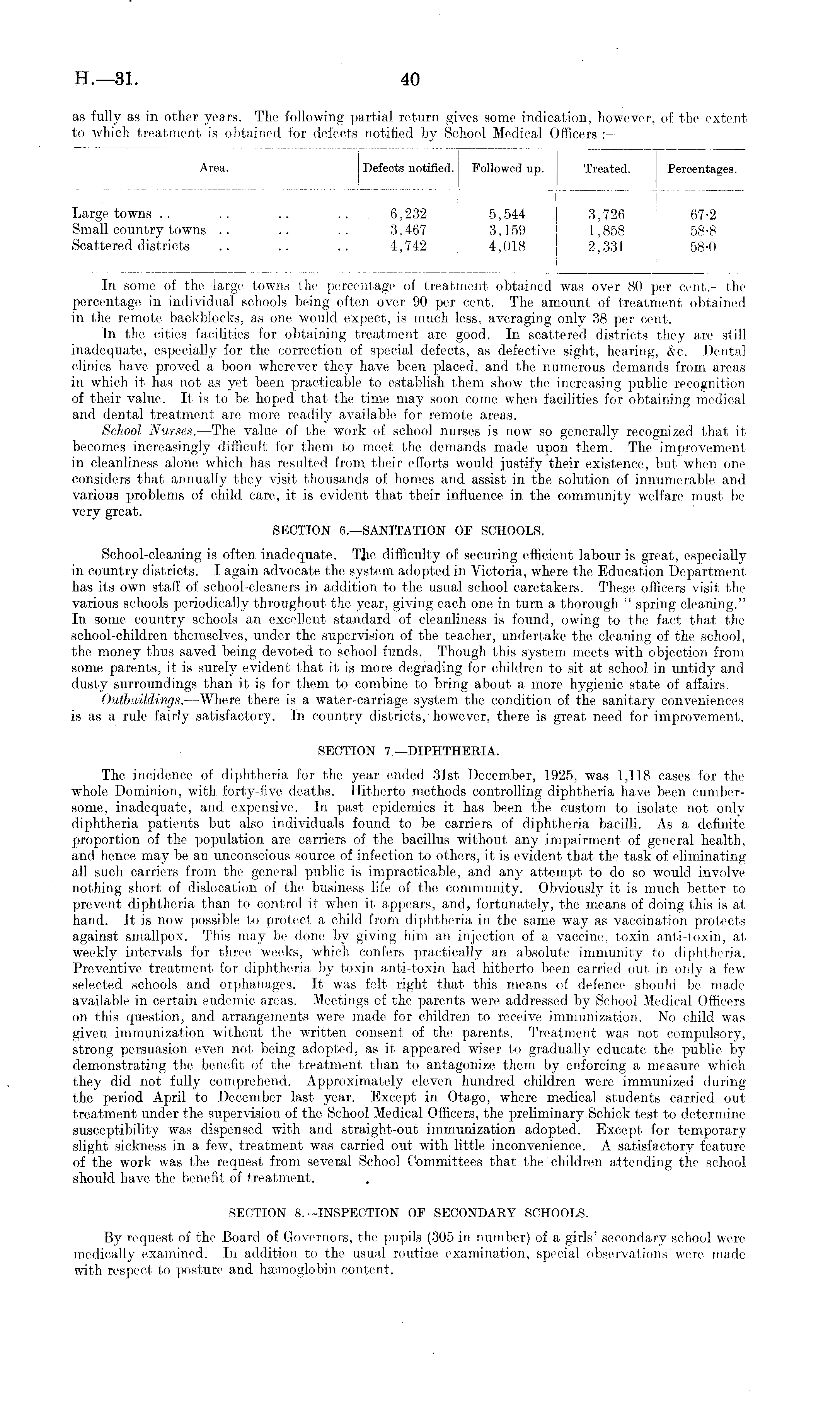 I Area. Defects notified. Followed up. Treated. Percentages. "'-I' I Large towns .. .. .. . . 6,232 5,544 3,726 67-2 Small country towns .. . . 3,467 3,159 1,858 58-8 Scattered districts .. .. .. 4,742 4,018 2,331 58-0