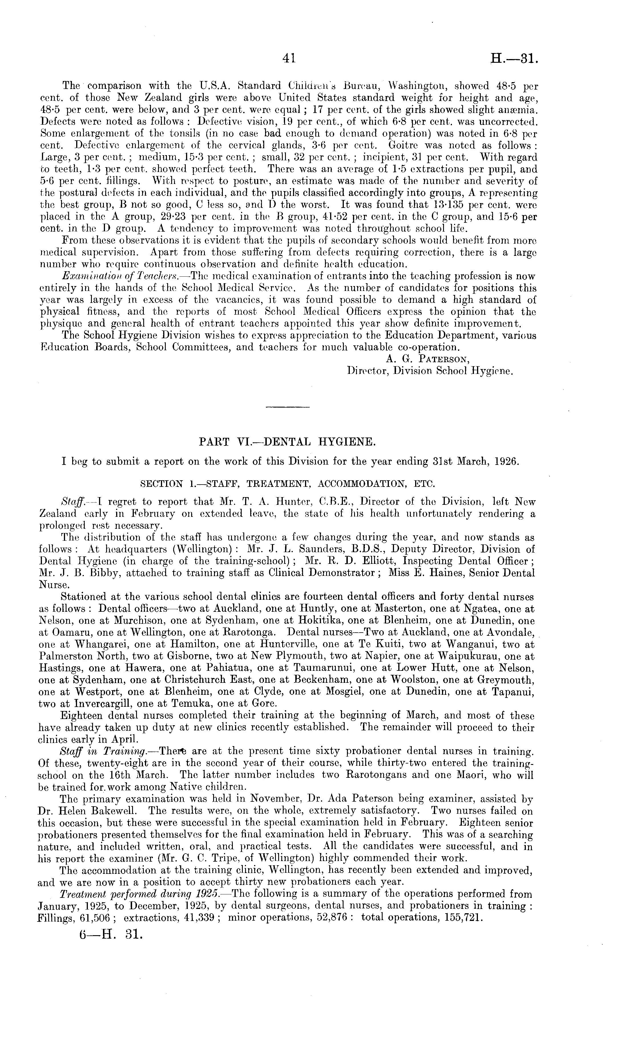 PART VI.—DENTAL HYGIENE. I beg to submit a report on the work of this Division for the year ending 31st March, 1926. SECTION I.—STAFF, TREATMENT, ACCOMMODATION, ETC. Staff. —I regret to report that Mr. T. A. Hunter, C.8.E., Director of the Division, left New Zealand early in February on extended leave, the state of his health unfortunately rendering a prolonged rest necessary. The distribution of the staff has undergone a few changes during the year, and now stands as follows : At headquarters (Wellington) : Mr. J. L. Saunders, 8.D.5., Deputy Director, Division of Dental Hygiene (in charge of the training-school) ; Mr. R. D. Elliott, Inspecting Dental Officer ; Mr. J. B. Bibby, attached to training staff as Clinical Demonstrator ; Miss E. Haines, Senior Dental Nurse. Stationed at the various school dental clinics are fourteen dental officers and forty dental nurses as follows : Dental officers —two at Auckland, one at Huntly, one at Masterton, one at Ngatea, one at Nelson, one at Murchison, one at Sydenham, one at Hokitika, one at Blenheim, one at Dunedin, one at Oamaru, one at Wellington, one at Rarotonga. Dental nurses—Two at Auckland, one at Avondale, one at Whangarei, one at Hamilton, one at Hunterville, one at Te Kuiti, two at Wanganui, two at Palmerston North, two at Gisborne, two at New Plymouth, two at Napier, one at Waipukurau, one at Hastings, one at Hawera, one at Pahiatua, one at Taumarunui, one at Lower Hutt, one at Nelson, one at Sydenham, one at Christchurch East, one at Beckenham, one at Woolston, one at Greymouth, one at Westport, one at Blenheim, one at Clyde, one at Mosgiel, one at Dunedin, one at Tapanui, two at Invercargill, one at Temuka, one at Gore. Eighteen dental nurses completed their training at the beginning of March, and most of these have already taken up duty at new clinics recently established. The remainder will proceed to their clinics early in April. Staff in Training. —Therfe are at the present time sixty probationer dental nurses in training. Of these, twenty-eight are in the second year of their course, while thirty-two entered the trainingschool on the 16th March. The latter number includes two Rarotongans and one Maori, who will be trained for.work among Native children. The primary examination was held in November, Dr. Ada Paterson being examiner, assisted by Dr. Helen Bakewell. The results were, on the whole, extremely satisfactory. Two nurses failed on this occasion, but these were successful in the special examination held in February. Eighteen senior probationers presented themselves for the final examination held in February. This was of a searching nature, and included written, oral, and practical tests. All the candidates were successful, and in his report the examiner (Mr. G. C. Tripe, of Wellington) highly commended their work. The accommodation at the training clinic, Wellington, has recently been extended and improved, and we are now in a position to accept thirty new probationers each year. Treatment performed during 1925. —The following is a summary of the operations performed from January, 1925, to December, 1925, by dental surgeons, dental nurses, and probationers in training : Fillings, 61,506 ; extractions, 41,339 ; minor operations, 52,876 : total operations, 155,721.