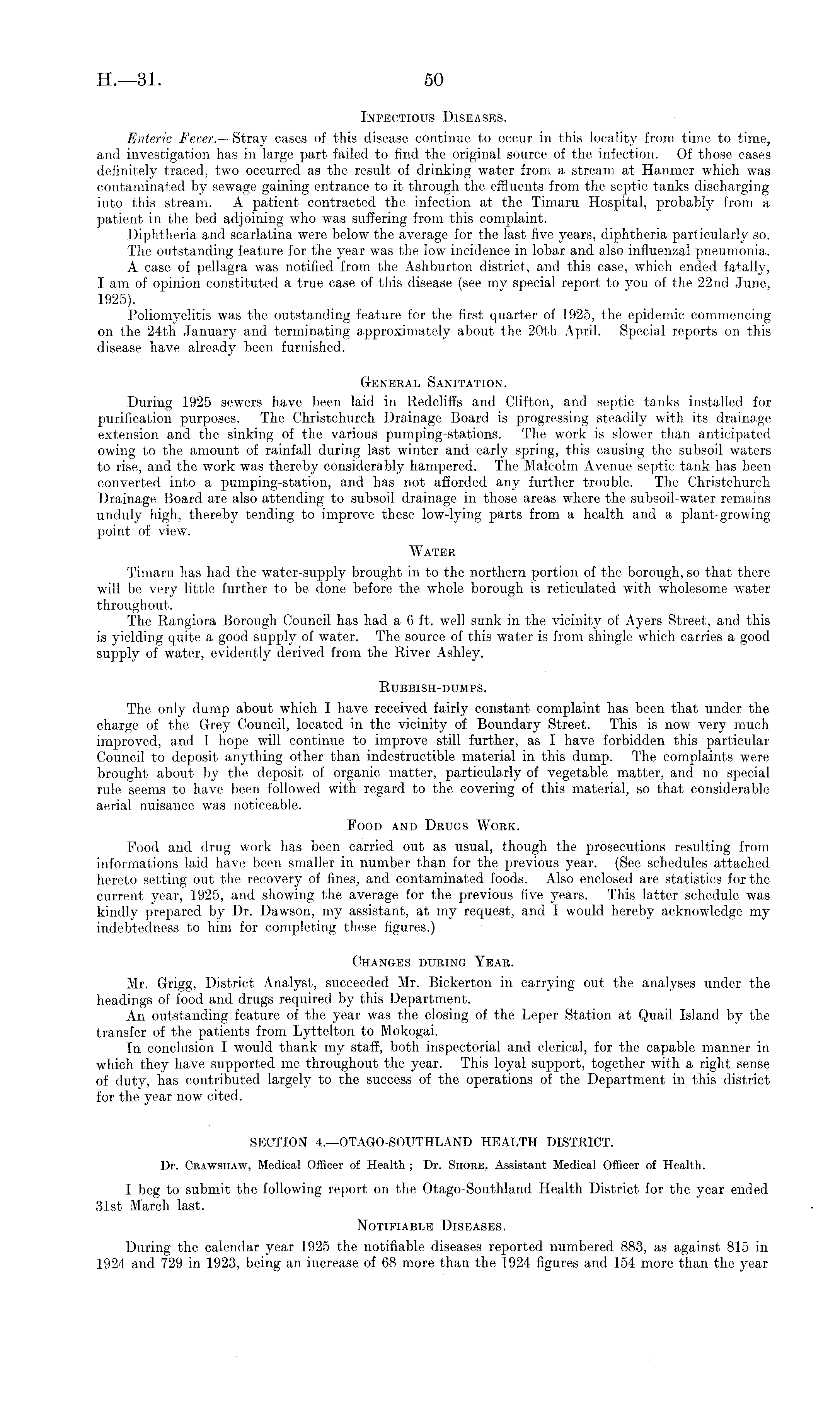 Infectious Diseases. Enteric Fever. —Stray cases of this disease continue to occur in this locality from time to time, and investigation has in large part failed to find the original source of the infection. Of those cases definitely traced, two occurred as the result of drinking water from a stream at Hanmer which was contaminated by sewage gaining entrance to it through the effluents from the septic tanks discharging into this stream. A patient contracted the infection at the Timaru Hospital, probably from a patient in the bed adjoining who was suffering from this complaint. Diphtheria and scarlatina were below the average for the last five years, diphtheria particularly so. The outstanding feature for the year was the low incidence in lobar and also influenzal pneumonia. A case of pellagra was notified from the Ashburton district, and this case, which ended fatally, I am of opinion constituted a true case of this disease (see mv special report to you of the 22nd June, 1925). Poliomyelitis was the outstanding feature for the first quarter of 1925, the epidemic commencing on the 24th January and terminating approximately about the 20th April. Special reports on this disease have already been furnished. General Sanitation. During 1925 sewers have been laid in Redcliffs and Clifton, and septic tanks installed for purification purposes. The Christchurch Drainage Board is progressing steadily with its drainage extension and the sinking of the various pumping-stations. The work is slower than anticipated owing to the amount of rainfall during last winter and early spring, this causing the subsoil waters to rise, and the work was thereby considerably hampered. The Malcolm Avenue septic tank has been converted into a pumping-station, and has not afforded any further trouble. The Christchurch Drainage Board are also attending to subsoil drainage in those areas where the subsoil-water remains unduly high, thereby tending to improve these low-lying parts from a health and a plant-growing point of view. Water Timaru has had the water-supply brought in to the northern portion of the borough, so that there will be very little further to be done before the. whole borough is reticulated with wholesome water throughout. The Rangiora Borough Council has had a 6 ft. well sunk in the vicinity of Ayers Street, and this is yielding quite a good supply of water. The source of this water is from shingle which carries a good supply of water, evidently derived from the River Ashley. Rubbish-dumps. The only dump about which I have received fairly constant complaint has been that under the charge of the Grey Council, located in the vicinity of Boundary Street. This is now very much improved, and I hope will continue to improve still further, as I have forbidden this particular Council to deposit anything other than indestructible material in this dump. The complaints were brought about by the deposit of organic matter, particularly of vegetable matter, and no special rule seems to have been followed with regard to the covering of this material, so that considerable aerial nuisance was noticeable. Food and Drugs Work. Food and drug work has been carried out as usual, though the prosecutions resulting from informations laid have been smaller in number than for the previous year. (See schedules attached hereto setting out the recovery of fines, and contaminated foods. Also enclosed are statistics for the current year, 1925, and showing the average for the previous five years. This latter schedule was kindly prepared by Dr. Dawson, my assistant, at my request, and I would hereby acknowledge my indebtedness to him for completing these figures.) Changes during Year. Mr. Grigg, District Analyst, succeeded Mr. Bickerton in carrying out the analyses under the headings of food and drugs required by this Department. An outstanding feature of the year was the closing of the Leper Station at Quail Island by the transfer of the patients from Lyttelton to Mokogai. In conclusion I would thank my staff, both inspectorial and clerical, for the capable manner in which they have supported me throughout the year. This loyal support, together with a right sense of duty, has contributed largely to the success of the operations of the Department in this district for the year now cited. SECTION 4.—OTAGO-SOUTHLAND HEALTH DISTRICT. Dr. Ceawshaw, Medical Officer of Health ; Dr. Shore, Assistant Medical Officer of Health. I beg to submit the following report on the Otago-Southland Health District for the year ended 31st March last. Notifiable Diseases. During the calendar year 1925 the notifiable diseases reported numbered 883, as against 815 in 1924 and 729 in 1923, being an increase of 68 more than the 1924 figures and 154 more than the year