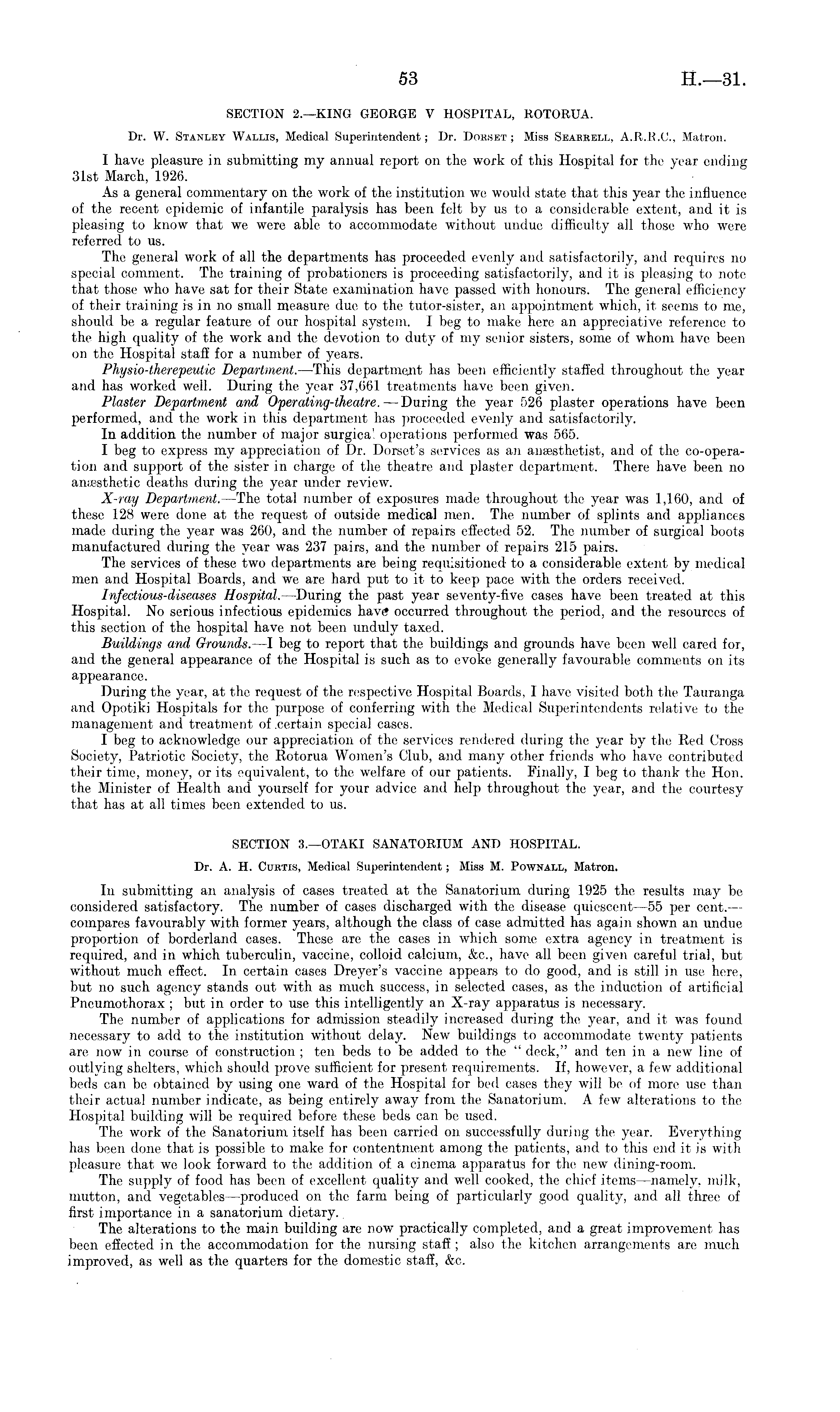 SECTION 2.—KING GEORGE V HOSPITAL, ROTORUA. Dr. W. Stanley Wallis, Medical Superintendent; Dr. Dorset ; Miss Searrell, A.R.R.C., Matron. I have pleasure in submitting my annual report on the work of this Hospital for the year ending 31st March, 1926. As a general commentary on the work of the institution we would state that this year the influence of the recent epidemic of infantile paralysis has been felt by us to a considerable extent, and it is pleasing to know that we were able to accommodate without undue difficulty all those who were referred to us. The general work of all the departments has proceeded evenly and satisfactorily, and requires no special comment. The training of probationers is proceeding satisfactorily, and it is pleasing to note that those who have sat for their State examination have passed with honours. The general efficiency of their training is in no small measure due to the tutor-sister, an appointment which, it seems to me, should be a regular feature of our hospital system. I beg to make here an appreciative reference to the high quality of the work and the devotion to duty of my senior sisters, some of whom have been on the Hospital staff for a number of years. Physio-therepeutic Department.—This department has been efficiently staffed throughout the year and has worked well. During the year 37,661 treatments have been given. Plaster Department and Operating-theatre. — During the year 526 plaster operations have been performed, and the work in this department has proceeded evenly and satisfactorily. In addition the number of major surgical operations performed was 565. I beg to express my appreciation of Dr. Dorset's services as an anaesthetist, and of the co-opera-tion and support of the sister in charge of the theatre and plaster department. There have been no antesthetic deaths during the year under review. X-ray Department.—The total number of exposures made throughout the year was 1,160, and of these 128 were done at the request of outside medical men. The number of splints and appliances made during the year was 260, and the number of repairs effected 52. The number of surgical boots manufactured during the year was 237 pairs, and the number of repairs 215 pairs. The services of these two departments are being requisitioned to a considerable extent by medical men and Hospital Boards, and we are hard put to it to keep pace with the orders received. Infectious-diseases Hospital. —During the past yea.r seventy-five cases have been treated at this Hospital. No serious infectious epidemics havtf occurred throughout the period, and the resources of this section of the hospital have not been unduly taxed. Buildings and Grounds. —I beg to report that the buildings and grounds have been well cared for, and the general appearance of the Hospital is such as to evoke generally favourable comments on its appearance. During the year, at the request of the respective Hospital Boards, I have visited both the Tauranga and Opotiki Hospitals for the purpose of conferring with the Medical Superintendents relative to the management and treatment of .certain special cases. I beg to acknowledge our appreciation of the services rendered during the year by the Red Cross Society, Patriotic Society, the Rotorua Women's Club, and many other friends who have contributed their time, money, or its equivalent, to the welfare of our patients. Finally, I beg to thank the Hon. the Minister of Health and yourself for your advice and help throughout the year, and the courtesy that has at all times been extended to us. SECTION 3.—OTAKI SANATORIUM AND HOSPITAL. Dr. A. H. Curtis, Medical Superintendent; Miss M. Pownall, Matron. In submitting an analysis of cases treated at the Sanatorium during 1925 the results may be considered satisfactory. The number of cases discharged with the disease quiescent —55 per cent.— compares favourably with former years, although the class of case admitted has again shown an undue proportion of borderland cases. These are the cases in which some extra agency in treatment is required, and in which tuberculin, vaccine, colloid calcium, &c., have all been given careful trial, but without much effect. In certain cases Dreyer's vaccine appears to do good, and is still in use here, but no such agency stands out with as much success, in selected cases, as the induction of artificial Pneumothorax ; but in order to use this intelligently an X-ray apparatus is necessary. The number of applications for admission steadily increased during the year, and it was found necessary to add to the institution without delay. New buildings to accommodate twenty patients are now in course of construction ; ten beds to be added to the " deck," and ten in a new line of outlying shelters, which should prove sufficient for present requirements. If, however, a few additional beds can be obtained by using one ward of the Hospital for bed cases they will be of more use than their actual number indicate, as being entirely away from the Sanatorium. A few alterations to the Hospital building will be required before these beds can be used. The work of the Sanatorium itself has been carried on successfully during the year. Everything has been done that is possible to make for contentment among the patients, and to this end it is with pleasure that we look forward to the addition of a cinema apparatus for the new dining-room. The supply of food has been of excellent quality and well cooked, the chief items —namely, milk, mutton, and vegetables —produced on the farm being of particularly good quality, and all three of first importance in a sanatorium dietary. The alterations to the main building are now practically completed, and a great improvement has been effected in the accommodation for the nursing staff ; also the kitchen arrangements are much improved, as well as the quarters for the domestic staff, &c.