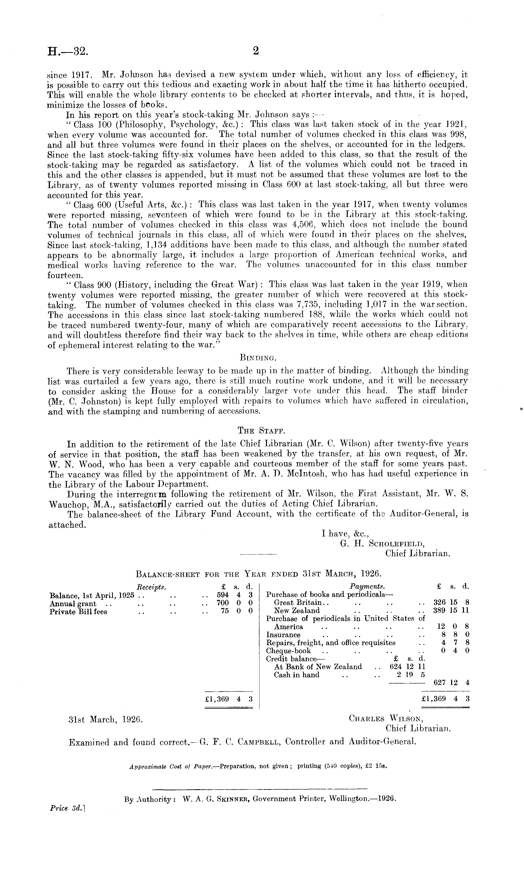 since 1917. Mr. Johnson has devised a new system under which, without any loss of efficiency, it is possible to carry out this tedious and exacting work in about half the time it has hitherto occupied. This will enable the whole library contents to be checked at shorter intervals, and thus, it is hoped, minimize the losses of books. In his report on this year's stock-taking Mr. Johnson says : — " Class 100 (Philosophy, Psychology, &c.) : This class was last taken stock of in the year 1921, when every volume was accounted for. The total number of volumes checked in this class was 998, and all but three volumes were found in their places on the shelves, or accounted for in the ledgers. Since the last stock-taking fifty-six volumes have been added to this class, so that the result of the stock-taking may be regarded as satisfactory. A list of the volumes which could not be traced in this and the other classes is appended, but it must not be assumed that these volumes are lost to the Library, as of twenty volumes reported missing in Class 600 at last stock-taking, all but three were accounted for this year. " Clasij 600 (Useful Arts, &c.) : This class was last taken in the year 1917, when twenty volumes were reported missing, seventeen of which were found to be in the Library at this stock-taking. The total number of volumes checked in this class was 4,506, which does not include the bound volumes of technical journals in this class, all of which were found in their places on the shelves. Since last stock-taking, 1,134 additions have been made to this class, and although the number stated appears to be abnormally large, it includes a large proportion of American technical works, and medical works having reference to the war. The volumes unaccounted for in this class number fourteen. " Class 900 (History, including the Great War) : This class was last taken in the year 1919, when twenty volumes were reported missing, the greater number of which were recovered at this stocktaking. The number of volumes checked in this class was 7,735, including 1,017 in the war section. The accessions in this class since last stock-taking numbered 188, while the works which could not be traced numbered twenty-four, many of which are comparatively recent accessions to the Library, and will doubtless therefore find their way back to the shelves in time, while others are cheap editions of ephemeral interest relating to the war." Binding. There is very considerable leeway to be made up in the matter of binding. Although the binding list was curtailed a few years ago, there is still much routine work undone, and it will be necessary to consider asking the House for a considerably larger vote under this head. The staff binder (Mr. C. Johnston) is kept fully employed with repairs to volumes which have suffered in circulation, and with the stamping and numbering of accessions. The Staff. In addition to the retirement of the late Chief Librarian (Mr. C. Wilson) after twenty-five years of service in that position, the staff has been weakened by the transfer, at his own request, of Mr. W. N. Wood, who has been a very capable and courteous member of the staff for some years past. The vacancy was filled by the appointment of Mr. A. D. Mcintosh, who has had useful experience in the Library of the Labour Department. During the interregnum following the retirement of Mr. Wilson, the First Assistant, Mr. W. S. Wauchop, M.A., satisfactorily carried out the duties of Acting Chief Librarian. The balance-sheet of the Library Fund Account, with the certificate of the Auditor-General, is attached. I have, &c., G. H. SCHOLEFIELD, Chief Librarian. Balance-sheet for the Year ended 31st March, 1926. Receipts. £ s. d. Payments. £ s. d. Balance, Ist April, 1925 .. .. .. 594 4 3 Purchase of books and periodicals— Annual grant .. .. .. • • 700 0 0 Great Britain.. .. .. .. 326 15 8 Private Bill fees .. • • • • 75 0 0 New Zealand .. .. .. 389 15 11 Purchase of periodicals in United States of America .. .. .. . ■ 12 0 8 Insurance .. .. .. . • 8 8 0 Repairs, freight, and office requisites . . 4 7 8 Cheque-book . . . . .. .. 0 4 0 Credit balance— £ s. d. At Bank of New Zealand . . 624 12 11 Cash in hand .. .. 2 19 5 627 12 4 £1,369 4 3 £1,369 4 3 31st March, 1926. Charles Wilson, Chief Librarian. Examined and found correct. —G. F. C. Campbell, Controller and Auditor-General.