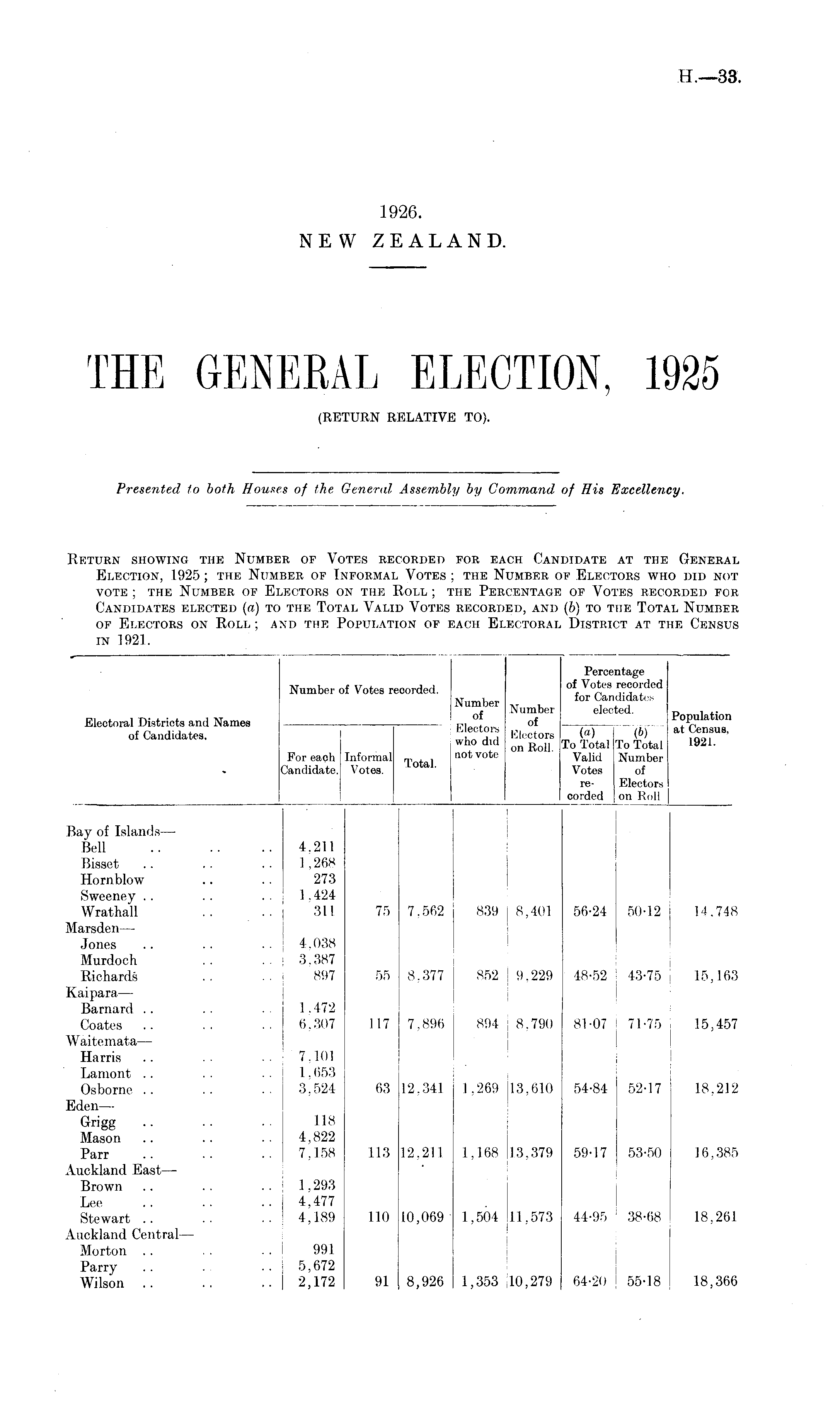 Return showing the Number of Votes recorded for each Candidate at the General Election, 1925; the Number of Informal Votes; the Number of Electors who did not vote; the Number of Electors on the Roll; the Percentage of Votes recorded for Candidates elected (a) to the Total Valid Votes recorded, and (b) to the Total Number of Electors on Roll; and the Population of each Electoral District at the Census in 1921.