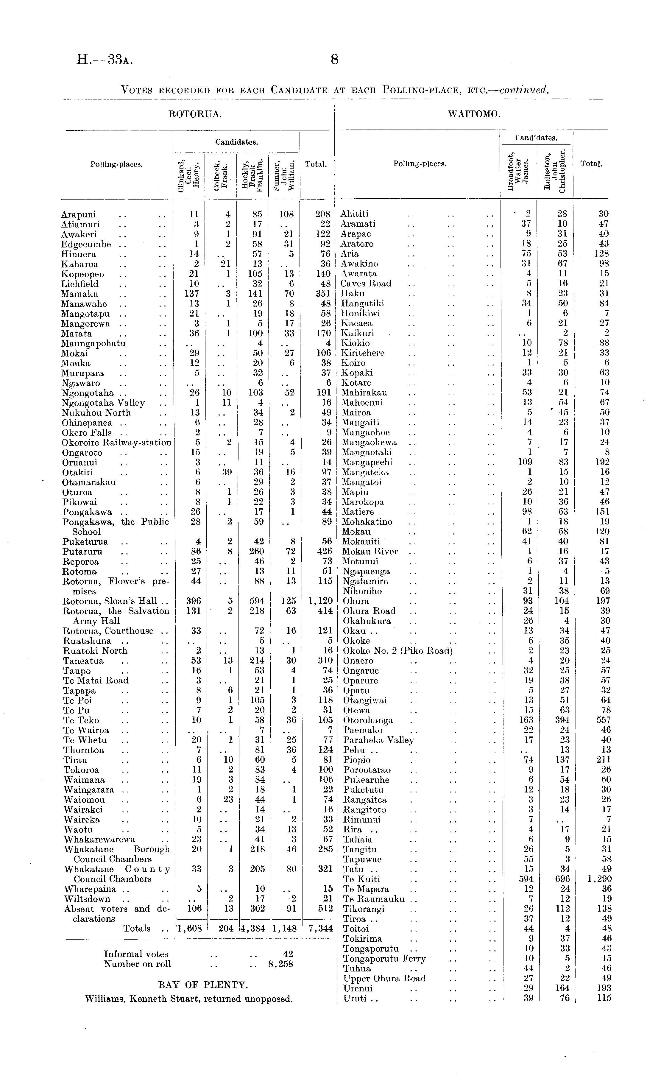 ROTORUA. WAITOMO. r, , Candidates. Candidates. •g _ pf jj Polling-places. ■gj" £ Km £3 £ g Total. Polling-places. «2§©' Sflft Total. *'3fe©d3g3e! F 3.il 'Scefl lo-3 SoJ °£ |2£g s B o OQ [? pq W g Arapuni .. .. 11 4 85 108 208 Ahititi .. - 2 28 30 Atiamuri . . .. 3 2 17 22 Aramati . . . . . . 37 10 47 Awakeri . . . . 9 1 91 21 122 Arapae . . . . 9 31 40 Edgecumbe .. .. 1 2 58 31 92 Aratoro . . . . . . 18 25 43 Hinuera . . .. 14 57 5 76 Aria . . .. . . 75 53 128 Kaharoa .. . . 2 21 13 36 Awakino . . . . . . 31 67 98 Kopeopeo .. .. 21 1 105 13 140 Awarata .. .. 4 11 15 Lichfield . . . . 10 32 6 48 Caves Road . . . . 5 16 21 Mamaku . . 137 3 141 70 351 Haku . . . . . 8 23 31 Manawahe . . . . 13 1 26 8 48 Hangatiki . . 34 50 84 Mangotapu . . .. 21 19 18 58 Honikiwi . . . . 1 6 7 Mangorewa . . .. 3 1 5 17 26 Kaeaea . . .. 6 21 27 Matata . . .. 36 1 100 33 170 Kaikuri ... . . . .. 2 2 Maungapohatu . . .. .. 4 4 Kiokio . . 10 78 88 Mokai . . .. 29 | 50 i 27 106 i Kiritehere . . . . . . 12 21 j 33 Mouka . . .. 12 20 6 38 Koiro . . . . . . 1 5 , 6 Murupara . . . . 5 | 32 .. 37 Kopaki . .. 33 30 ; 63 Ngawaro . . . . .. | 6 .. 6 Kotare . . . . . 4 6 j 10 Ngongotaha . . . . 26 10 ; 103 52 191 Mahirakau . . . . .. 53 21 74 Ngongotaha Valley . . 1 11 j 4 .. 16 Mahoenui . . . . 13 54 67 Nukuhou North .. 13 j 34 2 49 Mairoa .. . . 5 * 45 50 Ohinepanea .. . . 6 ! 28 .. 34 Mangaiti . . . . . . 14 23 37 Okere Falls .. .. 2..j 7.. 9 Mangaohoe . . . . . . 4 6 10 Okoroire Railway-station 5 2 15 4 26 Mangaokewa . . .. . . 7 17 24 Ongaroto . . .. 15 19 5 39 Mangaotaki . . . . . . 1 7 8 Oruanui . . . . 3 .. 11 .. 14 Mangapeehi . . . . . 109 83 192 Otakiri .. .. 6 39 36 16 97 Mangateka .. .. .. 1 15 16 Otamarakau .. 6 29 2 37 Mangatoi . . . . . . 2 10 12 Oturoa .. . . 8 1 26 3 38 Mapiu . . . 26 21 47 Pikowai .. . . 8 1 22 3 34 Marokopa .. . . . . 10 36 46 Pongakawa . . . . 26 17 1 44 Matiere . . . . . 98 53 151 Pongakawa, the Public 28 2 59 .. 89 Mohakatino . .. .. 1 18 19 School Mokau ■ . • . . . 62 58 120 Puketnrua . . . . 4 2 42 8 56 Mokauiti . . . . . . 41 40 81 Putaruru . . . . 86 8 260 72 426 Mokau River . . . . .. 1 16 17 Reporoa . . .. 25 46 2 73 Motunui . . , . . 6 37 43 Rotoma .. .. 27 13 11 51 Ngapaenga .. .. .. 1 4 5 Rotorua, Flower's pre- 44 .. 88 13 145 Ngatamiro .. .. .. 2 11 13 mises Nihoniho . . .. . . 31 38 j 69 Rotorua, Sloan's Hall .. 396 5 594 125 1,120 Ohura .. .. .. 93 104 197 Rotorua, the Salvation 131 2 218 63 414 Ohura Road .. . . . . 24 15 39 Army Hall Okahukura . . . . . . 26 4 30 Rotorua, Courthouse .. 33 .. 72 16 121 Okau .. . . . . 13 34 47 Ruatahuna .. . . .. .. 5 .. 5 Okoke . . . . . . 5 35 40 Ruatoki North .. 2 13 1 16 I Okoke No. 2 (Piko Road) .. 2 23 25 Taneatua .. .. 53 13 214 30 310 Onaero .. . . . . 4 20 24 Taupo • • 16 1 53 4 74 Ongarue . . . . .. 32 25 57 Te Matai Road .. 3 21 1 25 Oparure . . . 19 38 57 Tapapa .. .. 8 6 21 1 36 Opatu . . . . 5 27 32 TePoi .. .. 9 1 105 3 118 Otangiwai . .. 13 51 64 Te Pu .. . . 7 2 20 2 31 Otewa .. . 15 63 78 Te Teko .. .. 10 1 58 36 105 Otorohanga . . . 163 394 557 Te Wairoa .. .. .. .. 7 .. 7 Paemako .. . . 22 24 46 Te Whetu . . .. 20 1 31 25 77 Parabeka Valley . . 17 23 40 Thornton .. .. 7 81 36 124 Pehu .. . . .. 13 13 Tirau .. . . 6 10 60 5 81 Piopio . . . . . 74 137 211 Tokoroa . . .. 11 2 83 4 100 Porootarao . . . . .. 9 17 26 Waimana .. .. 19 3 84 106 Pukearuhe . . . . . . 6 54 60 Waingarara .. . . 1 2 18 1 22 Puketutu . . . . . . 12 18 30 Waiomou .. . . 6 23 44 1 74 Rangaitea . . . . .. 3 23 26 Wairakei . . . . 2 14 16 Rangitoto . . . . . . 3 14 17 Waireka .. . . 10 21 2 33 Rimunui . . . . .. 7 .. 7 Waotu .. .. 5 34 13 52 Rira .. .. . .. 4 17 21 Whakarewarewa . . 23 41 3 67 Tahaia . . . . . . 6 9 15 Whakatane Borough 20 1 218 46 285 Tangitu . . .. . . 26 5 31 Council Chambers Tapuwae . . .. .. 55 3 58 Whakatane County 33 3 205 80 321 Tatu .. .. .. .. 15 34 49 Council Chambers Te Kuiti . . .. . . 594 696 1,290 Wharepaina .. . . 5 10 15 Te Mapara . . . . . . 12 24 36 Wiltsdown .. .. .. 2 17 2 21 Te Raumauku .. . . .. 7 12 19 Absent voters and de- 106 13 302 91 512 Tikorangi . . . . . . 26 112 138 clarations Tiroa .. . . . . . 37 12 49 Totals .. 1,608 204 4,384 1,148 7,344 Toitoi .. .. .. 44 4 48 Tokirima . . . . .. 9 37 46 T . , , An Tongaporutu .. . . . . 10 33 43 Informal votes .. . 42 Ton|aporutu Ferry . . . . 10 5 15 Number on roll .. .. 8,258 Tuh „ a P ./ .. .. 44 2 46 A v T)T wATrrxr Upper Ohura Road .. .. 27 22 49 BAY 01 PLENTY. Urenui .. . . .. 29 164 193 Williams, Kenneth Stuart, returned unopposed. ] Uruti .. . . .. .. 39 76 115