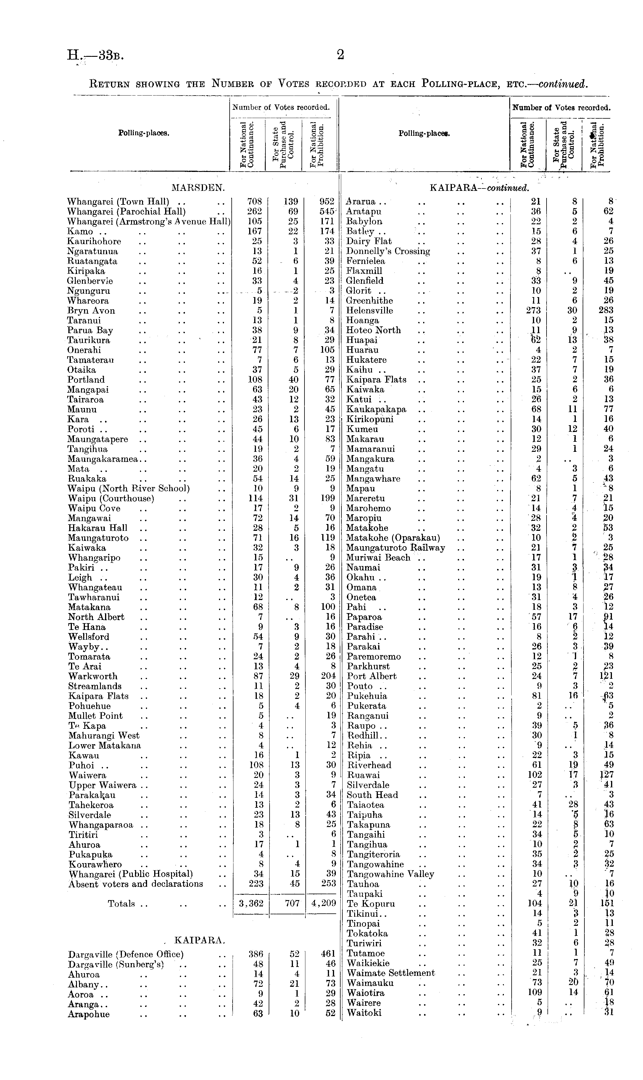 Number of Votes recorded. o aj "fl q Polling-plaoes. § a ~ go 2? § 2q § -g rtS fe 9 £ £3 b 2 O O " s o FRO Ah MARSDEN. Whangarei (Town Hall) .. .. 708 139 952 Whangarei (Parochial Hall) .. 262 69 545 Whangarei (Armstrong's Avenue Hall) 105 25 171 Kamo .. .. .. .. 167 22 174 Kaurihohore .. .. .. 25 3 33 Ngaratunua .. .. .. 13 1 21 Ruatangata .. .. .. 52 6 39 Kiripaka .. .. .. 16 1 25 Grlenbervie .. .. .. 33 4 23 Ngunguru .. .. ... 5 —2 3 Whareora .. .. .. 19 2 14 Bryn Avon .. .. .. 5 1 7 Taranui .. .. .. 13 1 8 Parua Bay .. .. .. 38 9 34 Taurikura .. .. .. 21 8 29 Onerahi .. .. .. 77 7 105 Tamaterau .. .. .. 7 6 13 Otaika .. .. .. 37 5 29 Portland .. .. .. 108 40 77 Mangapai .. .. .. 63 20 65 Tairaroa .. .. .. 43 12 32 Mannu .. .. .. 23 2 45 Kara .. .. .. .. 26 13 23 Poroti .. .. .. .. 45 6 17 Maungatapere .. .. .. 44 10 83 Tangihua .. .. .. 19 2 7 Maungakaramea.. .. .. 36 4 59 Mata .. .. .. .. 20 2 19 Ruakaka .. .. .. 54 14 25 Waipu (North River School) .. 10 9 9 Waipn (Courthouse) .. .. 114 31 199 Waipu Cove .. .. .. 17 2 9 Mangawai .. .. .. 72 14 70 Hakarau Hall .. .. .. 28 5 16 Maungaturoto .. .. .. 71 16 119 Kaiwaka .. .. .. 32 3 18 Whangaripo .. .. .. 15 .. 9 Pakiri .. .. .. .. 17 9 26 Leigh .. .. .. .. 30 4 36 Whangateau .. .. .. 11 2 31 Tawharanui .. .. .. 12 .. 3 Matakana .. .. .. 68 8 100 North Albert .. .. .. 7 .. 16 Te Hana .. .. .. 9 3 16 Wellsford . . .. .. 54 9 30 Wayby.. .. .. .. 7 2 18 Tomarata .. .. .. 24 2 26 Te Arai .. .. .. 13 4 8 Warkworth .. .. .. 87 29 204 Streamlands . . .. .. 11 2 30 Kaipara Flats .. .. .. 18 2 20 Pohuehue .. .. .. 5 4 6 Mullet Point .. .. .. 5 .. 19 T« Kapa .. .. .. 4 .. 3 Mahurangi West .. .. 8 .. 7 Lower Matakana .. .. 4 .. 12 Kawau .. .. .. 16 1 2 Puhoi .. .. .. .. 108 13 30 Waiwera .. .. .. 20 3 9 Upper Waiwera .. .. .. 24 3 7 .. .. .. 14 3 34 Tahekeroa .. .. .. 13 2 6 Silverdale .. .. .. 23 13 43 Whangaparaoa .. .. .. 18 8 25 Tiritiri .. .. .. 3 .. 6 Ahuroa .. .. .. 17 1 1 Pukapuka .. .. .. 4 .. 8 Kourawhero .. .. .. 8 4 9 Whangarei (Public Hospital) .. 34 15 39 Absent voters and declarations .. 223 45 253 Totals .. .. .. 3.362 707 4,209 . KAIPARA. Dargaville (Defence Office) .. 386 52 461 Dargaville (Sunberg's) .. .. 48 11 46 Ahuroa .. .. .. 14 4 11 Albany.. .. .. .. 72 21 73 Aoroa .. .. .. .. 9 1 29 Aranga.. .. .. .. 42 2 28 Arapohue .. .. .. 63 10 52