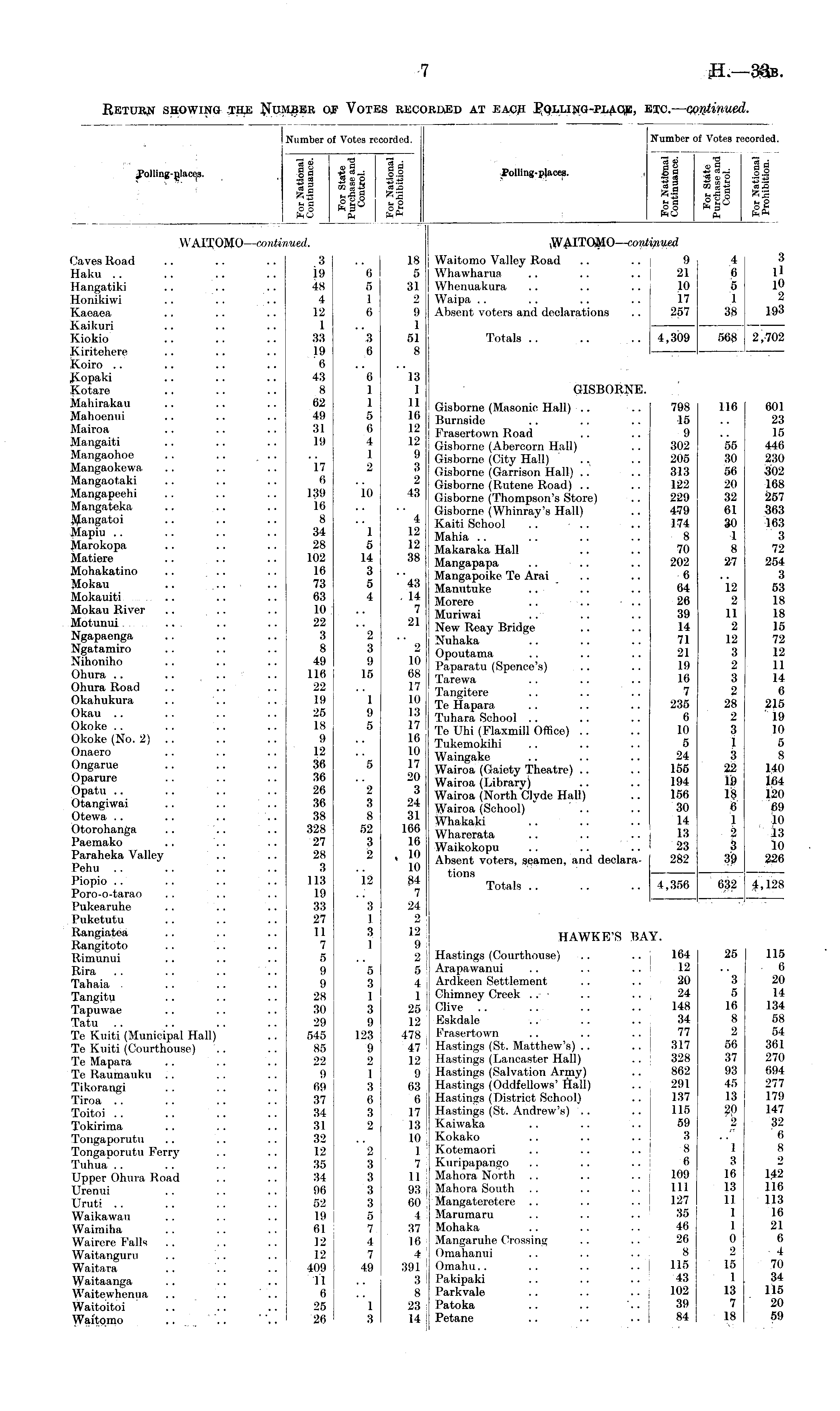Number of Votes recorded. Is |n Polling-places. .2 a -gg So x S-§ «S +3 *S •§ o ~ M fl r So M O O o 3 o * (1) W AITOMO—continued ; Waitomo Valley Road .. .. 9 4 I 3 Whawharua .. .. .. 21 6 j ll Whenuakura .. .. .. 10 |> l0 Waipa .. .. .. .. 17 1 Absent voters and declarations .. 257 38 193 Totals .. .. .. 4,309 568 2,702 GISBORNE. Gisborne (Masonic Hall) .. .. 798 116 601 Burnside .. .. .. 15 .. 23 Frasertown Road .. .. 9 .. 15 Gisborne (Abercorn Hall) .. 302 55 446 Gisborne (City Hall) . .. 205 30 230 Gisborne (Garrison Hall) .. .. 313 56 302 Gisborne (Rutene Road) .. .. 122 20 168 Gisborne (Thompson's Store) .. 229 32 257 Gisborne (Whinray's Hall) .. 479 61 363 Kaiti School .. .. .. 174 30 163 Mahia .. .. .. .. 8 1 3 Makaraka Hall .. .. 70 8 72 Mangapapa .. .. .. 202 27 254 Mangapoike Te Arai .. .. 6 .. 3 Manutuke .. .. .. 64 12 53 Morere .. .. • .. 26 2 18 Muriwai .. .. .. 39 11 18 New Reay Bridge .. .. 14 2 15 Nuhaka .. .. .. 71 12 72 Opoutama .. .. .. 21 3 12 Paparatu (Spence's) .. .. 19 2 11 Tarewa .. .. .. 16 3 14 Tangitere .. .. .. 7 2 6 TeHapara .. .. .. 235 28 215 Tuhara School .. .. .. 6 2 19 Te Uhi (Flaxmill Office) .. .. 10 3 10 Tukemokihi .. .. .. 5 1 5 Waingake .. .. .. 24 3 8 Wairoa (Gaiety Theatre) .. .. 155 22 140 Wairoa (Library) .. .. 194 19 164 ! Wairoa (North Clyde Hall) .. 156 18 120 Wairoa (School) .. .. 30 6 69 Whakaki .. .. .. 14 1 10 Wharerata .. .. .. 13 2 13 Waikokopu .. .. .. 23 3 10 ! Absent voters, seamen, and declara- 282 39 226 tions — — Totals .. .. .. 4,356 632 4,128 HAWKE'S BAY. Hastings (Courthouse) .. .. j 164 25 115 Arapawanui .. .. .. 12 .. 6 Ardkeen Settlement .. .. 20 3 20 ! Chimney Creek .. .. .. 24 5 14 Clive .. .. .. .. 148 16 134 Eskdale .. .. .. 34 8 58 Frasertown .. .. .. 77 2 54 Hastings (St. Matthew's) .. .. 317 56 361 Hastings (Lancaster Hall) .. 328 37 270 Hastings (Salvation Army) .. 862 93 694 Hastings (Oddfellows' Hall) .. 291 45 277 Hastings (District School) .. 137 13 179 j Hastings (St. Andrew's) .. .. 115 ££) 147 j Kaiwaka .. .. .. 59 2 32 Kokako .. .. .. 3 .. 6 Kotemaori .. .. .. 8 1 8 Kuripapango .. .. .. 6 3 2 Mahora North .. .. .. 109 16 1^2 Mahora South .. .. .. Ill 13 116 Mangateretere .. .. .. 127 11 113 Marumaru .. .. .. 35 1 16 Mohaka .. .. . . 46 1 21 | Mangaruhe Crossing .. .. 26 0 6 S Omahanui .. .. .. 8 2 4 I Omahu.. .. .. .. | 115 15 70 i Pakipaki .. .. .. 43 1 34 ; Parkvale .. .. .. j 102 13 115 I Patoka .. .. . 39 7 20 Petane .. .. .. I 84 18 | 59