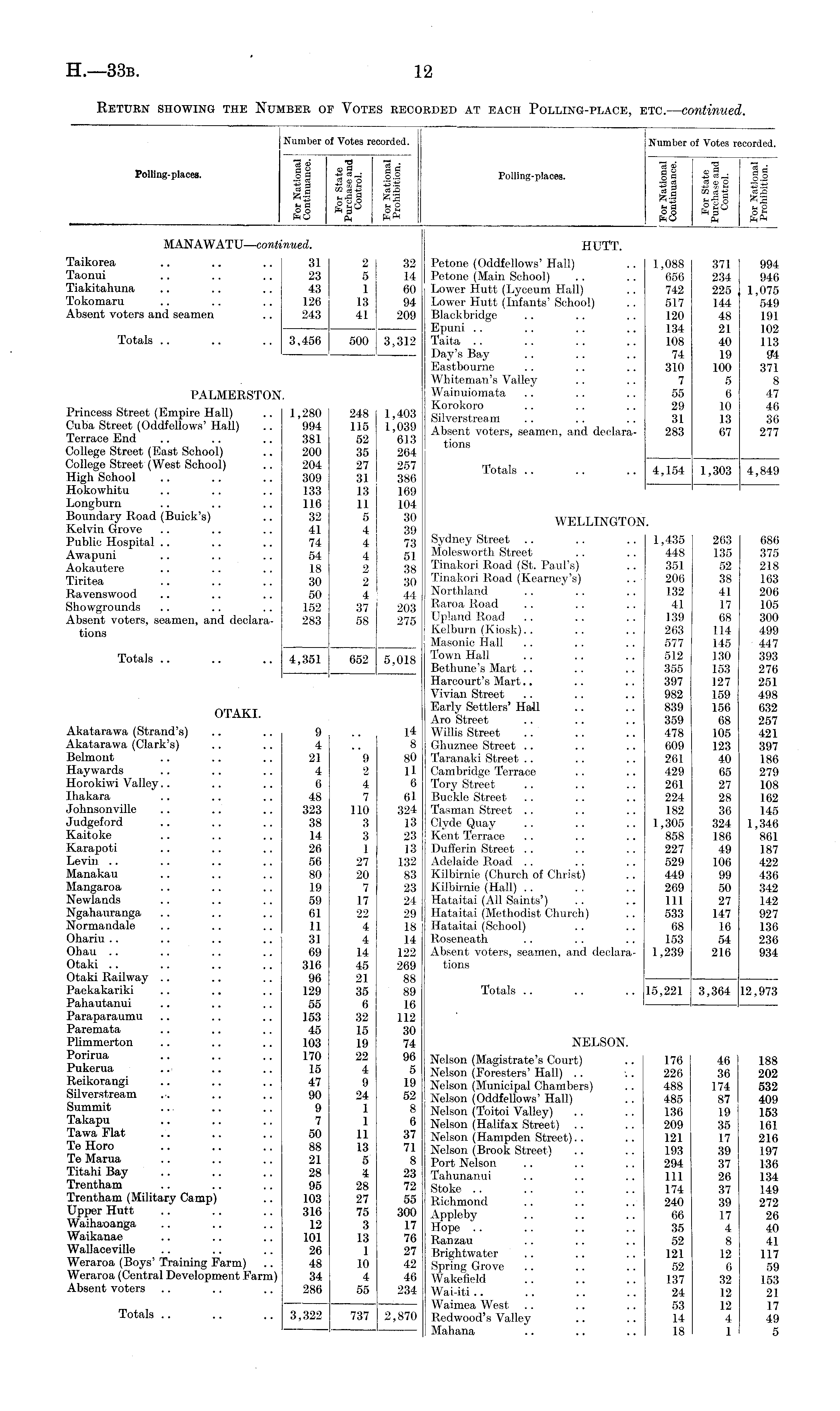 i Number of Votes recorded. T> US 1 qOQJC $H S3 Polling-places. o & go g g 2 53 it? d CC cs -e -Q fc| £■*§ *2 s§ gs PM P-l HUTT. Petone (Oddfellows'Hall) .. 1,088 371 994 Petone (Main School) .. .. 656 234 946 Lower Hutt (Lyceum Hall) .. 742 225 , 1,075 Lower Hutt (Infants' School) .. 517 144 549 Blackbridge .. .. .. 120 48 191 Epuni .. .. .. .. 134 21 102 Taita .. .. .. .. 108 40 113 Day's Bay .. .. .. 74 19 ?4 Eastbourne .. .. .. 310 100 371 Whiteman's Valley .. .. 7 5 8 Wainuiomata .. .. .. 55 6 47 Korokoro .. .. .. 29 10 46 Silverstream .. .. .. 31 13 36 Absent voters, seamen, and declara- 283 67 277 tions Totals .. .. .. 4,154 1,303 4,849 WELLINGTON. Sydney Street .. .. .. 1,435 263 686 Molesworth Street .. .. 448 135 375 Tinakori Road (St. Paul's) .. 351 52 218 Tinakori Road (Kearney's) .. 206 38 163 Northland .. .. .. 132 41 206 Raroa Road .. .. .. 41 17 105 Upland Road .. .. .. 139 68 300 Kelburn (Kiosk).. .. .. 263 114 499 Masonic Hall .. .. .. 577 145 447 Town Hall .. .. .. 512 130 393 Bethune's Mart .. .. .. 355 153 276 Harcourt's Mart.. .. .. 397 127 251 Vivian Street .. .. .. 982 159 498 Early Settlers' Hall .. .. 839 156 632 Aro Street .. .. .. 359 68 257 Willis Street .. .. .. 478 105 421 Ghuznee Street .. .. .. 609 123 397 Taranaki Street .. .. .. 261 40 186 Cambridge Terrace .. .. 429 65 279 Tory Street .. .. .. 261 27 108 Buckle Street .. .. .. 224 28 162 Tasman Street .. .. .. 182 36 145 Clyde Quay .. .. .. 1,305 324 1,346 Kent Terrace .. .. .. 858 186 861 Dufferin Street .. .. .. 227 49 187 Adelaide Road .. .. .. 529 106 422 Kilbirnie (Church of Christ) .. 449 99 436 Kilbirnie (Hall) .. . . .. 269 50 342 Hataitai (All Saints') .. .. Ill 27 142 Hataitai (Methodist Church) .. 533 147 927 Hataitai (School) .. .. 68 16 136 Roseneath .. .. .. 153 54 236 Absent voters, seamen, and declara- 1,239 216 934 tions Totals .. .. .. 15,221 3,364 12,973 NELSON. Nelson (Magistrate's Court) .. 176 46 188 Nelson (Foresters' Hall) .. •.. 226 36 202 Nelson (Municipal Chambers) .. 488 174 532 Nelson (Oddfellows' Hall) .. 485 87 409 Nelson (Toitoi Valley) .. .. 136 19 153 Nelson (Halifax Street) .. .. 209 35 161 Nelson (Hampden Street).. .. 121 17 216 Nelson (Brook Street) .. .. 193 39 197 Port Nelson .. .. .. 294 37 136 Tahunanui .. .. .. Ill 26 134 Stoke .. .. .. .. 174 37 149 Richmond .. .. .. 240 39 272 Appleby .. .. .. 66 17 26 Hope .. .. .. .. 35 4 40 Ranzau .. .. .. 52 8 41 Brightwater .. .. .. 121 12 117 Spring Grove .. .. .. 52 6 59 Wakefield .. .. .. 137 32 153 Wai-iti .. .. .. .. 24 12 21 Waimea West .. .. .. 53 12 17 Redwood's Valley *. i .. 14 4 49 Mahana .. .. .. 18 1 5