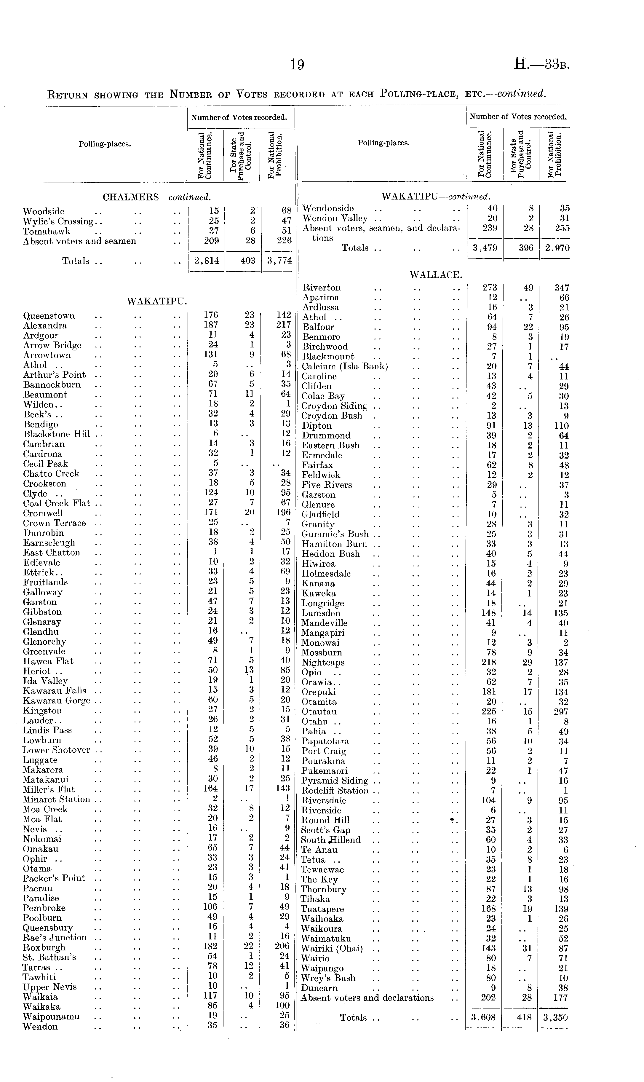 Number of Votes recorded. ! 8 o> a I fl Polling-places. §« "§ c8 '3 o-2 |g £ l-§ || 5a If3 gg *,g CHALMERS —continued. Woodside .. .. .. 15 2 68 Wylie's Crossing.. .. .. 25 2 47 Tomahawk . . .. .. 37 6 51 Absent voters and seamen .. 209 28 226 Totals .. .. ..2,814 403 3,774 WAKATIPU. Queenstown .. .. .. 176 23 142 Alexandra . . .. . . 187 23 217 Ardgour .. .. .. 11 4 23 Arrow Bridge .. . . . . 24 1 3 Arrowtown .. .. . • 131 9 68 Athol .. .. . • .. 5 .. 3 Arthur's Point .. .. . . 29 6 14 Bannockburn .. . . .. 67 5 35 Beaumont .. .. .. 71 1] 64 Wilden.. .. .. .. 18 2 1 Beck's .. .. .. .. 32 4 29 Bendigo .. • • • • 13 3 13 Blackstone Hill . . .. .. 6 .. 12 Cambrian . . . . • • 14 3 16 Cardrona . . . . . . 32 1 12 Cecil Peak . . . . .. 5 Chatto Creek .. . . .. 37 3 34 Crookston . . . . . . 18 5 28 Clyde .. 124 10 95 Coal Creek Flat . . . . •. 27 7 67 Cromwell .. . . • . 171 20 196 Crown Terrace . . . . .. 25 .. 7 Dunrobin .. .. • . 18 2 25 Earnscleugh .. .. .. 38 4 50 East Chatton .. . . - • 1 1 17 Edievale .. . . • • 10 2 32 Ettrick.. . . • • • • 33 4 69 Fruitlands .. .. .. 23 5 9 Galloway . . .. .. 21 5 23 Garston .. .. • • 47 7 13 Gibbston . . . . .. 24 3 12 Glenaray . . .... 21 2 10 Glendhu . . .. .. 16 .. 12 Glenorchy .. .. • • 49 7 18 Greenvale .... .. 8 1 9 Hawea Flat .. .. .. 71 5 40 Heriot .. .. •. • • i 50 13 85 Ida Valley .. . . .. 19 1 20 Kawarau Falls .. .. .. 15 3 12 Kawarau Gorge . . .. . . 60 5 20 Kingston .. . . . • 27 2 15 Lauder.. .. •. • . 26 2 31 Lindis Pass . . ■ . • • 12 5 5 Lowburn . . . . • . 52 5 38 Lower Shotover .. . . .. 39 10 15 Luggate . . .. • • 46 2 12 Makarora .. . . . . 8 2 11 Matakanui . . .. .. 30 2 25 Miller's Flat .. . . .. 164 17 143 Minaret Station .. . . .. 2 . . 1 Moa Creek .. .. .. 32 8 12 Moa Flat .. .. .. 20 2 7 Nevis .. .. .. • • 16 .. 9 Nokomai . . •. •. 17 2 2 Omakau .. .. .. 65 7 44 Ophir .. .. • • •. 33 3 24 Otama .. .. . . 23 3 41 Packer's Point .. . . . . 15 3 1 Paerau .. . . •. 20 4 18 Paradise .. .. • • 15 1 9 Pembroke .. . . • • 106 7 49 Poolburn .. .. .. 49 4 29 Queensbury .. . . . • 15 4 4 Rae's Junction .. .. . . 11 2 16 Roxburgh .. .. • • 182 22 206 St. Bathan's .. .. .. 54 1 24 Tarras .. .. • • • • 78 12 41 Tawhiti .. .. • • 10 2 5 Upper Nevis .. .. .. 10 .. 1 Waikaia .. .. • • 117 10 95 Waikaka .. .. . • 85 4 100 Waipounamu .. .. .. 19 .. 25 Wendon .. .. • • 35 .. 36