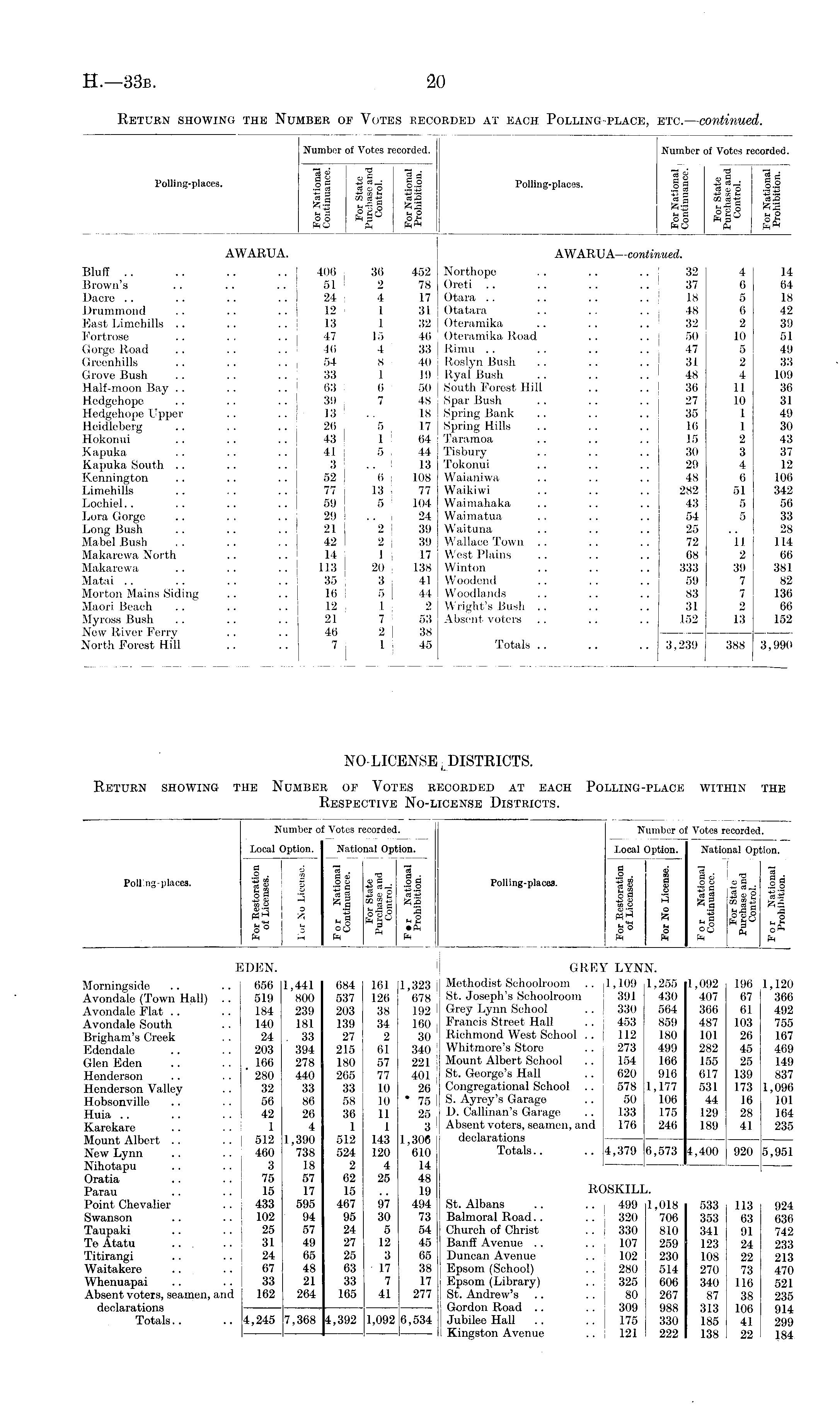 NO-LICENSE, DISTRICTS. Return showing the Number of Votes recorded at each Polling-place within the Respective No-license Districts.
