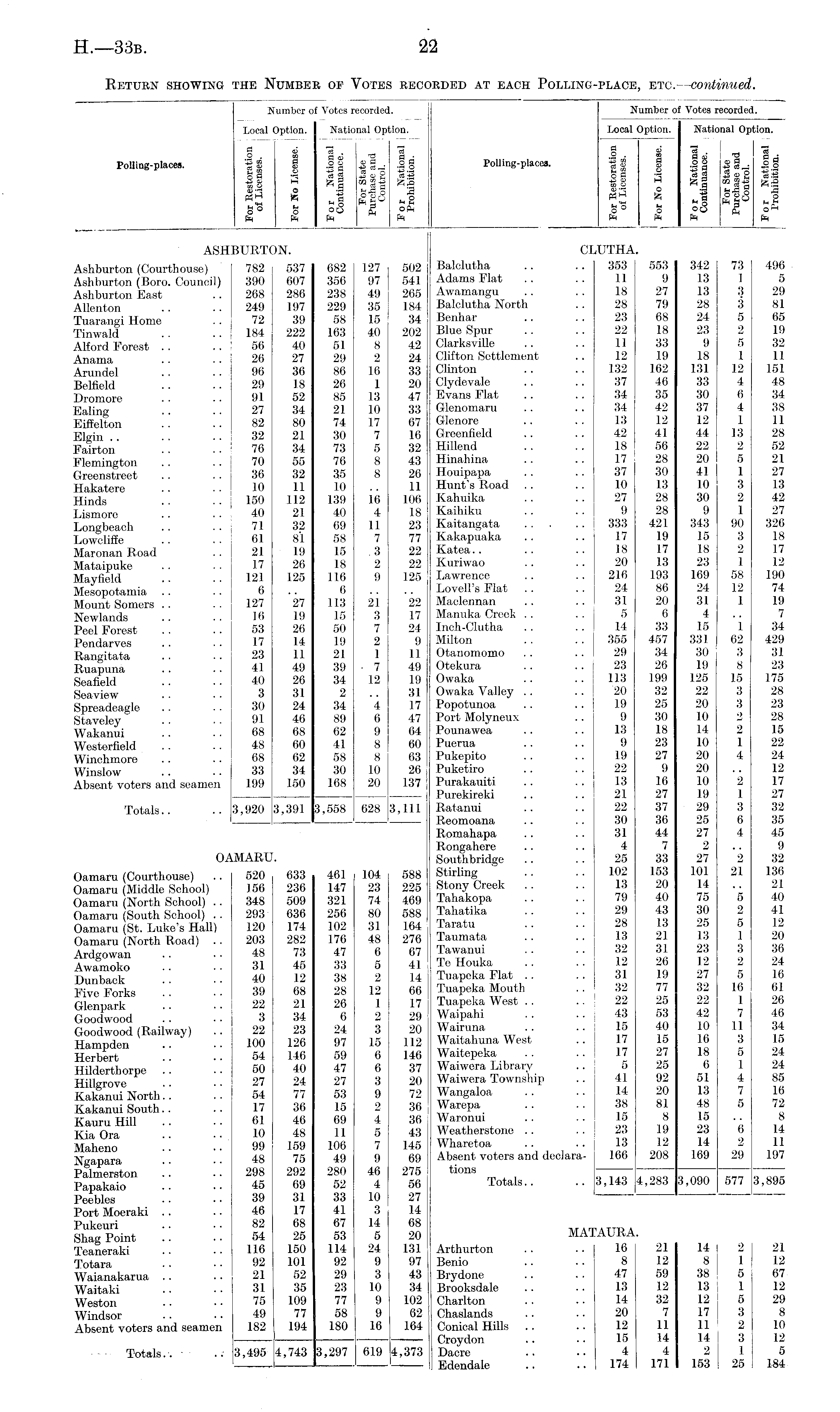 Number of Votes recorded. Local Option. National Option. S ® <& 1 .2 • 2 & V V ri Polling-places. ■§ 1 § |§ ■£§_;•§ § I 3 fc I leo o «M K g ft fH C go S 06 £ ©ft N PR PH ft ASHBURTON. Ashburton (Courthouse) 782 537 682 127 502 Ashburton (Boro. Council) 390 607 356 97 541 Ashburton East .. 268 286 238 49 265 Allenton .. . . 249 197 229 35 184 Tuarangi Home . . 72 39 58 15 34 Tinwald . . .. 184 222 163 40 202 Alford Forest .. . . 56 40 51 8 42 Anama .. . . 26 27 29 2 24 Arundel . . . • 96 36 86 16 33 Belfield .. .. 29 18 26 1 20 Dromore . . .. 91 52 85 13 47 Ealing .. . . 27 34 21 10 33 Eiffelton . . .. 82 80 74 17 67 Elgin .. . . . . 32 21 30 7 16 Fairton . . . . 76 34 73 5 32 Fleming ton . . . . 70 55 76 8 43 Greenstreet .. . . 36 32 35 8 26 Hakatere .. • • 10 11 10 . . 11 Hinds .. .. 150 112 139 16 106 Lismore . . • . 40 21 40 4 18 Longbeach .. . . 71 32 69 11 23 Loweliffe .. . . 61 81 58 7 77 Maronan Road . . 21 19 15 3 22 Mataipuke . . . • 17 26 18 2 22 Mayfield . . . . 121 125 116 9 125 Mesopotamia .. .. 6 .. 6 Mount Somers . . . . 127 27 113 21 22 Newlands .. . . 16 19 15 3 17 Peel Forest .. .. 53 26 50 7 24 Pendarves . . . . 17 14 19 2 9 Rangitata . . . • 23 11 21 1 11 Ruapuna . . . . 41 49 39 -7 49 Seafield . . .. 40 26 34 12 19 Seaview .. • • 3 31 2 31 Spreadeagle .. • • 30 24 34 4 17 Staveley .. . . 91 46 89 6 47 Wakanui . . . . 68 68 62 9 64 Westerfield . . . . 48 60 41 8 60 Winchmore . . . . 68 62 58 8 63 Winslow .. • • 33 34 30 10 26 Absent voters and seamen 199 150 168 20 137 Totals.. .. 3,920 3,391 3,558 628 3,111 OAMARU. Oamaru (Courthouse) .. 520 633 461 104 588 Oamaru (Middle School) 156 236 147 23 225 Oamaru (North School) .. 348 509 321 74 469 Oamaru (South School) . . 293 636 256 80 588 Oamaru (St. Luke's Hall) 120 174 102 31 164 Oamaru (North Road) . . 203 282 176 48 276 Ardgowan .. • • 48 73 47 6 67 Awamoko .. • ■ 31 45 33 5 41 Dunback . . • • 40 12 38 2 14 Five Forks . . • • 39 68 28 12 66 Glenpark .. • • 22 21 26 1 17 Goodwood . . • • 3 34 6 2 29 Goodwood (Railway) .. 22 23 24 3 20 Hampden .. • • 100 126 97 15 112 Herbert .. .. 54 146 59 6 146 Hilderthorpe . . .. 50 40 47 6 37 Hillgrove .. •. 27 24 27 3 20 Kakanui North.. .. 54 77 53 9 72 Kakanui South. . •• 17 36 15 2 36 Kauru Hill . . . • 61 46 69 4 36 KiaOra .. ..10 48 11 5 43 Maheno .. • • 99 159 106 7 145 Ngapara .. .• 48 75 49 9 69 Palmerston .. • • 298 292 280 46 275 Papakaio .. • • 45 69 52 4 56 Peebles • • • • 39 31 33 10 27 Port Moeraki . . • • 46 17 41 3 14 Pukeuri .. • • 82 68 67 14 68 Shag Point . • • • 54 25 53 5 20 Teaneraki .. • • 116 150 114 24 131 Totara .. .. 92 101 92 9 97 Waianakarua .. .. 21 52 29 3 43 Waitaki . • • • 31 35 23 10 34 Weston • • • • 75 109 77 9 102 Windsor .. •• 49 77 58 9 62 j Absent voters and seamen 182 194 180 16 164 Totals.. .. 3,495 4,743 3,297 619 4,373