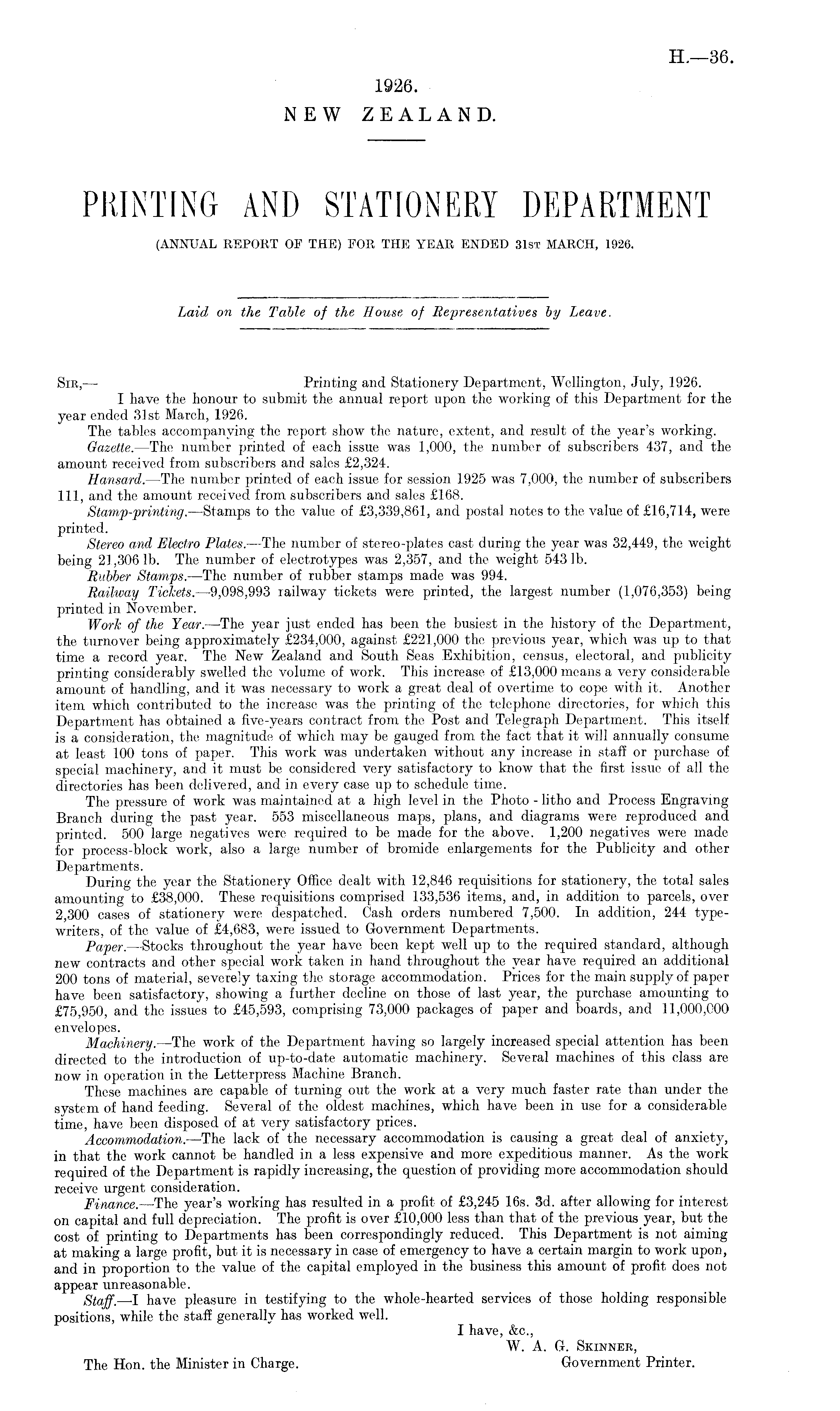 Sir, —• Printing and Stationery Department, Wellington, July, 1926. I have tie honour to submit the annual report upon the working of this Department for the year ended 31st March, 1926. The tables accompanying the report show the nature, extent, and result of the year's working. Gazette. —The number printed of each issue was 1,000, the number of subscribers 437, and the amount received from subscribers and sales £2,324. Hansard. —The number printed of each issue for session 1925 was 7,000, the number of subscribers 111, and the amount received from subscribers and sales £168. Stam.p-printing. —Stamps to the value of £3,339,861, and postal notes to the value of £16,714, were printed. Stereo and Electro Plates. —The number of stereo-plat.es cast during the year was 32,449, the weight being 21,306 lb. The number of electrotypes was 2,357, and the weight 543 lb. Rubber Stamps.—The number of rubber stamps made was 994. Railway Tickets. —9,098,993 railway tickets were printed, the largest number (1,076,353) being printed in November. Work of the Year. —The year just ended has been the busiest in the history of the Department, the turnover being approximately £234,000, against £221,000 the previous year, which was up to that time a record year. The New Zealand and South Seas Exhibition, census, electoral, and publicity printing considerably swelled the volume of work. This increase of £13,000 means a very considerable amount of handling, and it was necessary to work a great deal of overtime to cope with it. Another item which contributed to the increase was the printing of the telephone directories, for which this Department has obtained a five-years contract from the Post and Telegraph Department. This itself is a consideration, the magnitude of which may be gauged from the fact that it will annually consume at least 100 tons of paper. This work was undertaken without any increase in staff or purchase of special machinery, and it must be considered very satisfactory to know that the first issue of all the directories has been delivered, and in every case up to schedule time. The pressure of work was maintained at a high level in the Photo - litho and Process Engraving Branch during the past year. 553 miscellaneous maps, plans, and diagrams were reproduced and printed. 500 large negatives were required to be made for the above. 1,200 negatives were made for process-block work, also a large number of bromide enlargements for the Publicity and other Departments. During the year the Stationery Office dealt with 12,846 requisitions for stationery, the total sales amounting to £38,000. These requisitions comprised 133,536 items, and, in addition to parcels, over 2,300 cases of stationery were despatched. Cash orders numbered 7,500. In addition, 244 typewriters, of the value of £4,683, were issued to Government Departments. Paper. —Stocks throughout the year have been kept well up to the required standard, although new contracts and other special work taken in hand throughout the year have required an additional 200 tons of material, severely taxing the storage accommodation. Prices for the main supply of paper have been satisfactory, showing a further decline on those of last year, the purchase amounting to £75,950, and the issues to £45,593, comprising 73,000 packages of paper and boards, and 11,000,000 envelopes. Machinery.—The work of the Department having so largely increased special attention has been directed to the introduction of up-to-date automatic machinery. Several machines of this class are now in operation in the Letterpress Machine Branch. These machines are capable of turning out the work at a very much faster rate than under the system of hand feeding. Several of the oldest machines, which have been in use for a considerable time, have been disposed of at very satisfactory prices. Accommodation. —The lack of the necessary accommodation is causing a great deal of anxiety, in that the work cannot be handled in a less expensive and more expeditious manner. As the work required of the Department is rapidly increasing, the question of providing more accommodation should receive urgent consideration. Finance. —The year's working has resulted in a profit of £3,245 16s. 3d. after allowing for interest on capital and full depreciation. The profit is over £10,000 less than that of the previous year, but the cost of printing to Departments has been correspondingly reduced. This Department is not aiming at making a large profit, but it is necessary in case of emergency to have a certain margin to work upon, and in proportion to the value of the capital employed in the business this amount of profit does not appear unreasonable. Staff. —I have pleasure in testifying to the whole-hearted services of those holding responsible positions, while the staff generally has worked well. I have, &c., W. A. G. Skinner, The Hon. the Minister in Charge. Government Printer.