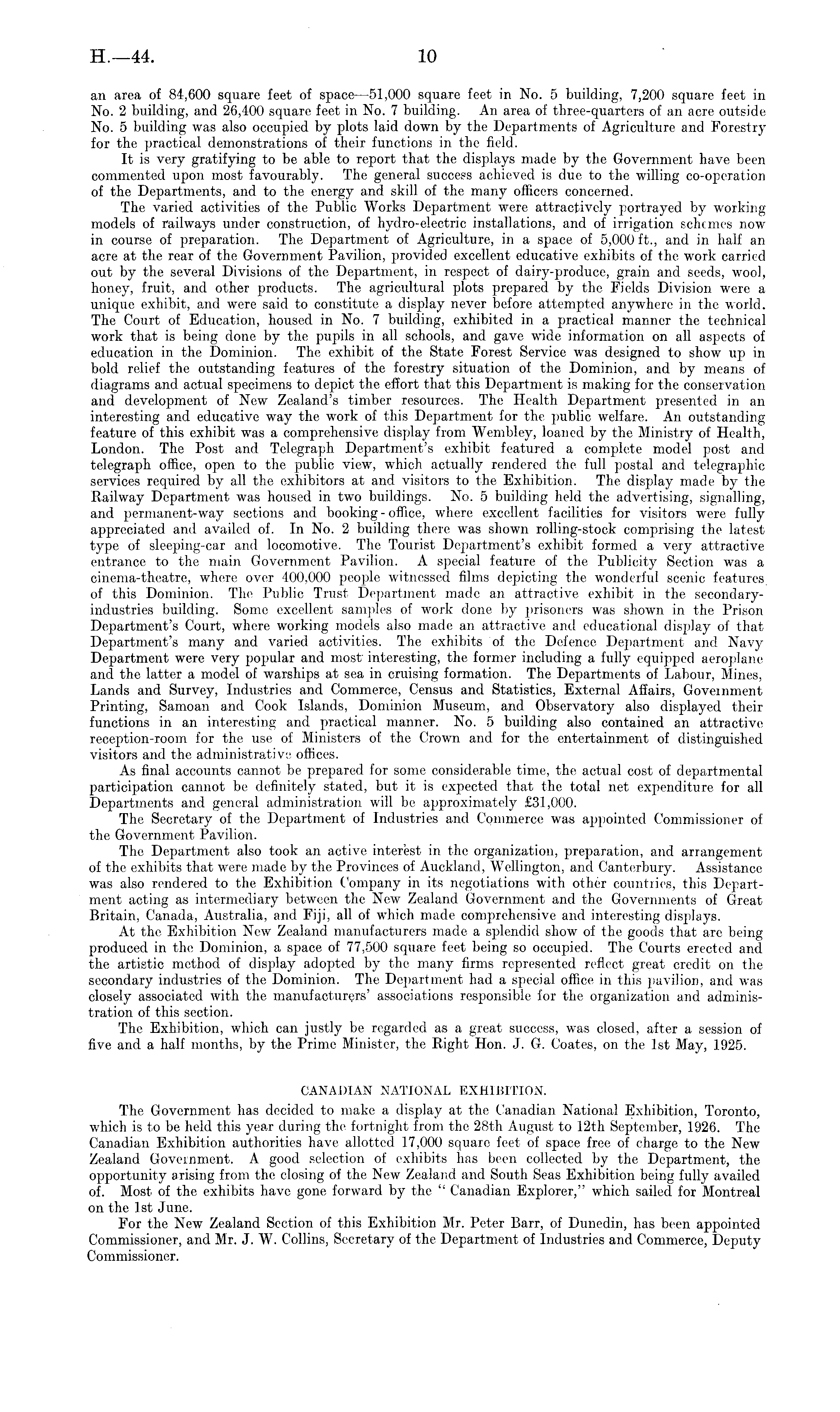 an area of 84,600 square feet of space —51,000 square feet in No. 5 building, 7,200 square feet in No. 2 building, and 26,400 square feet in No. 7 building. An area of three-quarters of an acre outside No. 5 building was also occupied by plots laid down by the Departments of Agriculture and Forestry for the practical demonstrations of their functions in the field. It is very gratifying to be able to report that the displays made by the Government have been commented upon most favourably. The general success achieved is due to the willing co-operation of the Departments, and to the energy and skill of the many officers concerned. The varied activities of the Public Works Department were attractively portrayed by workingmodels of railways under construction, of hydro-electric installations, and of irrigation schemes now in course of preparation. The Department of Agriculture, in a space of 5,000 ft., and in half an acre at the rear of the Government Pavilion, provided excellent educative exhibits of the work carried out by the several Divisions of the Department, in respect of dairy-produce, grain and seeds, wool, honey, fruit, and other products. The agricultural plots prepared by the Fields Division were a unique exhibit, and were said to constitute a display never before attempted anywhere in the world. The Court of Education, housed in No. 7 building, exhibited in a practical manner the technical work that is being done by the pupils in all schools, and gave wide information on all aspects of education in the Dominion. The exhibit of the State Forest Service was designed to show up in bold relief the outstanding features of the forestry situation of the Dominion, and by means of diagrams and actual specimens to depict the effort that this Department is making for the conservation and development of New Zealand's timber resources. The Health Department presented in an interesting and educative way the work of this Department for the public welfare. An outstanding feature of this exhibit was a comprehensive display from Wembley, loaned by the Ministry of Health, London. The Post and Telegraph Department's exhibit featured a complete model post and telegraph office, open to the public view, which actually rendered the full postal and telegraphic services required by all the exhibitors at and visitors to the Exhibition. The display made by the Railway Department was housed in two buildings. No. 5 building held the advertising, signalling, and permanent-way sections and booking - office, where excellent facilities for visitors were fully appreciated and availed of. In No. 2 building there was shown rolling-stock comprising the latest type of sleeping-car and locomotive. The Tourist Department's exhibit formed a very attractive entrance to the main Government Pavilion. A special feature of the Publicity Section was a cinema-theatre, where over 400,000 people witnessed films depicting the wonderful scenic features of this Dominion. The Public Trust Department made an attractive exhibit in the secondaryindustries building. Some excellent samples of work done by prisoners was shown in the Prison Department's Court, where working models also made an attractive and educational display of that Department's many and varied activities. The exhibits of the Defence Department and Navy Department were very popular and most' interesting, the former including a fully equipped aeroplane and the latter a model of warships at sea in cruising formation. The Departments of Labour, Mines, Lands and Survey, Industries and Commerce, Census and Statistics, External Affairs, Government Printing, Samoan and Cook Islands, Dominion Museum, and Observatory also displayed their functions in an interesting and practical manner. No. 5 building also contained an attractive reception-room for the use of Ministers of the Crown and for the entertainment of distinguished visitors and the administrative offices. As final accounts cannot be prepared for some considerable time, the actual cost of departmental participation cannot be definitely stated, but it is expected that the total net expenditure for all Departments and general administration will be approximately £31,000. The Secretary of the Department of Industries and Commerce was appointed Commissioner of the Government Pavilion. The Department also took an active interest in the organization, preparation, and arrangement of the exhibits that were made by the Provinces of Auckland, Wellington, and Canterbury. Assistance was also rendered to the Exhibition Company in its negotiations with other countries, this Department acting as intermediary between the New Zealand Government and the Governments of Great Britain, Canada, Australia, and Fiji, all of which made comprehensive and interesting displays. At the Exhibition New Zealand manufacturers made a splendid show of the goods that are being produced in the Dominion, a space of 77,500 square feet being so occupied. The Courts erected and the artistic method of display adopted by the many firms represented reflect great credit on the secondary industries of the Dominion. The Department had a special office in this pavilion, and was closely associated with the manufacturers' associations responsible for the organization and administration of this section. The Exhibition, which can justly be regarded as a great success, was closed, after a session of five and a half months, by the Prime Minister, the Right Hon. J. G. Coates, on the Ist May, 1925. CANADIAN NATIONAL EXHIBITION. The Government has decided to make a display at the Canadian National Exhibition, Toronto, which is to be held this year during the fortnight from the 28th August to 12th September, 1926. The Canadian Exhibition authorities have allotted 17,000 square feet of space free of charge to the New Zealand Government. A good selection of exhibits has been collected by the Department, the opportunity arising from the closing of the New Zealand and South Seas
