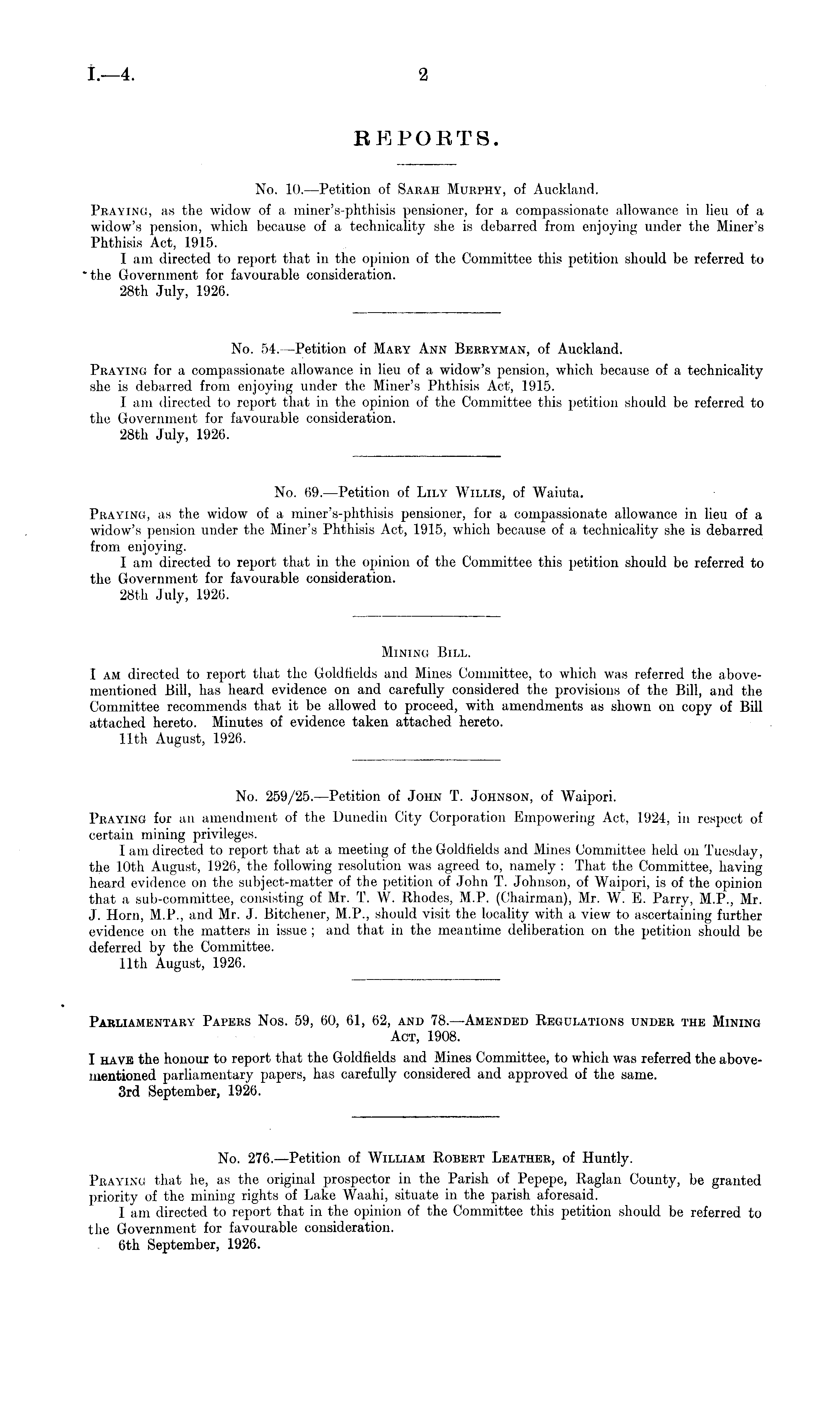REPORTS. No. 10. —Petition of Sarah Murphy, of Auckland. Praying, as the widow of a miner's-phthisis pensioner, for a compassionate allowance in lieu of a widow's pension, which because of a technicality she is debarred from enjoying under the Miner's Phthisis Act, 1915. I am directed to report that in the opinion of the Committee this petition should be referred to the Government for favourable consideration. 28th July, 1926.