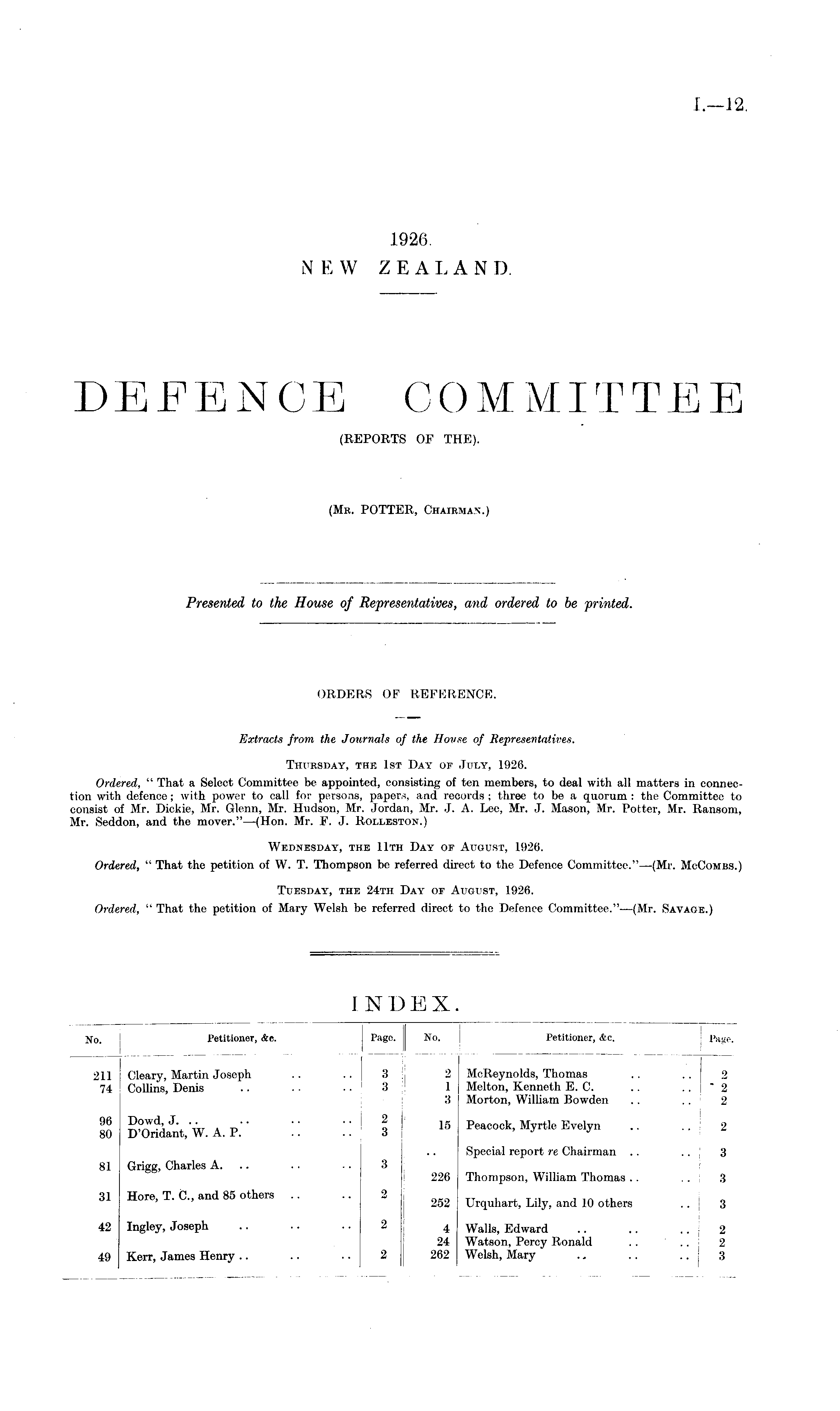 ORDERS OF REFERENCE. Extracts from the Journals of the House of Representatives. Thursday, the Ist Day of July, 1926. Ordered, " That a Select Committee be appointed, consisting of ten members, to deal with all matters in connection with defence; with power to call for persons, papers, and records ; three to be a quorum : the Committee to consist of Mr. Dickie, Mr. Glenn, Mr. Hudson, Mr. Jordan, Mr. J. A. Lee, Mr. J. Mason, Mr. Potter, Mr. Ransom, Mr. Seddon, and the mover."—(Hon. Mr. F. J. Rolleston.) Wednesday, the 11th Day oe August, 1926. Ordered, " That the petition of W. T. Thompson be referred direct to the Defence Committee."—(Mr. McCombs.) Tuesday, the 24th Day or August, 1926. Ordered, " That the petition of Mary Welsh be referred direct to the Defence Committee."—(Mr. Savage.)