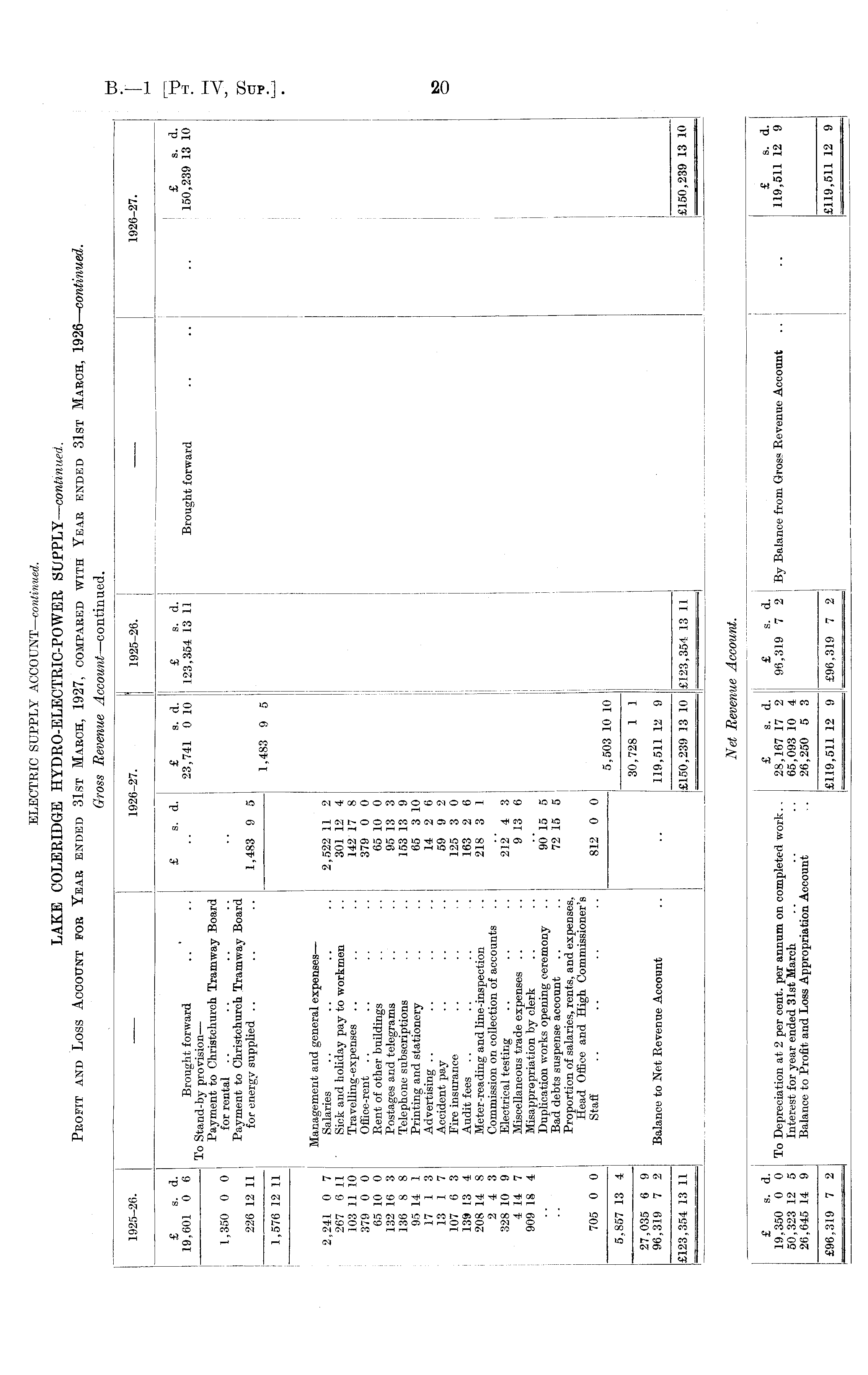Gross Revenue Account —continued. 1925-26. 1926-27. 1925-26. 1926-27. £ s. d. < £ s. d. £ s. d. £ s. d. £ s. d. 19,601 0 6 Brought forward .. .. .. 23,741 0 10 123,354 13 11 Brought forward .. .. .. 150,239 13 10 — — To Stand-by provision — Payment to Christchurch Tramway Board 1,350 0 0 for rental Payment to Christchurch Tramway Board 226 12 11 for energv supplied .. .. .. 1,483 9 5 ' — 1,483 9 5 1,576 12 11 Management and general expenses — 2,241 0 7 Salaries .. .. .. .. 2,522 11 2 267 6 11 ' Sick and holiday pay to workmen .. 301 12 4 103 11 10 Travelling-expenses .. .. .. 142 17 8 379 0 0 Office-rent .. .. .. .. 379 0 0 65 10 0 Bent of other buildings .. .. 65 10 0 132 16 3 Postages and telegrams .. .. 95 13 3 136 8 8 Telephone subscriptions .. .. 153 13 9 95 14 1 Printing and stationery .. .. 65 3 10 17 1 3 Advertising .. .. .. ,. 14 2 6 13 17 Accident pay .. .. .. 59 9 2 107 6 3 Fire insurance .. .. , . 125 3 0 139 13 4 Audit fees .. .. .. , . 163 2 6 208 14 8 Meter-reading and line-inspection .. 218 3 1 2 4 3 Commission on collection of accounts 328 10 9 Electrical testing .. .. .. 212 4 3 4 14 7 Miscellaneous trade expenses .. .. 9 13 6 909 18 4 Misappropriation by clerk ...... Duplication works opening ceremony .. 90 15 5 Bad debts suspense account .. .. 72 15 5 Proportion of salaries, rents, and expenses, Head Office and High Commissioner's 705 0 0 Staff .. .. .. .. 812 0 0 5,503 10 10 5,857 13 4 —— 30,728 1 1 27,035 6 9 96,319 7 2 Balance to Net Bevenue Account .. .. 119,511 12 9 £123,354 13 11 £150,239 13 10 £123,354 13 11 £150,239 13 10 Net Revenue Account. £ s. d. £ s. d. £ s. d. £ s. d. 19,350 0 0 To Depreciation at 2 per cent, per annum on completed work.. 28,167 17 2 96,319 7 2 By Balance from Gross Bevenue Account .. .. 119,511 12 9 50,323 12 5 Interest for year ended 31st March .. .. .. 65,093 10 4 26,645 14 9 Balance to Profit and Loss Appropriation Account .. 26,250 5 3 £96,319 7 2 £119,511 12 9 £96,319 7 2 £119,511 12 9