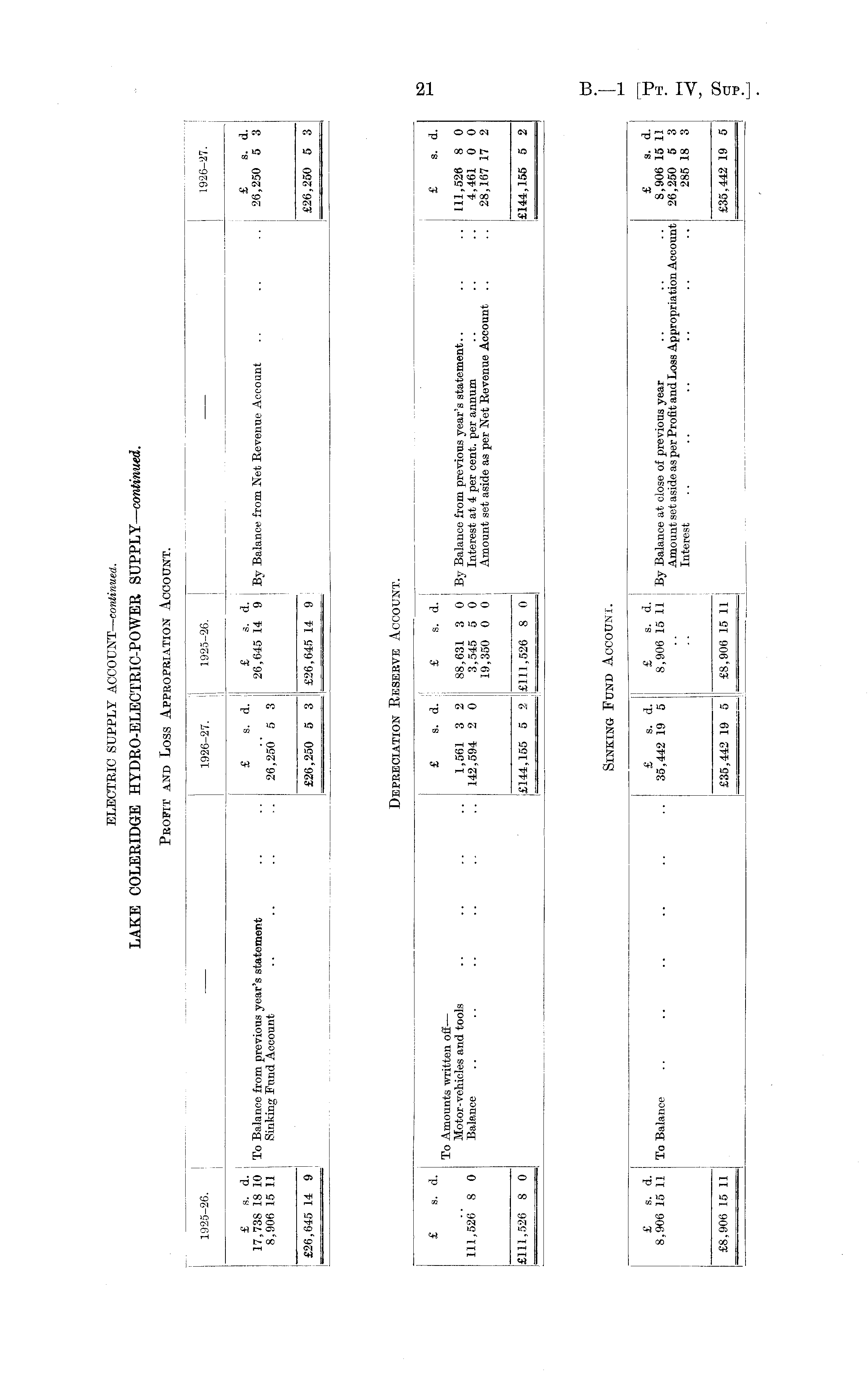 Profit and Loss Appropriation Account. 1925-26. I | 1926-27. | 1925-26. I 1926-27. | ! , I I i J! : . • ' t ' i ' £ s. d. £ s. d. £ s. d. £ s. d. 17,738 18 10 To Balance from previous year's statement .. .. .. 26,645 14 9 By Balance from Net Revenue Account .. .. .. 26,250 5 3 8,906 15 11 Sinking Fund Account .. .. .. .. 26,250 5 3 —— £26,645 14 9 : £26,250 5 3 £26,645 14 9 £26,250 5 3 Depreciation Reserve Account. ll ' I £ s. d. £ s. d. £ s. d. £ s. d. To Amounts written off — Motor-vehicles and tools .. .. .. .. 1,561 3 2 88,631 3 0 By Balance from previous year's statement.. .. .. Lll,528 8 0 111,526 8 0 Balance .. .. .. .. .. .. 142,594 2 0 3,545 5 0 Interest at 4 per cent, per annum .. .. .. 4,461 0 0 19,350 0 0 Amount set aside as per Net Revenue Account .. .. 28,167 17 2 £111,526 8 0 £144,155 5 2 £111,526 8 0 £144,155 5 2 Sinking Fund Account. £ s. d. £ s. d. £ s. d. £ a. d. 8,906 15 11 To Balance .. .. .. .. .. .. 35,442 19 5 8,906 15 11 By Balance at close of previous year .. .. .. 8,906 15 11 Amount set aside as per Profit and Loss Appropriation Account 26,250 5 3 Interest .. .. .. .. .. .. 285 18 3 £8,906 15 11 £35,442 19 5 £8,906 15 11 £35,442 19 5