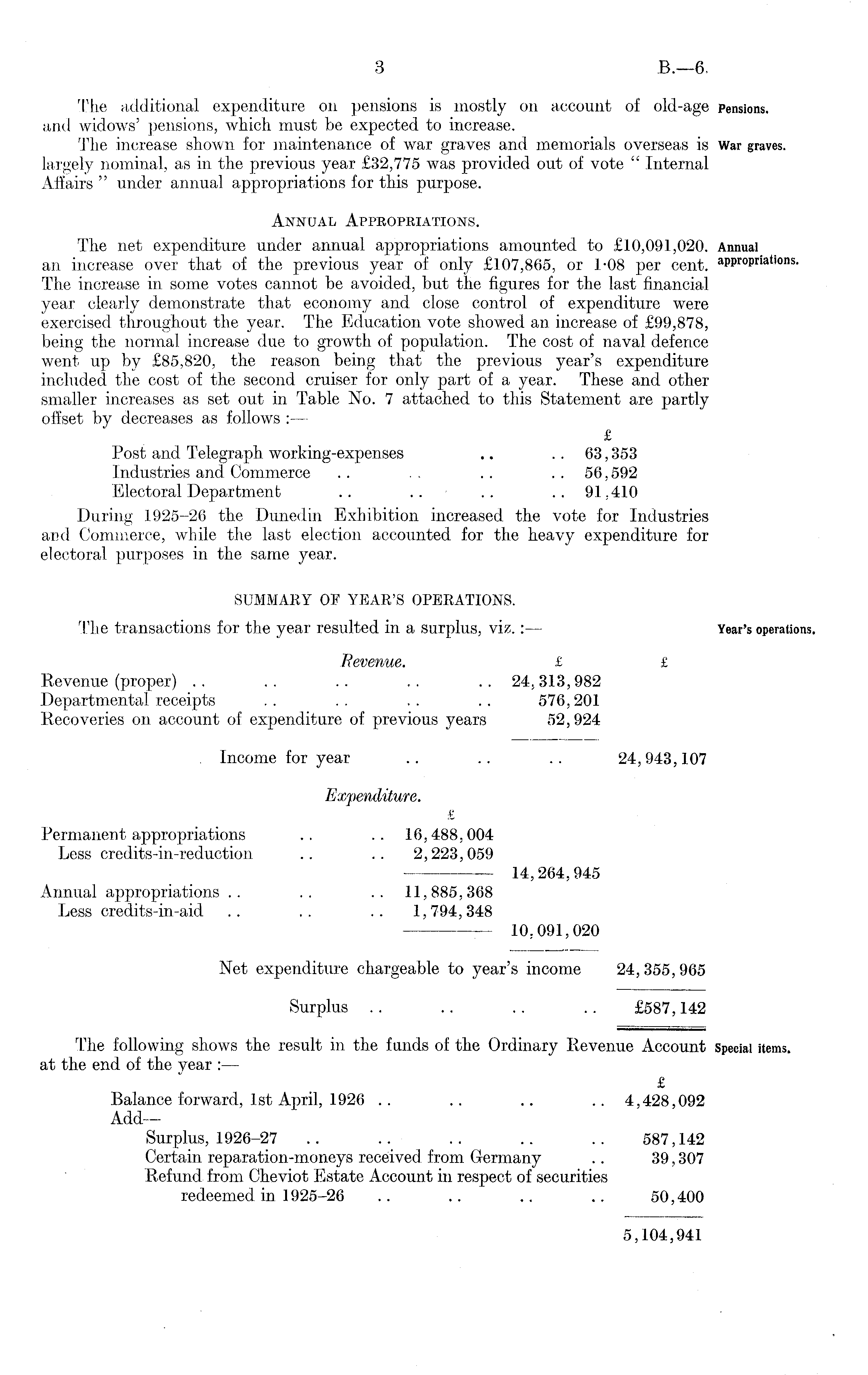 The additional expenditure on pensions is mostly on account of old-age and widows' pensions, which must be expected to increase. The increase shown for maintenance of war graves and memorials overseas is largely nominal, as in the previous year £32,775 was provided out of vote " Internal Affairs " under annual appropriations for this purpose. Annual Appropriations. The net expenditure under annual appropriations amounted to £10,091,020. an increase over that of the previous year of only £107,8(55, or 1-08 per cent. The increase in some votes cannot be avoided, but the figures for the last financial year clearly demonstrate that economy and close control of expenditure were exercised throughout the year. The Education vote showed an increase of £99,878, being the normal increase due to growth of population. The cost of naval defence went up by £85,820, the reason being that the previous year's expenditure included the cost of the second cruiser for only part of a year. These and other smaller increases as set out in Table No. 7 attached to this Statement are partly offset by decreases as follows : — £ Post and Telegraph working-expenses .. . . 63,353 Industries and Commerce . . . . . . 56,592 Electoral Department .. .. .. .. 91,410 During 1925-26 the Dunedin Exhibition increased the vote for Industries and Commerce, while the last election accounted for the heavy expenditure for electoral purposes in the same year. SUMMARY OF YEAR'S OPERATIONS. The transactions for the year resulted in a surplus, viz.:— Revenue. £ £ Revenue (proper) .. .. .. .. .. 24.313,982 Departmental receipts .. .. ~ .. 576,201 Recoveries on account of expenditure of previous years 52,924 Income for year .. . . .. 24, 943,107 Expenditure. £ Permanent appropriations .. .. 16,488,004 Less credits-in-reduction .. .. 2,223,059 14,264,945 Annual appropriations .. .. .. 11,885,368 Less credits-in-aid .. .. .. 1,794,348 — 10,091,020 Net expenditure chargeable to year's income 24, 355, 965 Surplus .. .. .. .. £587,142 The following shows the result in the funds of the Ordinary Revenue Account at the end of the vear : — £ Balance forward, Ist April, 1926 .. .. .. .. 4,428,092 Add— Surplus, 1926-27 .. .. .. .. .. 587,142 Certain reparation-moneys received from Germany .. 39,307 Refund from Cheviot Estate Account in respect of securities redeemed in 1925-26 .. .. .. .. 50,400 5,104,941