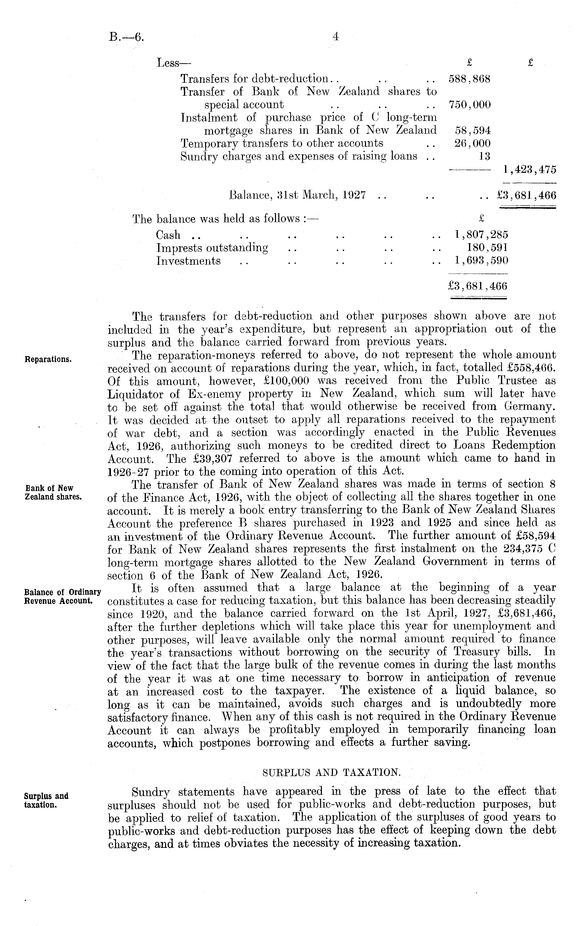 Less — £ £ Transfers for debt-reduction.. .. .. 588,868 Transfer of Bank of New Zealand shares to special account .. .. .. 750,000 Instalment of purchase price of C long-term mortgage shares in Bank of New Zealand 58,594 Temporary transfers to other accounts . . 26,000 Sundry charges and expenses of raising loans .. 13 — 1,423,475 Balance, 31st March, 1927 .. .. .. £3,681,466 The balance was held as follows : — £ Cash .. .. .. .. .. .. 1,807,285 Imprests outstanding .. .. .. .. 180,591 Investments . . .. .. .. 1,693,590 £3,681,466 The transfers for debt-reduction and other purposes shown above are not included in the year's expenditure, but represent an appropriation out of the surplus and the balance carried forward from previous years. The reparation-moneys referred to above, do not represent the whole amount received on account of reparations during the year, which, in fact, totalled £558,466. Of this amount, however, £100,000 was received from the Public Trustee as Liquidator of Ex-enemy property in New Zealand, which sum will later have to be set off against the total that would otherwise be received from Germany. It was decided at the outset to apply all reparations received to the repayment of war debt, and a section was accordingly enacted in the Public Revenues Act, 1926, authorizing such moneys to be credited direct to Loans Redemption Account. The £39,307 referred to above is the amount which came to hand in 1926-27 prior to the coming into operation of this Act. The transfer of Bank of New Zealand shares was made in terms of section 8 of the Finance Act, 1926, with the object of collecting all the shares together in one account. It is merely a book entry transferring to the Bank of New Zealand Shares Account the preference B shares purchased in 1923 and 1925 and since held as an investment of the Ordinary Revenue Account. The further amount of £58,594 for Bank of New Zealand shares represents the first instalment on the 234,375 C long-term mortgage shares allotted to the New Zealand Government in terms of section 6 of the Bank of New Zealand Act, 1926. It is often assumed that a large balance at the beginning of a year constitutes a case for reducing taxation, but this balance has been decreasing steadily since 1920, and the balance carried forward on the Ist April, 1927, £3,681,466, after the further depletions which will take place this year for unemployment and other purposes, will leave available only the normal amount required to finance the year's transactions without borrowing on the security of Treasury bills. In view of the fact that the large bulk of the revenue comes in during the last months of the year it was at one time necessary to borrow in anticipation of revenue at an increased cost to the taxpayer. The existence of a liquid balance, so long as it can be maintained, avoids such charges and is undoubtedly more satisfactory finance. When any of this cash is not required in the Ordinary Revenue Account it can always be profitably employed in temporarily financing loan accounts, which postpones borrowing and effects a further saving. SURPLUS AND TAXATION. Sundry statements have appeared in the press of late to the effect that surpluses should not be used for public-works and debt-reduction purposes, but be applied to relief of taxation. The application of the surpluses of good years to public-works and debt-reduction purposes has the effect of keeping down the debt charges, and at times obviates the necessity of increasing taxation.