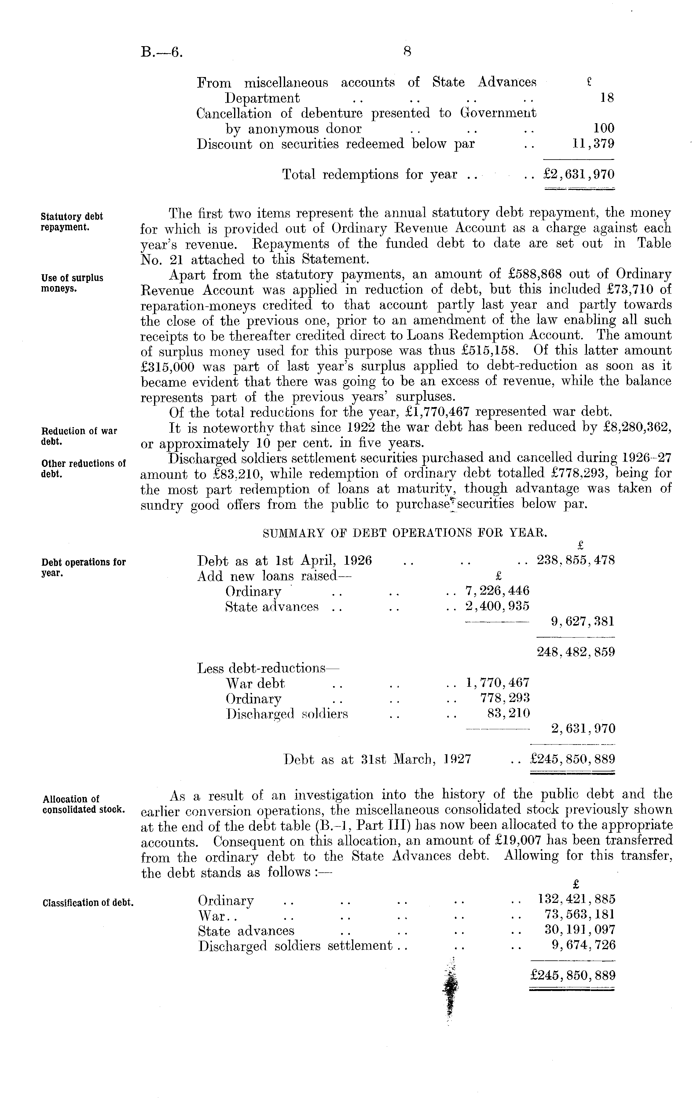 From miscellaneous accounts of State Advances £ Department .. .. .. . . 18 Cancellation of debenture presented to Government by anonymous donor . . .. .. 100 Discount on securities redeemed below par .. 11,379 Total redemptions for year .. . . £2,631,970 The first two items represent the annual statutory debt repayment, the money for which is provided out of Ordinary Revenue Account as a charge against each year's revenue. Repayments of the funded debt to date are set out in Table No. 21 attached to this Statement. Apart from the statutory payments, an amount of £588,868 out of Ordinary Revenue Account was applied in reduction of debt, but this included £73,710 of reparation-moneys credited to that account partly last year and partly towards the close of the previous one, prior to an amendment of the law enabling all such receipts to be thereafter credited direct to Loans Redemption Account. The amount of surplus money used for this purpose was thus £515,158. Of this latter amount £315,000 was part of last year's surplus applied to debt-reduction as soon as it became evident that there was going to be an excess of revenue, while the balance represents part of the previous years' surpluses. Of the total reductions for the year, £1,770,467 represented war debt. It is noteworthy that since 1922 the war debt has been reduced by £8,280,362, or approximately 10 per cent, in five years. Discharged soldiers settlement securities purchased and cancelled during 1926 -27 amount to £83,210, while redemption of ordinary debt totalled £778,293, being for the most part redemption of loans at maturity, though advantage was taken of sundry good offers from the public to securities below par. SUMMARY OF DEBT OPERATIONS FOR YEAR. £ Debt as at Ist April, 1926 .. .. .. 238,855,478 Add new loans raised — £ Ordinary .. .. .. 7,226,446 State advances .. .. .. 2,400,935 — 9,627,381 248,482,859 Less debt-reductions — War debt .. .. .. 1,770,467 Ordinary .. .. .. 778,293 Discharged soldiers .. .. 83,210 2,631,970 Debt as at 31st March, 1927 .. £245,850,889 As a result of an investigation into the history of the public debt and the earlier conversion operations, the miscellaneous consolidated stock previously shown at the end of the debt table (8.-l, Part III) has now been allocated to the appropriate accounts. Consequent on this allocation, an amount of £19,007 has been transferred from the ordinary debt to the State Advances debt. Allowing for this transfer, the debt stands as follows : — £ Ordinary .. .. .. •• •• 132,421,885 War 73,563,181 State advances .. .. •• •• 30,191,097 Discharged soldiers settlement . . .. .. 9,674,726 £245,850,889 —