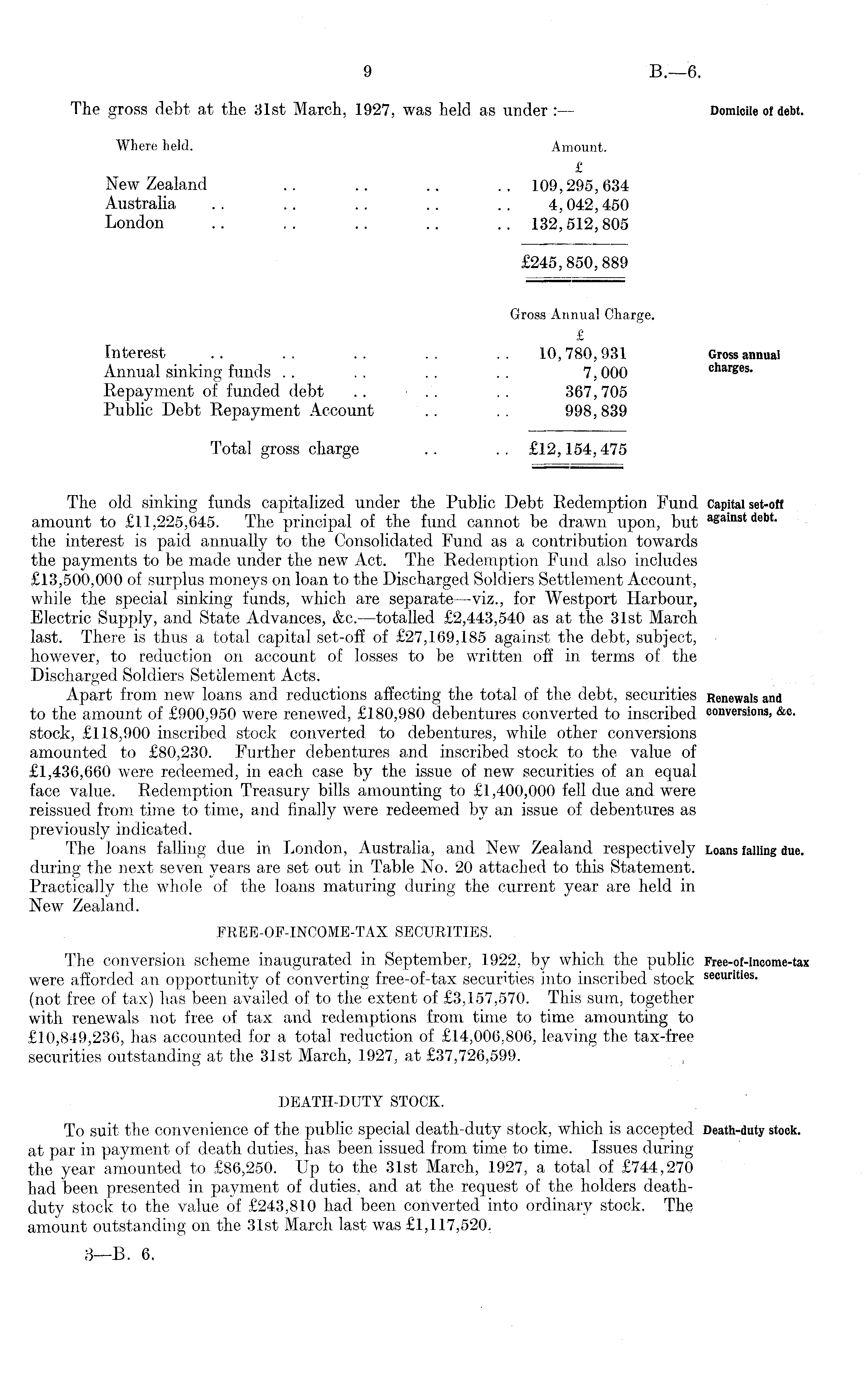 The gross debt at the 31st March, 1927, was held as under : — Where held. Amount. £ New Zealand .. .. .. .. 109,295,634 Australia . . . . . . . . . . 4,042,450 London .. .. .. .. .. 132,512,805 £245,850,889 Gross Annual Charge. £ Interest .. .. .. .. .. 10,780,931 Annual sinking funds .. .. .. .. 7,000 Repayment of funded debt .. .. .. 367,705 Public Debt Repayment Account . . . . 998, 839 Total gross charge .. .. £12,154,475 The old sinking funds capitalized under the Public Debt Redemption Fund amount to £11,225,645. The principal of the fund cannot be drawn upon, but the interest is paid annually to the Consolidated Fund as a contribution towards the payments to be made under the new Act. The Redemption Fund also includes £13,500,000 of surplus moneys on loan to the Discharged Soldiers Settlement Account, while the special sinking funds, which are separate —viz., for Westport Harbour, Electric Supply, and State Advances, &c. —totalled £2,443,540 as at the 31st March last. There is thus a total capital set-off of £27,169,185 against the debt, subject, however, to reduction on account of losses to be written off in terms of the Discharged Soldiers Settlement Acts. Apart from new loans and reductions affecting the total of the debt, securities to the amount of £900,950 were renewed, £180,980 debentures converted to inscribed stock, £118,900 inscribed stock converted to debentures, while other conversions amounted to £80,230. Further debentures and inscribed stock to the value of £1,436,660 were redeemed, in each case by the issue of new securities of an equal face value. Redemption Treasury bills amounting to £1,400,000 fell due and were reissued from time to time, and finally were redeemed by an issue of debentures as previously indicated. The loans falling due in London, Australia, and New Zealand respectively during the next seven years are set out in Table No. 20 attached to this Statement. Practically the whole of the loans maturing during the current year are held in New Zealand. FEEE-OF-INCOME-TAX SECURITIES. The conversion scheme inaugurated in September, 1922, by which the public were afforded an opportunity of converting free-of-tax securities into inscribed stock (not free of tax) has been availed of to the extent of £3,157,570. This sum, together with renewals not free of tax and redemptions from time to time amounting to £10,849,236, has accounted for a total reduction of £14,006,806, leaving the tax-free securities outstanding at the 31st March, 1927, at £37,726,599. DEATH-DUTY STOCK. To suit the convenience of the public special death-duty stock, which is accepted at par in payment of death duties, has been issued from time to time. Issues during the year amounted to £86,250. Up to the 31st March, 1927, a total of £744,270 had been presented in payment of duties, and at the request of the holders deathduty stock to the value of £243,810 had been converted into ordinary stock. The amount outstanding on the 31st March last was £1,117,520.