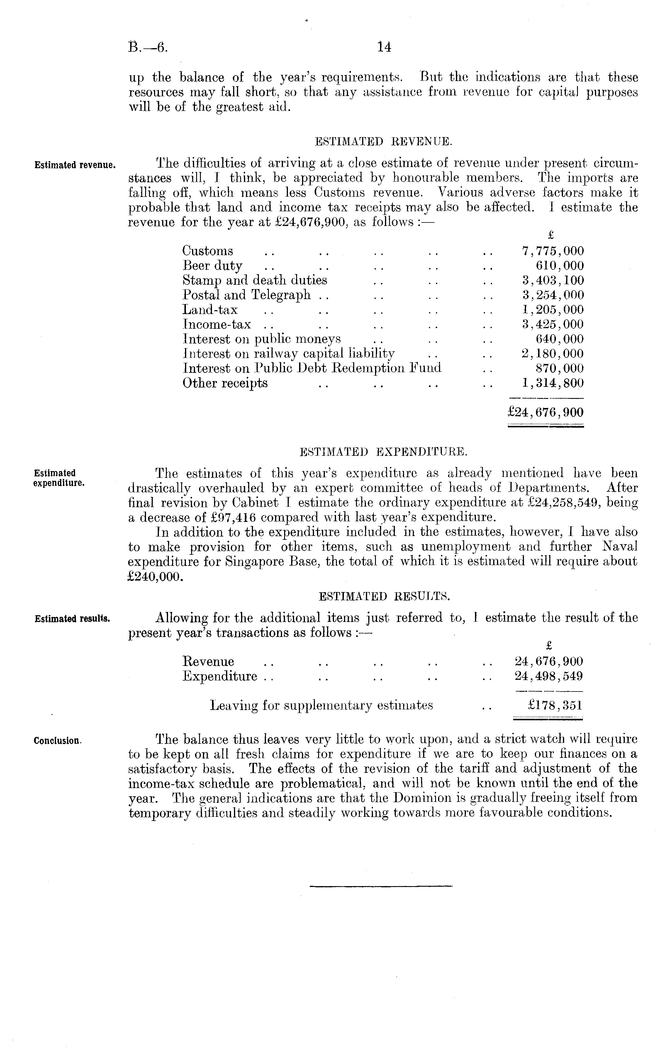 up the balance of the year's requirements. But the indications are that these resources may fall short, so that any assistance from revenue for capital purposes will be of the greatest aid. ESTIMATED REVENUE. The difficulties of arriving at a close estimate of revenue under present circumstances will, I think, be appreciated by honourable members. The imports are falling off, which means less Customs revenue. Various adverse factors make it probable that land and income tax receipts may also be affected, f estimate the revenue for the year at £24,676,900, as follows : — £ Customs .. .. .. .. .. 7,775,000 Beer duty .. .. .. .. .. 610,000 Stamp and death duties .. .. .. 3,403,100 Postal and Telegraph .. .. .. .. 3,254,000 Land-tax . . .. . . . . . . 1,205,000 Income-tax . . . . . . . . . . 3,425,000 Interest on public moneys .. .. .. 640,000 Interest on railway capital liability .. .. 2,180,000 Interest on Public Debt Redemption Fund . . 870,000 Other receipts .. .. .. .. 1,314,800 £24,676,900 ESTIMATED EXPENDITURE. The estimates of this year's expenditure as already mentioned have been drastically overhauled by an expert committee of heads of Departments. After final revision by Cabinet I estimate the ordinary expenditure at £24,258,549, being a decrease of £97,416 compared with last year's expenditure. In addition to the expenditure included in the estimates, however, I have also to make provision for other items, such as unemployment and further Naval expenditure for Singapore Base, the total of which it is estimated will require about £240,000. ESTIMATED RESULTS. Allowing for the additional items just referred to, I estimate the result of the present year's transactions as follows : — Revenue .. .. .. .. ~ 24,676,900 Expenditure .. .. .. .. .. 24,498,549 Leaving for supplementary estimates .. £178,351 The balance thus leaves very little to work upon, and a strict watch will require to be kept on all fresh claims for expenditure if we are to keep our finances on a satisfactory basis. The effects of the revision of the tariff and adjustment of the income-tax schedule are problematical, and will not be known until the end of the year. The general indications are that the Dominion is gradually freeing itself from temporary difficulties and steadily working towards more favourable conditions.