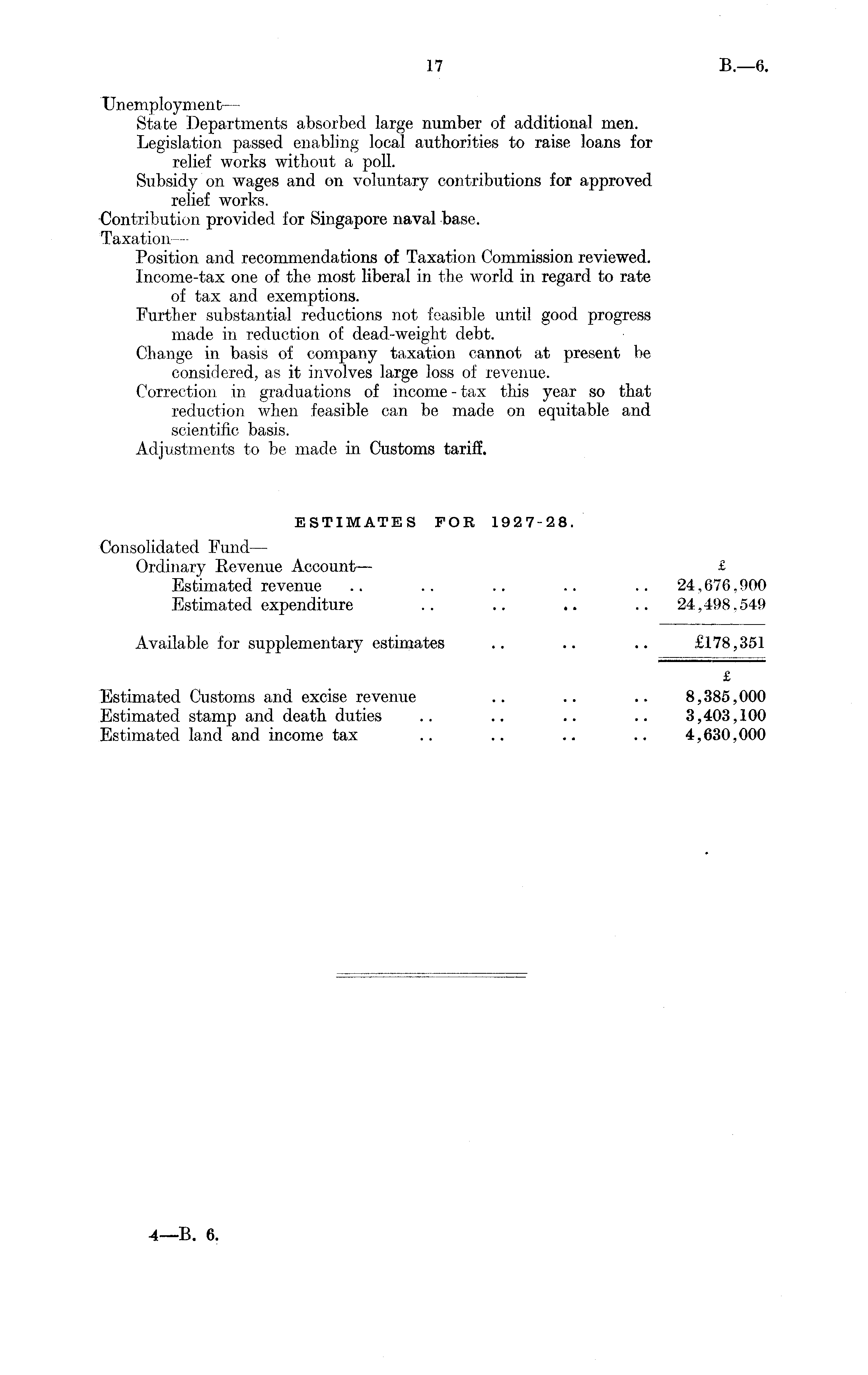 Unemployment — State Departments absorbed large number of additional men. Legislation passed enabling local authorities to raise loans for relief works without a poll. Subsidy on wages and on voluntary contributions for approved relief works. •Contribution provided for Singapore naval base. Taxation — Position and recommendations of Taxation Commission reviewed. Income-tax one of the most liberal in the world in regard to rate of tax and exemptions. Further substantial reductions not feasible until good progress made in reduction of dead-weight debt. Change in basis of company taxation cannot at present be considered, as it involves large loss of revenue. Correction in graduations of income - tax this year so that reduction when feasible can be made on equitable and scientific basis. Adjustments to be made in Customs tariff. ESTIMATES FOR 1927-28. Consolidated Fund — Ordinary Revenue Account— £ Estimated revenue .. .. .. .. .. 24,676,900 Estimated expenditure .. .. .. .. 24,498,549 Available for supplementary estimates .. .. .. £178,351 £ Estimated Customs and excise revenue .. .. .. 8,385,000 Estimated stamp and death duties .. .. .. .. 3,403,100 Estimated land and income tax .. .. .. .. 4,630,000