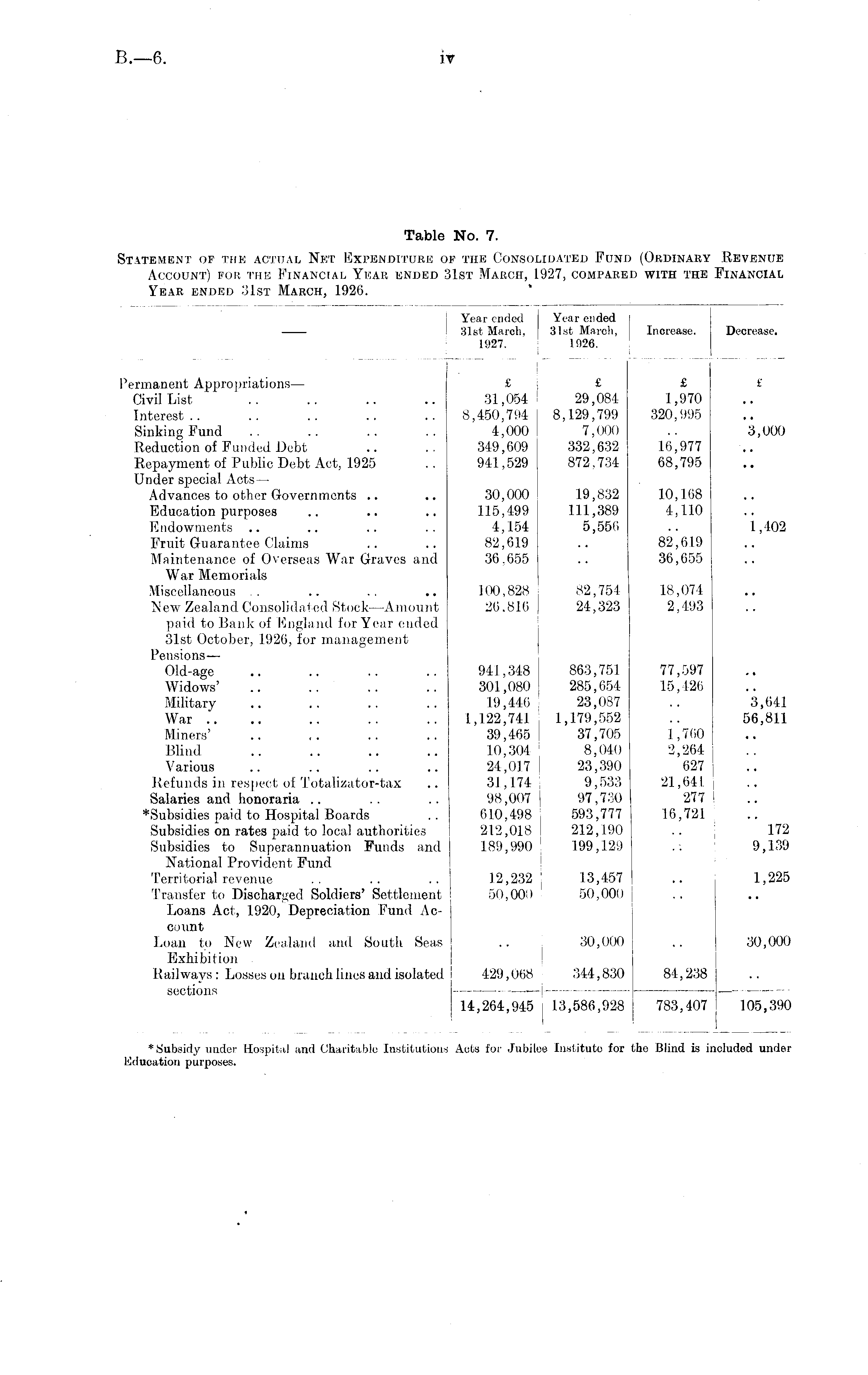 Year ended Year ended ' 31st March, 31st March, I Increase. Decrease. 1927. 1926. Permanent Appropriations— £ £ £ £ Civil List .. .. .. .. 31,054 29,084 1,970 Interest.. .. .. .. .. 8,450,794 8,129,799 320,995 Sinking Fund .. .. .. .. 4,000 J 7,000 .. 3,000 Reduction of Funded Debt .. .. 349,609 332,632 16,977 Repayment of Public Debt Act, 1925 .. 941,529 872,734 68,795 Under special ActsAdvances to other Governments .. .. 30,000 19,832 10,168 Education purposes .. .. .. 115,499 j 111,389 4. L10 Endowments .. .. .. .. 4,154 ' 5,556 .. 1,402 Fruit Guarantee Claims .. .. 82,619 .. 82,619 Maintenance of Overseas War Graves and 36,655 .. 36,655 War Memorials Miscellaneous .. .. .. .. 100,828 82,754 18,074 New Zealand Consolidated Stock —Amount 26.816 24,323 2,493 paid to Bank of England for Year ended 31st October, 1926, for management Pensions— Old-age .. .. .. .. 941,348 863,751 77,597 Widows' .. .. .. .. 301,080 285,654 15,426 Military .. .. .. .. 19,446 23,087 .. 3,641 War .. .. .. .. .. 1,122,741 1,179,552 .. 56,811 Miners' .. .. .. .. 39,465 I 37,705 1,760 Blind .. .. .. .. 10,304 8,040 2,264 Various .. .. .. .. 24,017 23,390 627 Refunds in respect of Totalizator-tax .. 31,174 : 9,533 21,641 I Salaries and honoraria .. .. .. 98,007 i 97,730 277 *Subsidies paid to Hospital Boards .. 610,498 ( 593,777 16,721 Subsidies on rates paid to local authorities 212,018 | 212,190 .. 172 Subsidies to Superannuation Funds and 189,990 199,129 .-. 9,139 National Provident Fund Territorial revenue .. .. .. 12,232 j 13,457 .. 1,225 Transfer to Discharged Soldiers' Settlement 50,00!) 50,000 Loans Act, 1920, Depreciation Fund Account Loan to New Zealand and South Seas .. j 30,000 .. 30,000 Exhibition Railways: Losses on branch lines and isolated I 429,068 344,830 84,238 j 14,264,945 13,586,928 783,407 105,390 L _ _J I : I * Subsidy under Hospital and Charitable Institutions Acts for Jubilee Institute for the Blind is included under Education purposes.
