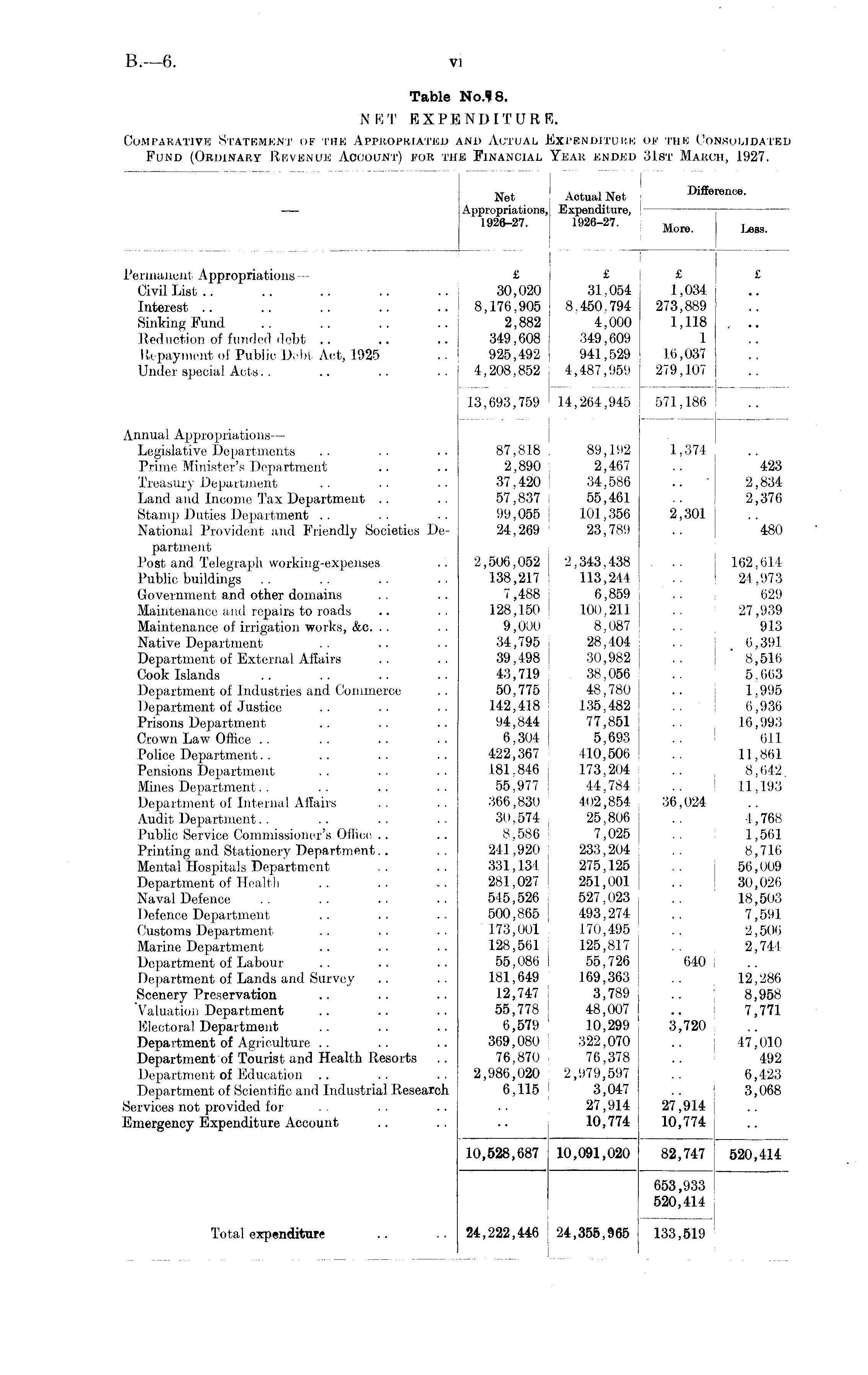 Net Actual Net Difference. — Appropriations, Expenditure, ! 1926-27. 1926-27. More |j6s , . i Permanent Appropriations — £ £ £ £ Civil List.. .. .. .. .. 30,020 31,054 1,034 Interest .. .. .. .. .. 8,176,905 8.450.794 273,889 Sinking Fund .. .. .. .. 2,882 4,000 1,118 , .. Reduction of funded debt .. .. .. 349,608 349,609 1 Repayment of Public Debt Act, 1925 .. 925,492 941,529 16,037 Under special Acts.. .. .. .. 4,208,852 4,487,959 279,107 13,693,759 14,264,945 571,186 Annual Appropriations— Legislative Departments .. .. .. 87,818 89,192 1,374 Prime Minister's Department .. .. 2,890 2,467 .. 423 Treasury Department . . . . . • 37,420 34,586 .. ' 2,834Land and Income Tax Department .. .. 57,837 55,461 .. 2,376 Stamp Duties Department .. .. .. 99,055 101,356 2,301 National Provident and Friendly Societies De- 24,269 23,789 .. 480 partment Post and Telegraph working-expenses . . 2,506,052 2,343,438 .. 162,614 Public buildings .. .. .. .. 138,217 113,244 .. 24,973 Government and other domains .. .. 7,488 6,859 .. 629 Maintenance and repairs to roads .. .. 128,150 100,211 .. 27,939 Maintenance of irrigation works, &c. .. .. 9,000 8,087 .. 913 Native Department .. .. .. 34,795 28,404 .. _ 6,391 Department of External Affairs .. .. 39,498 30,982 .. 8,516 Cook Islands .. .. .. .. 43,719 38,056 .. 5,663 Department of Industries and Commerce .. 50,775 48,780 .. 1,995 Department of Justice .. .. .. 142,418 135,482 6,936 Prisons Department .. .. .. 94,844 77,851 .. 16,993 Crown Law Office .. .. .. .. 6,304 5,693 .. 611 Police Department.. .. .. .. 422,367 410,506 .. 11,861 Pensions Department .. .. .. 181,846 173,204 .. 8,642. Mines Department. . .. .. .. 55,977 44,784 .. I 11.193 Department of Internal Affairs .. .. 366,830 402,854 36,024 Audit Department.. .. .. 30,574 25,806 .. 4,768 Public Service Commissioner's Office .. .. 8,586 7,025 1,561 Printing and Stationery Department.. .. 241,920 233,204 .. 8,716 Mental Hospitals Department .. .. 331,134 275,125 .. 56,009 Department of Health .. .. -. 281,027 251,001 .. 30,026 Naval Defence .. .. .. .. 545,526 527,023 .. 18,503 Defence Department .. .. . .. 500,865 493,274 .. 7,591 Customs Department .. .. .. 173,001 170,495 .. 2,506 Marine Department .. .. .. 128,561 125,817 .. 2,744 Department of Labour .. .. .. 55,086 55,726 640 Department of Lands and Survey .. .. 181,649 169,363 .. 12,286 Scenery Preservation .. .. .. 12,747 3,789 .. 8,958 Valuation Department .. .. .. 55,778 48,007 .. 7,771 Electoral Department .. .. .. 6,579 10,299 3,720 Department of Agriculture .. .. .. 369,080 322,070 .. 47,010 Department of Tourist and Health Resorts .. 76,870 76,378 .. 492 Department of Education .. .. .. 2,986,020 2,979,597 .. 6,423 Department of Scientific and Industrial Research 6,115 3,047 .. 3,068 Services not provided for .. .. •• 27,914 27,914 Emergency Expenditure Account .. .. .. 10,774 10,774 10,528,687 10,091,020 82,747 520,414 653,933 520,414 Total expenditure .. .. 24,222,446 24,355,965 133,519 '