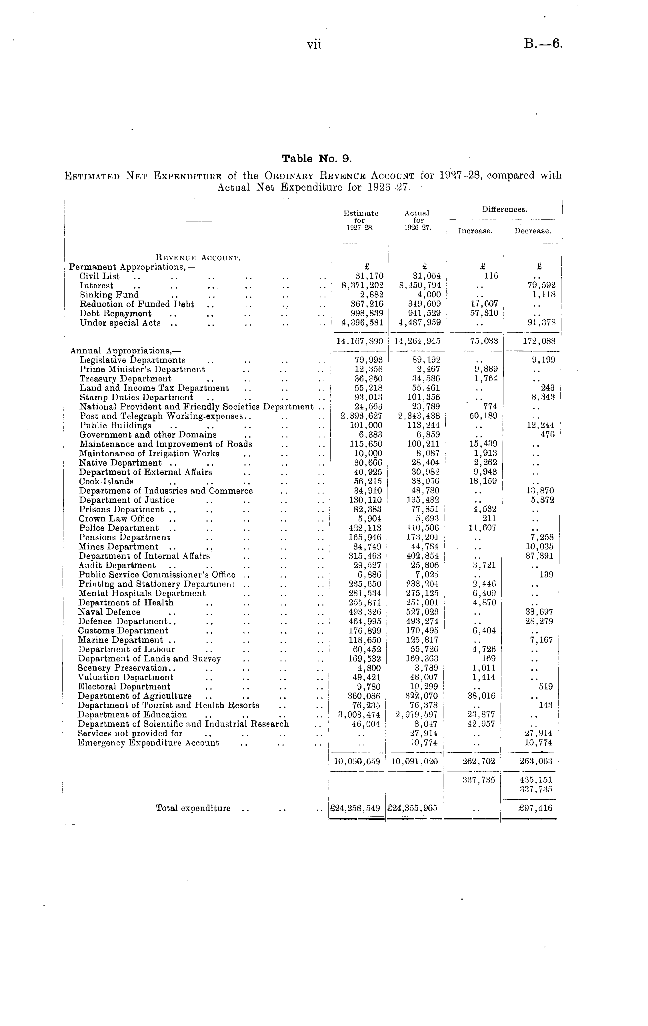 Estimate Actual Differences. for for j : 1927-28. 1926-27. i ncrea se. : Decrease. . Revenue Account. Permanent Appropriations,— £ £ & £ Civil List .. .. .. .. .. .. 31,170 i 31,054 116 Interest .. .. .. .. 8,371,202 8,450,794 .. 79,592 SinkingFund .. .. .. .. .. 2,882 4,000 .. 1,118 Reduction of Funded Debt .. .. ... .. 367,216 349,609 17,607 Debt Repayment .. .. .. .. .. 998,839 941,529 57,310 Under special Acts .. .. .. .. .. 4,396,581 4,487,959 .. 91,378 14,167,890 .14,264,945 75,033 172,088 Annual Appropriations,— , Legislative Departments .. .. .. .. 79,993 89,192 .. 9,199 Prime Minister's Department .. .. .. 12,356 ! 2,467 9,889 Treasury Department .. .. .. .. 36,350 34,586 1,764 Land and Income Tax Department .. .. .. 55,218 55,461 .. 243 Stamp Duties Department .. .. .. .. 93,013 1 101,356 .. 8,343 National Provident and Friendly Societies Department .. 24,563 23,789 774 Post and Telegraph Working-expenses.. .. .. 2,393,627 j 2,343,438 50,189 Public Buildings .. .. .. .. .. 101,000 1 113,244 .. 12,244 Government and other Domains .. .. .. 6,383 6,85.9 .. 476 Maintenance and improvement of Roads .. .. I 115,650 j 100,211 15,439 Maintenance of Irrigation Works .. .. ..I 10,000 8,087 1,913 Native Department .. .. .. .. .. .30,666 28,404 2,262 Department of External Affairs .. .. .. 40,925 30,982 9,943 Cook-Islands .. .. .. .. .. 56,215 38,056 18,159 Department of Industries and Commerce .. .. 34,910 48,780 .. 13,870 Department of Justice .. .. .. .. 130,110 135,482 .. 5,372 Prisons Department .. .. .. .. .. 82,383 77,851 4,532 Crown Law Offioe .. .. .. .. .. 5,904 5,693 211 Police Department .. .. .. .. .. 422,113 410,506 11,607 Pensions Department .. .. .. .. 165,946 i 173,204 .. 7,258 Mines Department .. .. .. .. .. 34,749 44,784 .. 10,035 Department of Internal ASairs .. .. .. 315,463 402,854 .. 87,'391 Audit Department .. .. .. .. .. 29,527 25,806 3,721 Publio Service Commissioner's Office .. .. .. 6,886 7,025 .. 139 Printing and Stationery Department .. .. .. j 235,650 233,204 2,446 Mental Hospitals Department .. .. .. 281,534 275,125 6,409 Department of Health .. .. . . .. 255,871 251,001 4,870 Naval Defence .. .. .. .. .. 493,326 1 527,023 .. 33,697 Defence Department.. .. .. .. .. 464,995 j 493,274 .. 28,279 Customs Department .. .. .. .. 176,899 j 170,495 6,404 Marine Department .. .. .. .. .. 118,650 j 125,817 .. 7,167 Department of Labour .. .. .. .. 60,452 55,726 4,726 Department of Lands and Survey .. .. .. 169,532 ! 169,363 169 Scenery Preservation.. .. .. .. .. 4,800 3,789 1,011 Valuation Department .. .. .. .. 49,421 48,007 1,414 Electoral Department .. .. .. .. 9,780 10,299 .. 519 Department of Agriculture .. .. .. .. 360,086 322,070 38,016 Department of Tourist and Health Resorts .. .. 76,235 76,378 .. 143 Department of Education .. .. .. .. 3,003,474 2,979,597 23,877 j Department of Scientific and Industrial Research .. 46,004 3,047 42,957 Services not provided for .. .. .. .. .. | 27,914 .. 27,914 I Emergenoy Expenditure Account .. .. .. .. i 10,774 .. 10,774 j 10,090,659 j 10,091,020 262,702 ; 263,063 337,735 435,151 •337,735 Total expenditure .. .. .. £24,258,549 £24,355,965 .. £97,416