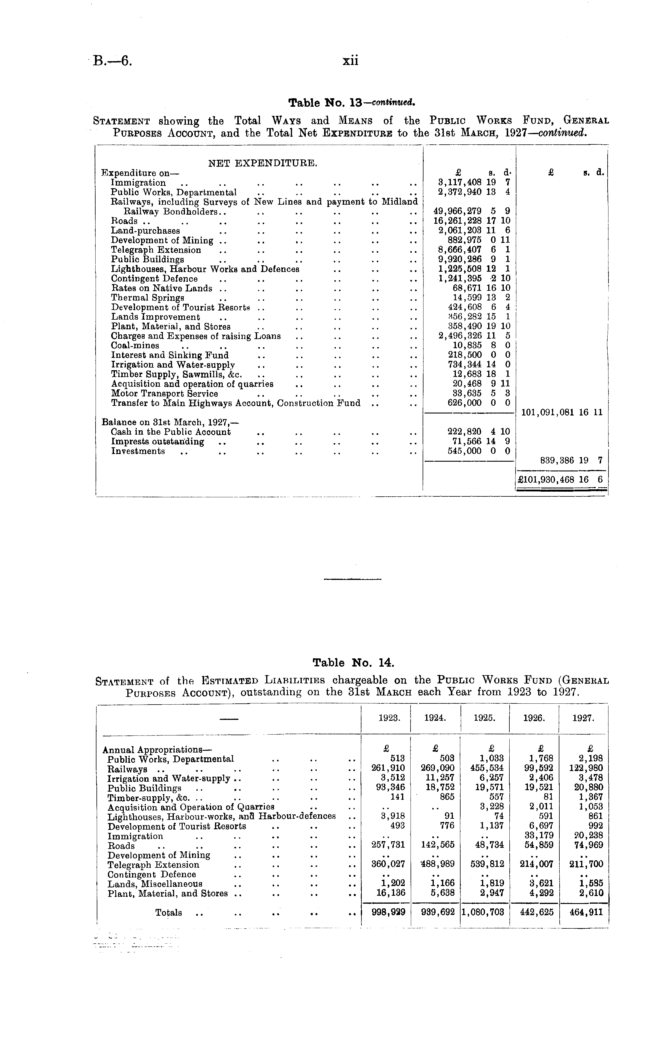 Table No. 13 —continued. Statement showing the Total Ways and Means of the Public Works Fund, General Purposes Account, and the Total Net Expenditure to the 31st March, 1927 —continued.