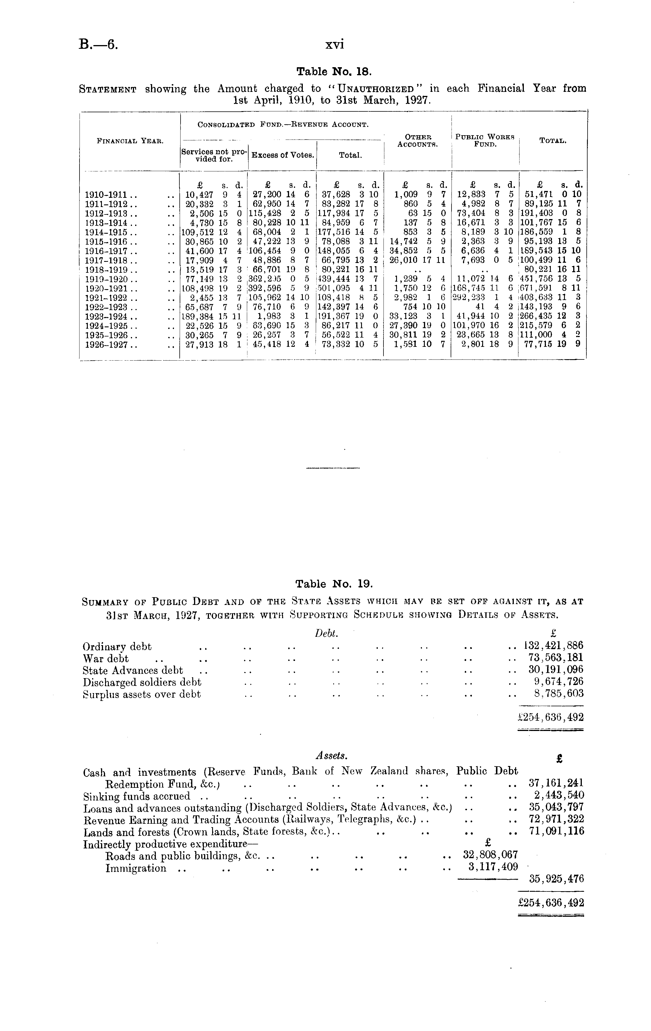 Table No. 19. Summary of Public Debt and of the State Assets which may be set off against it, as at 3Jst March, 1927, together with Supporting Schedule showing Details of Assets. Debt. £ Ordinary debt .. .. .. •• •• •• .. .. 132,421.886 War debt .. .. .. •• •• •• •• •• 73,563,181 State Advances debt .. .. .. •• •• .. 30,191,096 Discharged soldiers debt .. .. •• -. .. 9,674,726 Surplus assets over debt .. .. •• ■■ .. .. 8,785,603 £254,636,492 Assets. £ Cash and investments (Reserve. Funds, Bank of New Zealand shares, Public Debt Redemption Fund, &c.; .. .. .. .. .. .. .. 37,161,241 Sinking funds accrued .. .. .. • • • • • • • ■ 2, 443, 540 Loans and advances outstanding (Discharged Soldiers, State Advances, &c.) .. .. 35,043,797 Revenue Earning and Trading Accounts (Railways, Telegraphs, &c.) .. .. .. 72,971,322 Lands and forests (Crown lands, State forests, &c.).. .. .. .. .. 71,091,116 Indirectly productive expenditure — £ Roads and public buildings, &c. .. .. .. .. .. 32,808,067 Immigration .. .. .. •• •• •• •• 3,117,409 35,925,476 £254,636,492