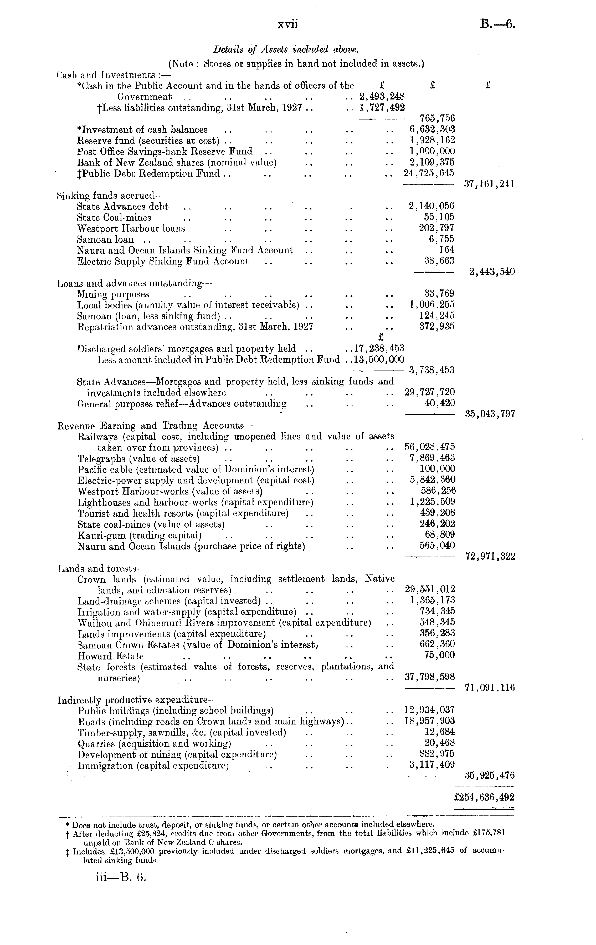 Details of Assets included above. (Note : Stores or supplies in hand not included in assets.) Cash and Investments : — *Cash in the Public Account and in the hands of officers of the £ £ £ Government. .. .. .. .. .. 2,493,248 fLess liabilities outstanding, 31st March, 1927 .. .. 1,727,492 765,756 investment of cash balances .. .. .. .. 6,632,303 Reserve fund (securities at cost) .. .. .. .. .. 1,928,162 Post Office Savings-bank Reserve Fund .. .. . . .. 1,000,000 Bank of New Zealand shares (nominal value) .. .. ... 2,109,375 JPublic Debt Redemption Fund .. .. .. .. .. 24,725,645 37,161,241 Sinking funds accrued — State Advances debt .. .. .. .. . .. 2,140,056 State Coal-mines .. .. .. .. .. .. 55,105 Westport Harbour loans .. .. .. .. .. 202,797 Samoan loan .. .. .. .. .. .. .. 6,755 Nauru and Ocean Islands Sinking Fund Account .. .. .. 164 Electric Supply Sinking Fund Account .. .. .. .. 38,663 2,443,540 Loans and advances outstandingMining purposes .. .. .. .. .. .. 33,769 Local bodies (annuity value of interest receivable) .. .. 1,006,255 Samoan (loan, less sinking fund) .. .. .. .. .. 124,245 Repatriation advances outstanding, 31st March, 1927 .. .. 372,935 £ Discharged soldiers' mortgages and property held .. . .17,238,453 Less amount included in Public Debt Redemption Fund . .13,500,000 3,738,453 State Advances—Mortgages and property held, less sinking funds and investments included elsewhere .. .. .. .. 29,727,720 General purposes relief —Advances outstanding .. .. .. 40,420 35,043,797 Revenue Earning and Trading AccountsRailways (capital cost, including unopened lines and value of assets taken over from provinces) .. .. .. .. .. 56,028,475 Telegraphs (value of assets) .. .. .. .. .. 7, 869, 463 Pacific cable (estimated value of Dominion's interest) .. .. 100,000 Electric-power supply and development (capital cost) .. .. 5,842,360 Westport Harbour-works (value of assets) .. .. .. 586,256 Lighthouses and harbour-works (capital expenditure) .. .. 1,225,509 Tourist and health resorts (capital expenditure) .. .. .. 439,208 State coal-mines (value of assets) .. .. .. .. 246,202 Kauri-gum (trading capital) .. .. .. .. .. 68,809 Nauru and Ocean Islands (purchase price of rights) .. .. 565,040 72,971,322 Lands and forests — Crown lands (estimated value, including settlement lands, Native lands, and education reserves) .. .. .. .. 29,551,012 Land-drainage schemes (capital invested) .. .. .. .. 1,365,173 Irrigation and water-supply (capital expenditure) .. .. .. 734,345 Waihou and Ohinemuri Rivers improvement (capital expenditure) . . 548,345 Lands improvements (capital expenditure) .. .. .. 356, 283 Samoan Crown Estates (value of Dominion's interest; .. .. 662,360 Howard Estate .. .. .. .. .. •• 75,000 State forests (estimated value of forests, reserves, plantations, and nurseries) .. .. .. .. •• •• 37,798,598 71,091,116 Indirectly productive expenditurePublic buildings (including school buildings) .. .. •• 12,934,037 Roads (including roads on Crown lands and main highways).. .. 18,957,903 Timber-supply, sawmills, &c. (capital invested) .. .. .. 12,684 Quarries (acquisition and working) .. .. .. .. 20,468 Development of mining (capital expenditure) .. .. .. 882,975 Immigration (capital expenditure; .. .. .. .. 3,117.409 35,925,476 £254,636,492