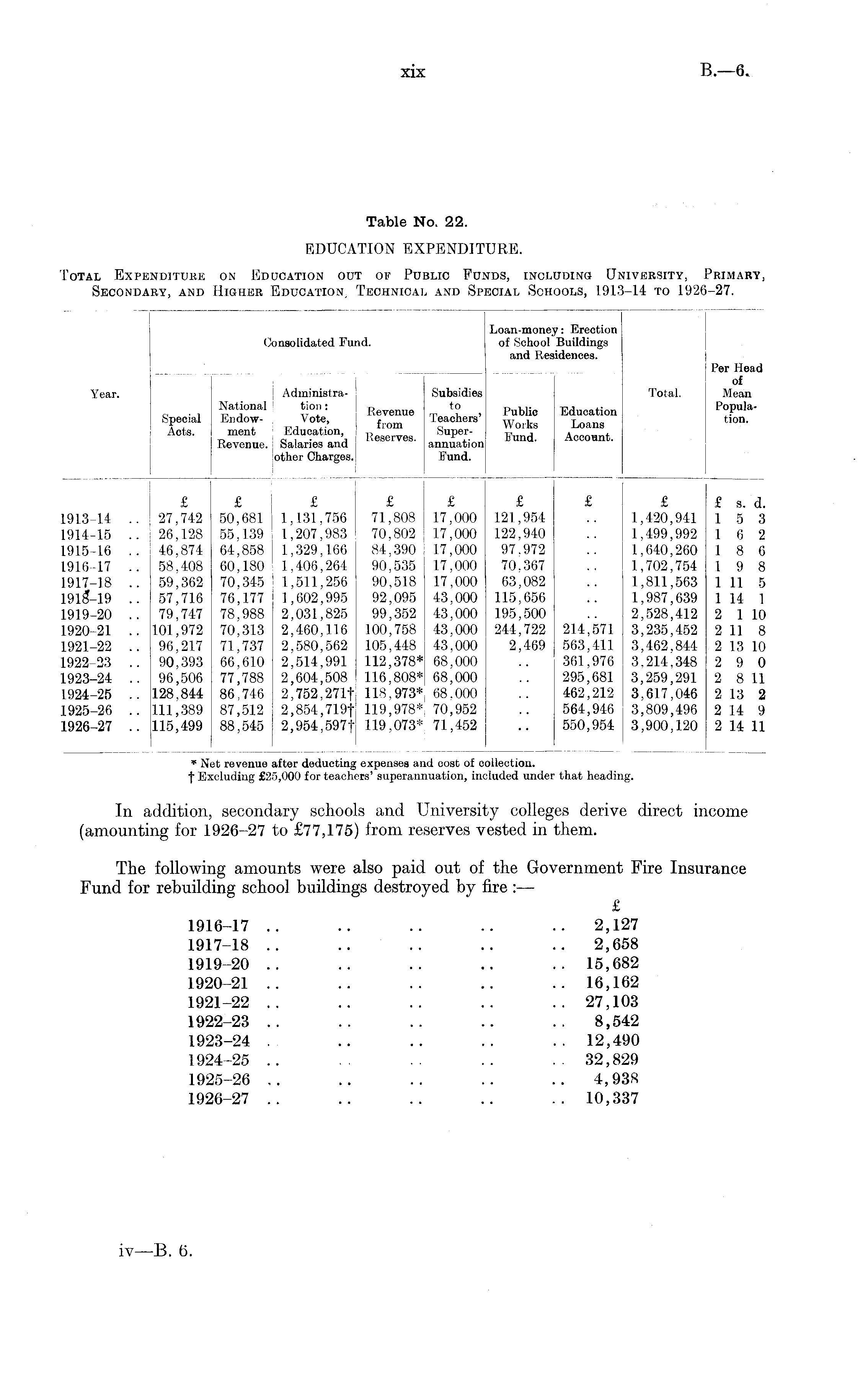 In addition, secondary schools and University colleges derive direct income (amounting for 1926-27 to £77,175) from reserves vested in them. The following amounts were also paid out of the Government Fire Insurance Fund for rebuilding school buildings destroyed by fire : — £ 1916-17 .. .. .. .. .. 2,127 1917-18 .. .. .. .. .. 2,658 1919-20 .. .. .. .. ..15,682 1920-21 .. .. .. .. .. 16,162 1921-22 .. .. .. .. .. 27,103 1922-23 .. .. .. .. .. 8,542 1923-24 . .. .. .. .. 12,490 1924-25 .. .. .. .. 32,829 1925-26 .. .. .. .. ..4,938 1926-27 .. .. .. .. ..10,337
