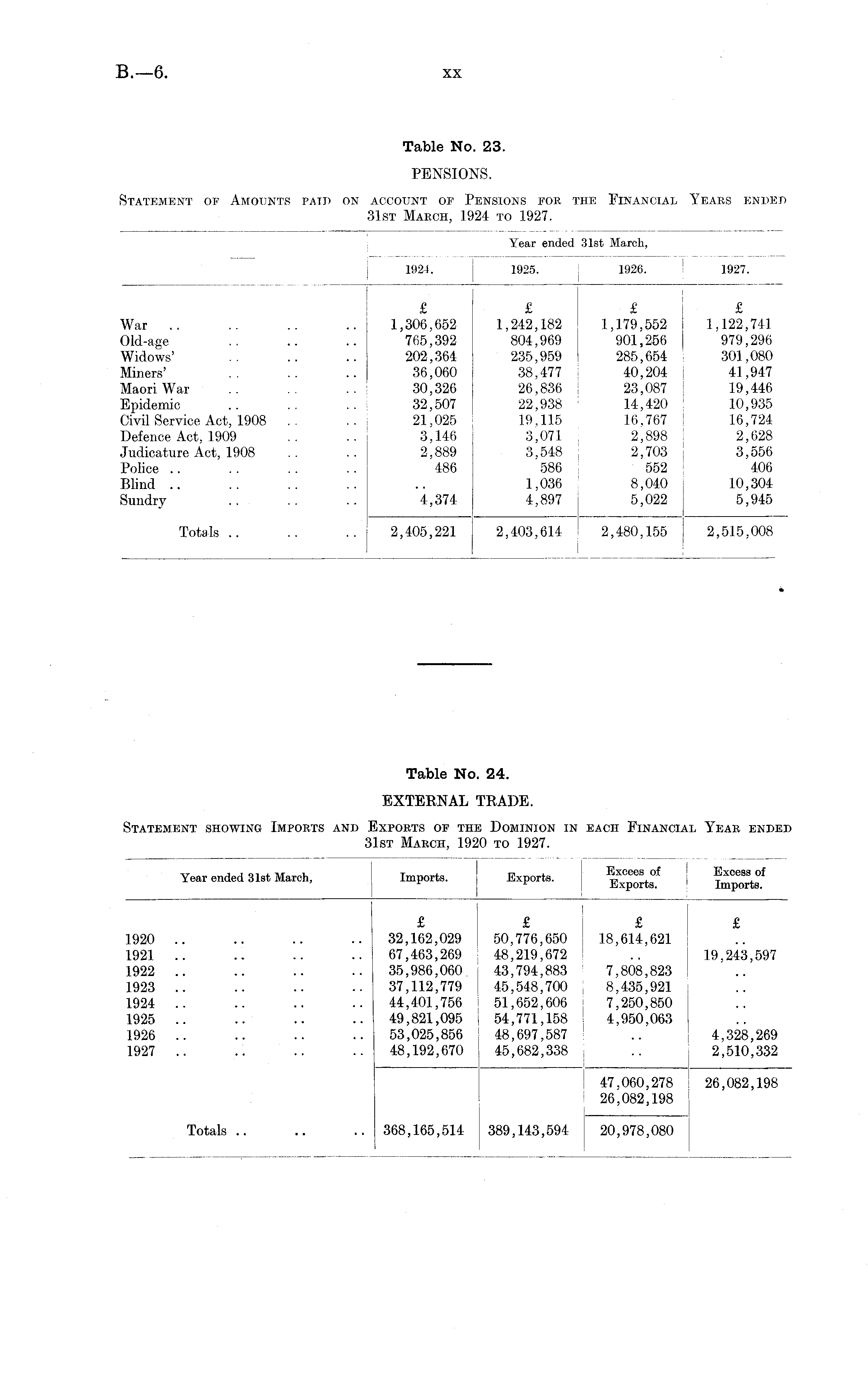 Table No. 24. EXTERNAL TRADE. Statement showing Imports and Exports of the Dominion in each Financial Year ended 31st March, 1920 to 1927.