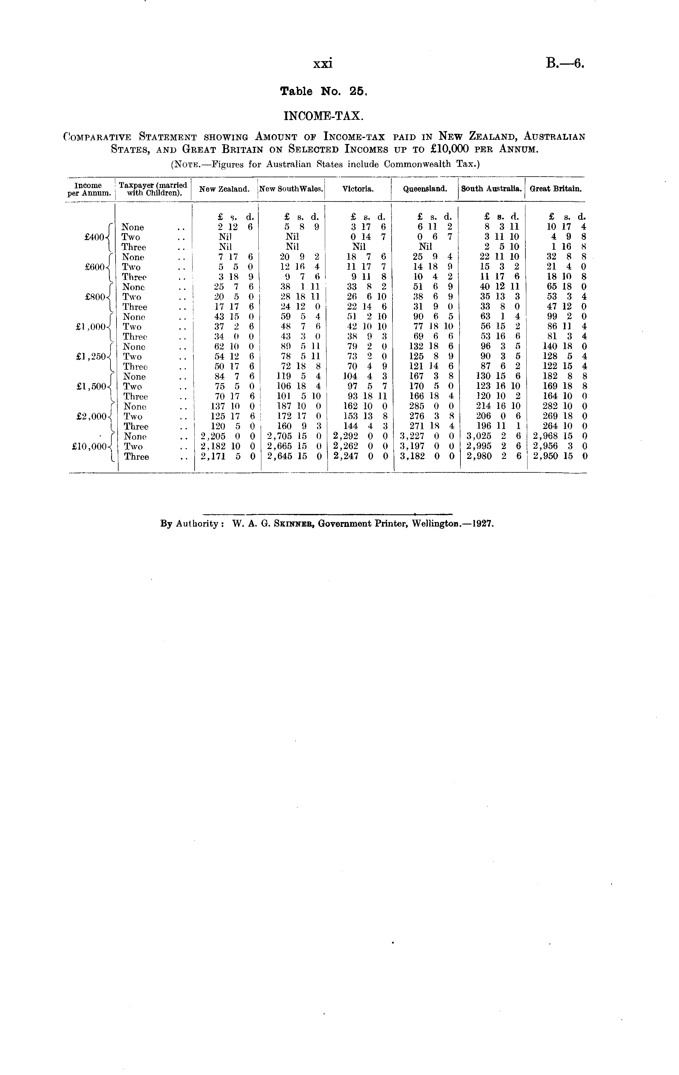 Table No. 25. INCOME-TAX. Comparative Statement showing Amount of Income-tax paid in New Zealand, Australian States, and Great Britain on Selected Incomes up to £10,000 per Annum.