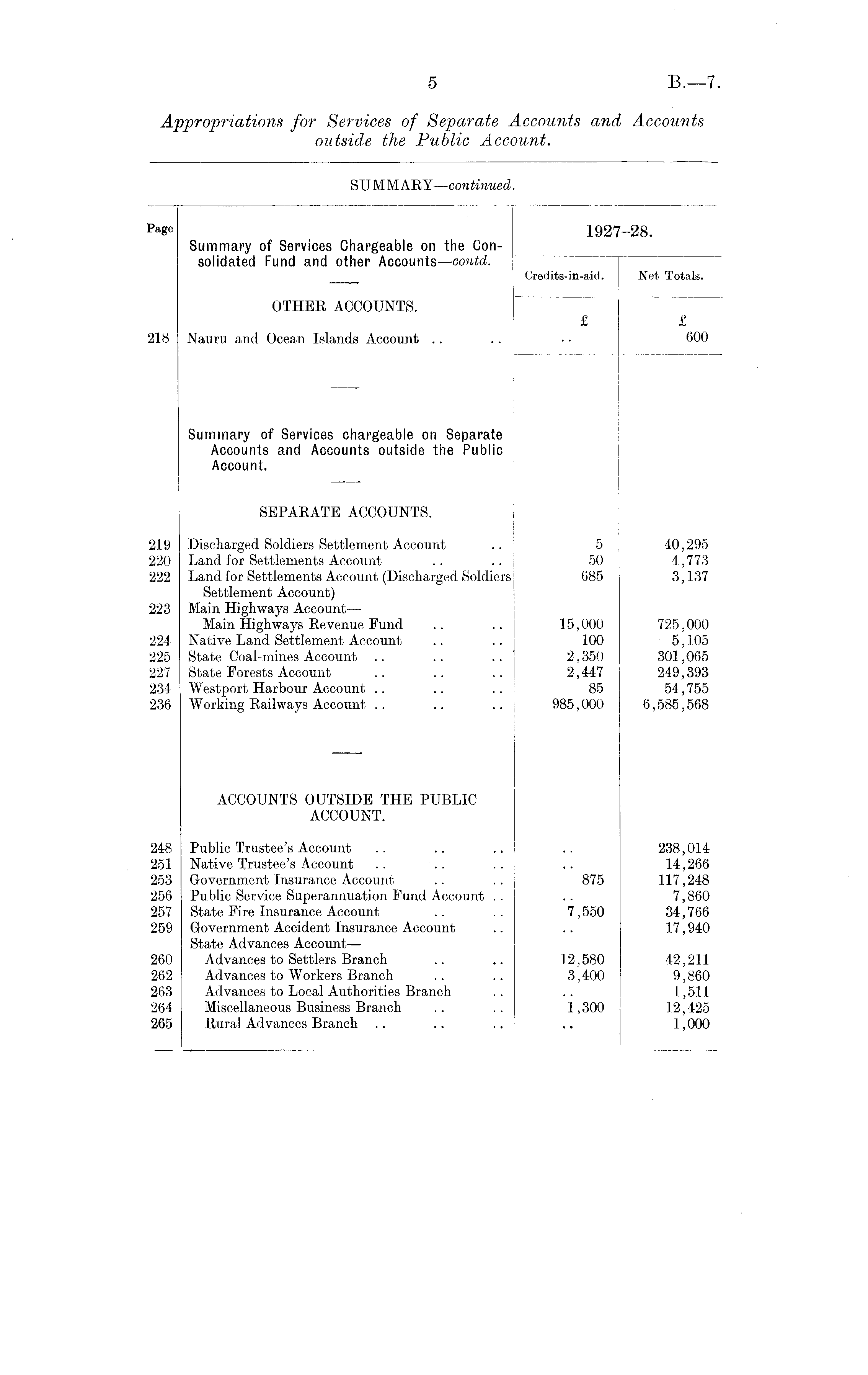Pa s e 1927-28. Summary of Services Chargeable on the Consolidated Fund and other Accounts —contd. Credits-in-aid. Net Totals. OTHER ACCOUNTS. £ £ 218 Nauru and Ocean Islands Account .. .. • • 600 Summary of Services chargeable on Separate Accounts and Accounts outside the Public Account. SEPARATE ACCOUNTS. 219 Discharged Soldiers Settlement Account .. 5 40,295 220 Land for Settlements Account .. .. 50 4,773 222 Land for Settlements Account (Discharged Soldiers 685 3,137 Settlement Account) 223 Main Highways Account — Main Highways Revenue Fund .. .. 15,000 725,000 224 Native Land Settlement Account .. .. 100 5,105 225 State Coal-mines Account .. .. .. 2,350 301,065 227 State Forests Account .. .. .. 2,447 249,393 234 Westport Harbour Account .. .. .. 85 54,755 236 Working Railways Account .. .. .. 985,000 6,585,568 ACCOUNTS OUTSIDE THE PUBLIC ACCOUNT. 248 Public Trustee's Account .. .. .. .. 238,014 251 Native Trustee's Account .. .. .. .. 14,266 253 Government Insurance Account .. .. 875 117,248 256 Public Service Superannuation Fund Account .. .. 7,860 257 State Fire Insurance Account .. .. 7,550 34,766 259 Government Accident Insurance Account .. .. 17,940 State Advances Account— 260 Advances to Settlers Branch .. .. 12,580 42,211 262 Advances to Workers Branch .. .. 3,400 9,860 263 Advances to Local Authorities Branch .. .. 1,511 264 Miscellaneous Business Branch .. .. 1,300 12,425 265 Rural Advances Branch .. .. .. .. 1,000
