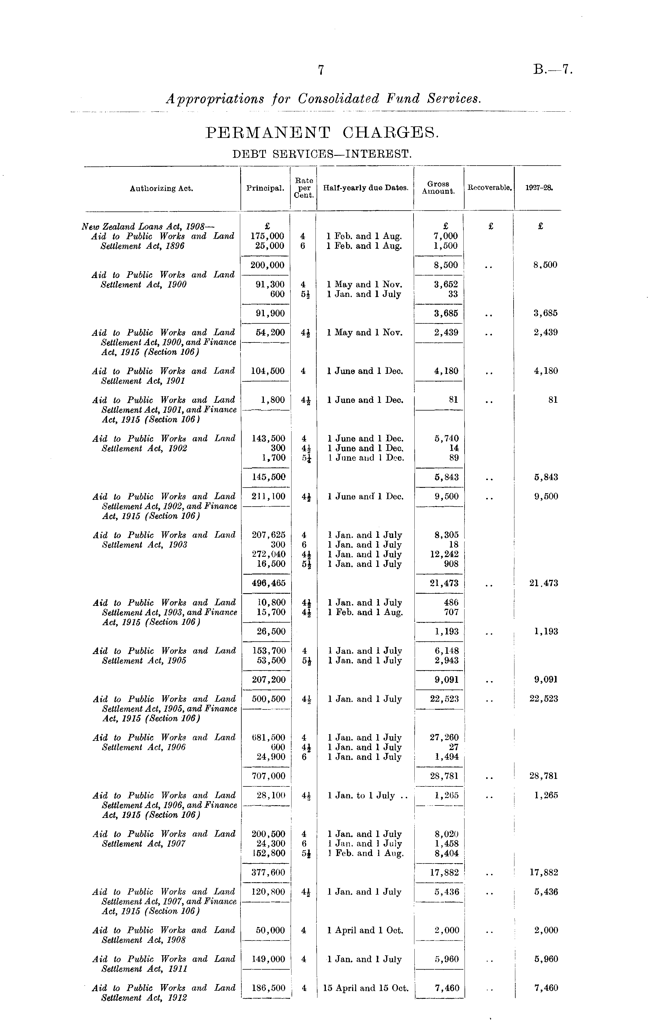 Rate (rrnqs Authorizing Act. Principal. per Hall-yearly due Dates. ," n °. Recoverable. 1937-28. Cent. New Zealand Loans Act, 1908 — £ £ £ £ Aid to Public Works and Land 175,000 4 1 Feb. and 1 Aug. 7,000 Settlement Act, 1896 25,000 6 1 Feb. and 1 Aug. 1,500 200,000 8,500 .. 8,500 Aid to Public Works and Land — Settlement Act, 1900 91,300 4 1 May and 1 Nov. 3,652 600 5J 1 Jan. and 1 July 33 91,900 3,685 .. 3,685 Aid to Public Works and Land 54,200 4J 1 May and 1 Nov. 2,439 .. 2,439 Settlement Act, 1900, and Finance Act, 1915 (Section 106) Aid to Public Works and Land 104,500 4 1 June and 1 Deo. 4,180 .. 4,180 Settlement Act, 1901 — Aid to Public Works and Land 1,800 4i 1 June and 1 Dee. 81 81 Settlement Act, 1901, and Finance — Act, 1915 (Section 106) Aid to Public Works and Land 143,500 4 1 June and 1 Dec. 5,740 Settlement Act, 1902 300 4J 1 June and 1 Deo. 14 1,700 5£ 1 June and 1 Dee. 89 145,500 5,843 .. 5,843 Aid to Public Works and Land 211,100 4J 1 June and 1 Dec. 9,500 .. 9,500 Settlement Act, 1902, and Finance — Act, 1915 (Section 106) Aid to Public Works and Land 207,625 4 1 Jan. and 1 July 8,305 Settlement Act, 1903 300 6 1 Jan. and 1 July 18 272,040 4J 1 Jan. and 1 July 12,242 16,500 5J 1 Jan. and 1 July 908 496,465 21,473 .. 21.473 Aid to Public Works and Land 10,800 4J 1 Jan. and 1 July 486 Settlement Act, 1903, and Finance 15,700 4J 1 Feb. and 1 Aug. 707 Act, 1915 (Section 106) 26,500 1,193 .. 1,193 Aid to Public Works and Land 153,700 4 1 Jan. and 1 July 6,148 Settlement Act, 1905 53,500 5J 1 Jan. and 1 July 2,943 207,200 9,091 .. 9,091 Aid to Public Works and Land 500,500 4J 1 Jan. and 1 July 22,523 .. 22,523 Settlement Act, 1905, and Finance — Act, 1915 (Section 106) Aid to Public Works and Land 681,500 4 1 Jan. and 1 July 27,260 Settlement Act, 1906 600 4£ 1 Jan. and 1 July 27 24,900 6 1 Jan. and 1 July 1,494 707,000 28,781 .. 28,781 Aid to Public Works and Land 28,100 4£ 1 Jan. to 1 July .. 1,265 .. 1,265 Settlement Act, 1906, and Finance — Act, 1915 (Section 106) Aid to Public Works and Land 200,500 4 1 Jan. and 1 July 8,020 Settlement Act, 1907 24,300 6 1 Jan. and 1 July 1,458 152,800 5J 3 Feb. and 1 Aug. 8,404 377,600 17,882 .. 17,882 Aid to Public Works and Land 120,800 4| 1 Jan. and 1 July 5,436 .. j 5,436 Settlement Act, 1907, and Finance Act, 1915 (Section 106) Aid to Public Worlcs and Land 50,000 4 1 April and 1 Oct. 2,000 .. 2,000 Settlement Act, 1908 — — Aid to Public Works and Land 149,000 4 1 Jan. and 1 July 5,960 .. 5,960 Settlement Act, 1911 — —-— — Aid to Public Works and Land 186,500 4 15 April and 15 Oct. 7,460 •• j 7,460 Settlement Act, 1912 —- '