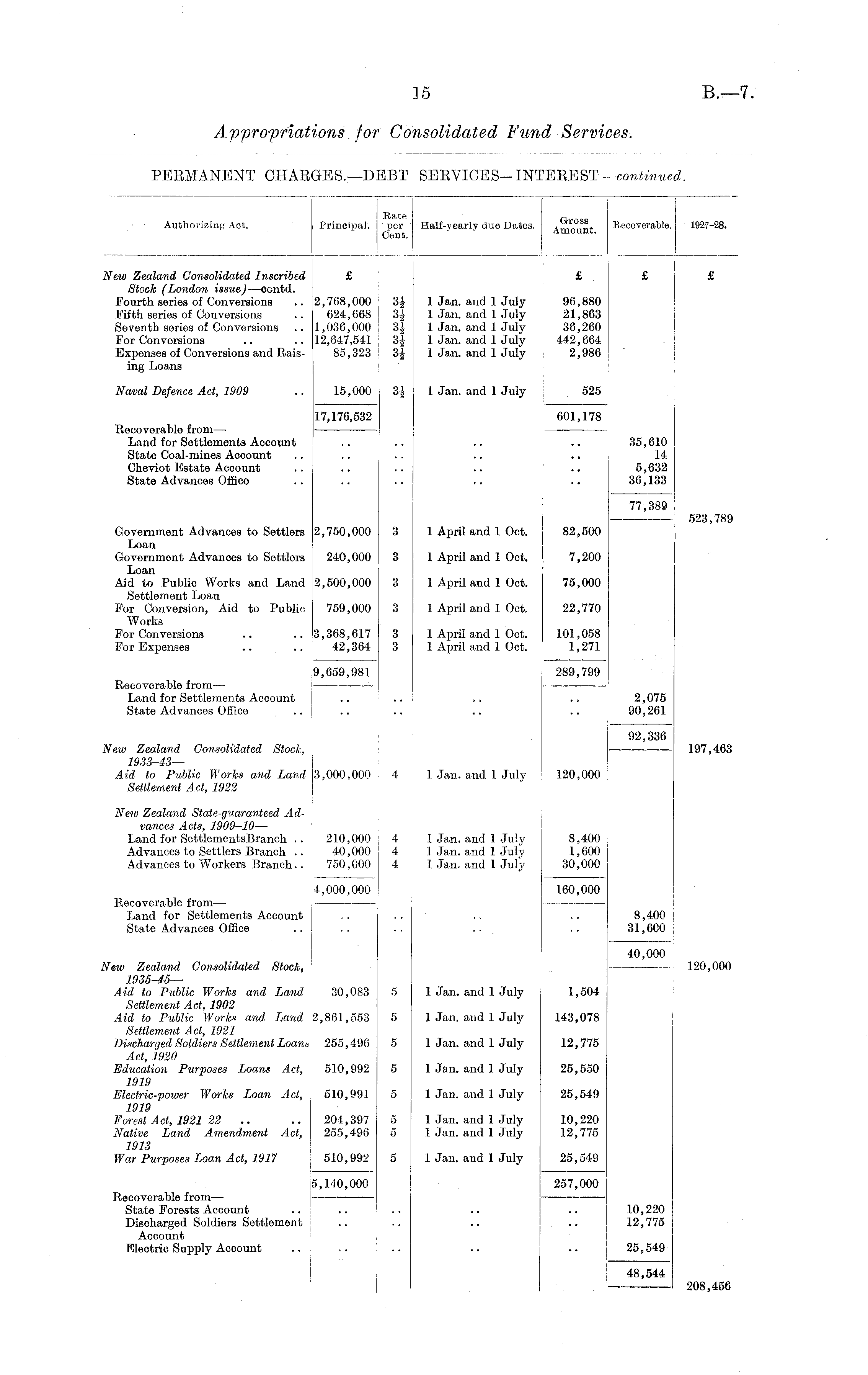 Rate fl-voRH Authorizing Act. Principal. per Half-yearly due Dates. Recoverable. 1927-28. Cent. Amount. New Zealand Consolidated Inscribed £ £ £ £ Stock (London issue) —oontd. Fourth series of Conversions .. 2,768,000 3J 1 Jan. and 1 July 96,880 Fifth series of Conversions .. 624,668 3J 1 Jan. and 1 July 21,863 Seventh series of Conversions .. 1,036,000 3J 1 Jan. and 1 July 36,260 For Conversions .. .. 12,647,541 3J 1 Jan. and 1 July 442,664 Expenses of Conversions and Rais- 83,323 3J 1 Jan. and 1 July 2,986 ing Loans Naval Defence Act, 1909 .. 15,000 3J 1 Jan. and 1 July 525 17,176,532 601,178 Recoverable from — — Land for Settlements Account .. .. .. .. 35,610 State Coal-mines Account .. .. .. .. .. 14 Cheviot Estate Account .. .. .. .. .. 5,632 State Advances Office .. .. .. .. .. 36,133 77,389 523,789 Government Advances to Settlers 2,750,000 3 1 April and 1 Oct. 82,500 Loan Government Advances to Settlers 240,000 3 1 April and 1 Oct. 7,200 Loan Aid to Public Works and Land 2,500,000 3 1 April and 1 Oct. 75,000 Settlement Loan For Conversion, Aid to Public 759,000 3 1 April and 1 Oct. 22,770 Works For Conversions .. .. 3,368,617 3 1 April and 1 Oct. 101,058 For Expenses .. .. 42,364 3 1 April and 1 Oct. 1,271 9,659,981 289,799 Recoverable from — — — — — Land for Settlements Account .. .. .. .. 2,075 State Advances Office .. .. .. .. .. 90,261 92,336 New Zealand Consolidated Stock, — 197,463 1933-43— Aid to Public Works and Land 3,000,000 4 1 Jan. and 1 July 120,000 Settlement Act, 1922 New Zealand State-guaranteed Advances Acts, 1909-10 — Land for SettlementsBranch .. 210,000 4 1 Jan. and 1 July 8,400 Advances to Settlers Branch .. 40,000 4 1 Jan. and 1 July 1,600 Advances to Workers Branch.. 750,000 4 1 Jan. and 1 July 30,000 4,000,000 160,000 Recoverable from —- Land for Settlements Account .. .. .. .. 8,400 State Advances Office .. .. .. .. .. 31,600 40,000 New Zealand Consolidated Stock, 120,000 1935-45— Aid to Public Works and Land 30,083 5 1 Jan. and 1 July 1,504 Settlement Act, 1902 Aid to Public Works and Land 2,861,553 5 1 Jan. and 1 July 143,078 Settlement Act, 1921 Discharged Soldiers Settlement Loans 255,496 5 1 Jan. and 1 July 12,775 Act, 1920 Education Purposes Loans Act, 510,992 5 1 Jan. and 1 July 25,550 1919 Electric-power Works Loan Act, 510,991 5 1 Jan. and 1 July 25,549 1919 Forest Act, 1921-22 .. .. 204,397 5 1 Jan. and 1 July 10,220 Native Land Amendment Act, 255,496 5 1 Jan. and 1 July 12,775 1913 War Purposes Loan Act, 1917 510,992 5 1 Jan. and 1 July 25,549 5,140,000 257,000 Recoverable from — State Forests Account .. .. .. .. .. 10,220 Discharged Soldiers Settlement .. .. .. .. 12,775 Account Electric Supply Acoount .. .. .. .. .. 25,549 48,544 208,456