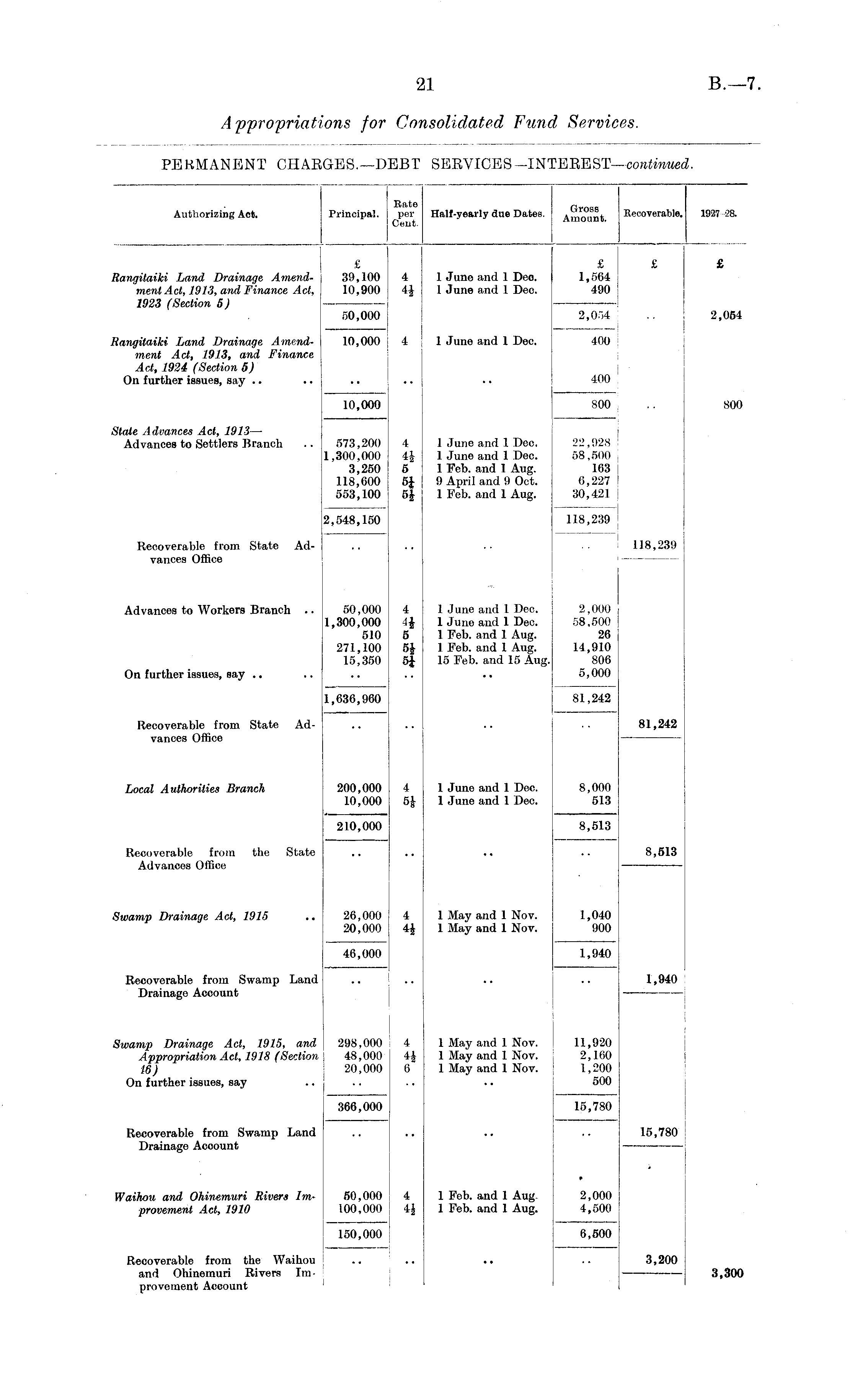 Rate frrnsB Authorizing Act. Principal. per Half-yearly doe Dates. Recoverable. 1927 28. Cent. amouns. £ £ £ £ Rangitailci Land Drainage Amend- 39,100 4 1 June and 1 Deo. 1,564 ment Act, 1913, and Finance Act, 10,900 4 J 1 June and 1 Dec. 490 1923 (Section 5) ___ — 50,000 2,054 .. 2,054 Rangitailci Land Drainage Amend- 10,000 4 1 June and 1 Dec. 400 ment Act, 1913, and Finance Act, 1924 (Section 5) • "l On further issues, say .. .. .. .. .. 400 10,000 800 . . 800 State Advances Act, 1913 — ■ Advances to Settlers Branch .. 573,200 4 1 June and 1 Dec. 22,928 1,300,000 4| 1 June and 1 Dec. 58,500 3,250 5 1 Feb. and 1 Aug. 163 118,600 5J 9 April and 9 Oct. 6,227 I 553,100 5J 1 Feb. and 1 Aug. 30,421 2,548,150 118,239 Recoverable from State Ad- .. .. • • 118,239 vances Office Advances to Workers Branch .. 50,000 4 1 June and 1 Dec. 2,000 1,300,000 4$ 1 June and 1 Dee. 58,500 510 5 1 Feb. and 1 Aug. 26 271,100 5$ 1 Feb. and 1 Aug. 14,910 15,350 5J 15 Feb. and 15 Aug. 806 On further issues, say .. .. .. .. 5,000 1,636,960 81,242 Recoverable from State Ad- .. .. .. .. 81,242 vances Office Local Authorities Branch 200,000 4 1 June and 1 Dec. 8,000 10,000 5J 1 June and 1 Dec. 513 210,000 8,513 Recoverable from the State .. .. .. .. 8,513 Advances Office — Swamp Drainage Act, 1915 .. 26,000 4 1 May and 1 Nov. 1,040 20,000 44 1 May and 1 Nov. 900 46,000 1,940 Recoverable from Swamp Land .. .. .. .. 1,940 Drainage Account Swamp Drainage Act, 1915, and 298,000 4 1 May and 1 Nov. 11,920 Appropriation Act, 1918 (Section 48,000 4 J 1 May and 1 Nov. 2,160 16) 20,000 6 1 May and 1 Nov. 1,200 On further issues, say .. .. .. .. 500 366,000 15,780 Recoverable from Swamp Land .. .. .. .. 15,780 Drainage Acoount — Waihou and Ohinemuri Rivers lm~ 50,000 4 1 Feb. and 1 Aug 2,000 provement Act, 1910 100,000 4| 1 Feb. and 1 Aug. 4,500 150,000 6,500 Recoverable from the Waihou .. .. •• .. 3,200 and Ohinemuri Rivers Ira- 3,300 provement Account