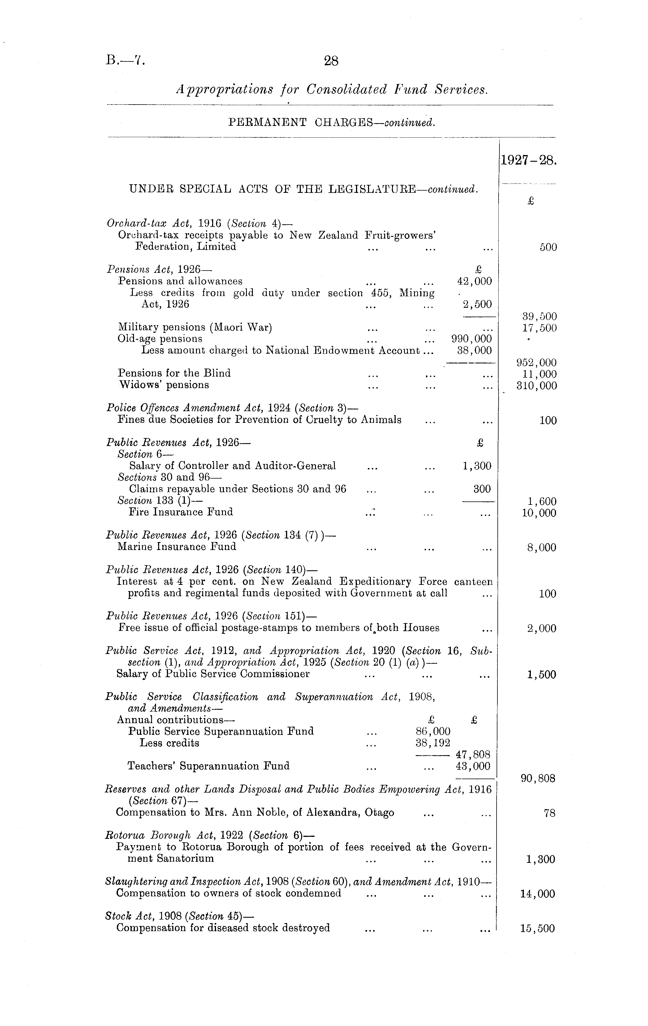 1927-28. UNDER SPECIAL ACTS OF THE LEGISLATURE —continued. £ Orchard-tax Act, 1916 (Section 4) — Orchard-tax receipts payable to New Zealand Fruit-growers' Federation, Limited ... ... ... 500 Pensions Act, 1926— £ Pensions and allowances ... ... 42,000 Less credits from gold duty under section 455, Mining Act, 1926 " ... ... 2,500 -—— 39,500 Military pensions (Maori War) ... ... ... 17,500 Old-age pensions ... ... 990,000 Less amount charged to National Endowment Account ... 38,000 952,000 Pensions for the Blind ... ... ... 11,000 Widows' pensions ... ... ... 310,000 Police Offences Amendment Act, 1924 (Section 3) — Fines due Societies for Prevention of Cruelty to Animals ... ... 100 Public Revenues Act, 1926—• £ Section 6— Salary of Controller and Auditor-General ... ... 1,300 Sections 30 and 96— Claims repayable under Sections 30 and 96 ... ... 300 Section 133 (1) — — 1,600 Fire Insurance Fund ... ... 10,000 Public Revenues Act, 1926 (Section 134 (7)) — Marine Insurance Fund ... ... ... 8,000 Public Revenues Act, 1926 (Section 140) — Interest at 4 per cent, on New Zealand Expeditionary Force canteen profits and regimental funds deposited with Government at call ... 100 Public Revenues Act, 1926 (Section 151) — Free issue of official postage-stamps to members of,both Houses ... 2,000 Public Service Act, 1912, and Appropriation Act, 1920 (Section 16, Subsection (1), and Appropriation Act, 1925 (Section 20 (1) (a)) — Salary of Public Service Commissioner ... ... ... 1,500 Public Service Classification and Superannuation Act, 1908, and Amendments— Annual contributions— £ £ Public Service Superannuation Fund ... 86,000 Less credits ... 38,192 47,808 Teachers' Superannuation Fund ... ... 43,000 90,808 Reserves and other Lands Disposal and Public Bodies Empowering Act, 1916 (Section 67) — Compensation to Mrs. Ann Noble, of Alexandra, Otago ... ... 78 Rotorua Borough Act, 1922 (Section 6) — Payment to Rotorua Borough of portion of fees received at the Government Sanatorium ... ... ... 1,300 Slaughtering and Inspection Act, 1908 (Section 60), and Amendment Act, 1910—— Compensation to owners of stock condemned ... ... ... 14,000 Stock Act, 1908 (Section 45) — Compensation for diseased stock destroyed ... ... ... 15,500