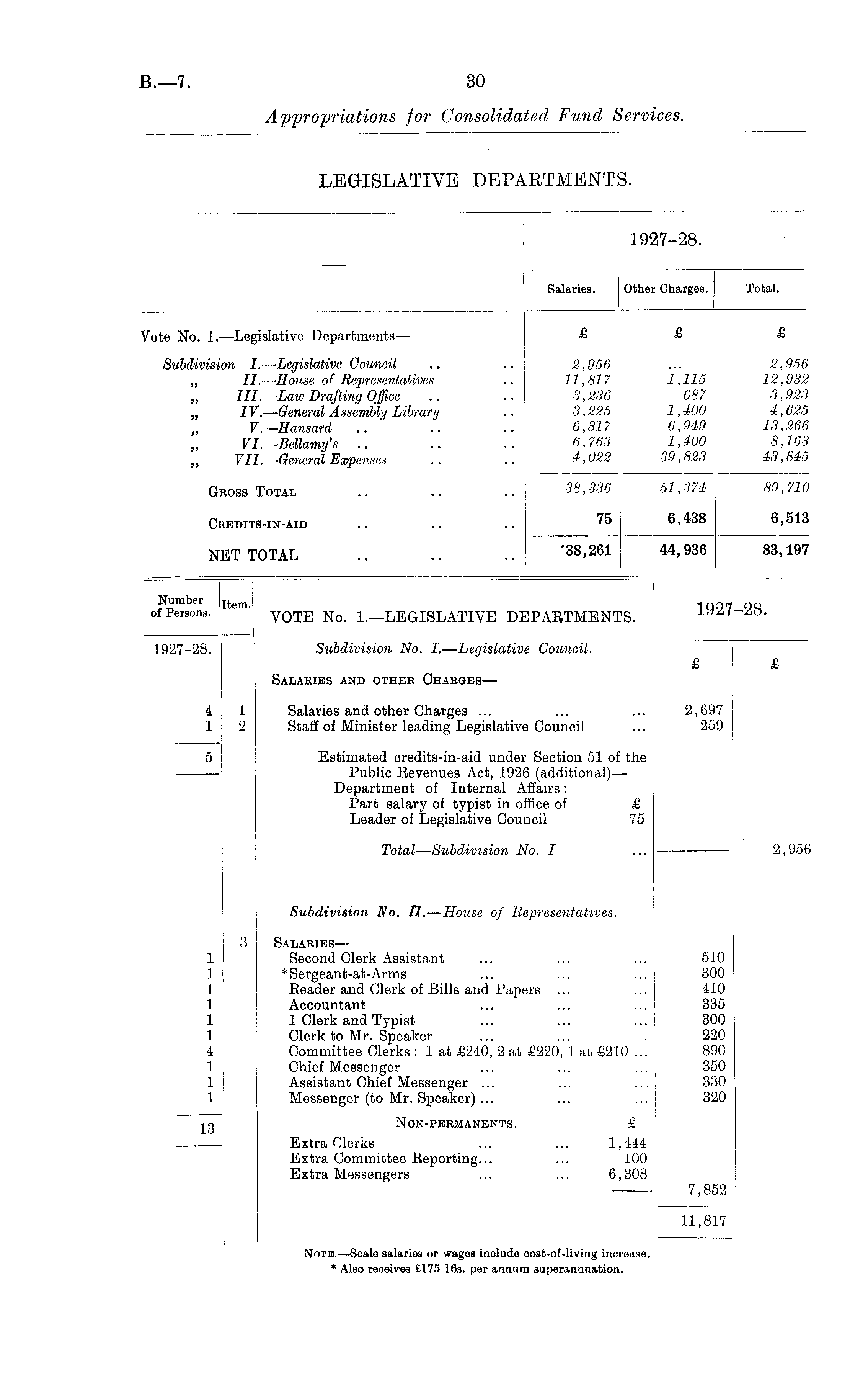 1927-28. Salaries. Other Charges. Total. Vote No. 1. —Legislative Departments — £ £ £ Subdivision I. —Legislative Council .. .. 2,956 ... 2,956 „ II. —House of Representatives .. 11,817 1,115 1.2,932 III.—Law Drafting Office .. .. 3,236 687 3,923 „ IV. —General Assembly Library .. 3,225 1,400 4,625 „ V. —Hansard .. .. .. 6,317 6,949 13,266 VI.—Bellamy's .. .. .. 6,763 1,400 8,163 ,, VII.—-General Expenses .. .. 4,022 39,823 43,845 GBOSS Total .. .. .. 38,336 51,374 89,710 Credits-in-aid .. .. .. 6,438 6,513 NET TOTAL 38,261 44,936 83,197 Number Item 1QQ7 9ft Of Persons. VOTE No. 1.—LEGISLATIVE DEPARTMENTS. 1927-28. Subdivision No. I.—Legislative Council. £ £ Salaries and other Charges— 4 1 Salaries and other Charges ... ... ... 2,697 1 2 Staff of Minister leading Legislative Council ... 259 5 Estimated credits-in-aid under Section 51 of the Public Revenues Act, 1926 (additionalDepartment of Internal Affairs: Part salary of typist in office of £ Leader of Legislative Council 75 Total—Subdivision No. I ... 2,956 Subdivision No. II.—House of Representatives. 3 Salaries — 1 Second Clerk Assistant ... ... ... 510 1 *Sergeant-at-Arms ... ... ... 300 1 Reader and Clerk of Bills and Papers ... ... 410 1 Accountant ... ... ... i 335 1 1 Clerk and Typist ... ... ... 300 1 Clerk to Mr. Speaker ... ... 220 4 Committee Clerks : 1 at £240, 2 at £220, 1 at £210 ... 890 1 Chief Messenger ... ... ... 350 1 Assistant Chief Messenger ... ... ... 330 1 Messenger (to Mr. Speaker)... ... ... 320 Non-permanents. £ Extra Clerks ... ... 1,444 Extra Committee Reporting... ... 100 Extra Messengers ... ... 6,308 7,852 11,817 Note.—Soale salaries or wages iaolude cost-of-living increase. * Also receives £175 16s. per annum superannuation.