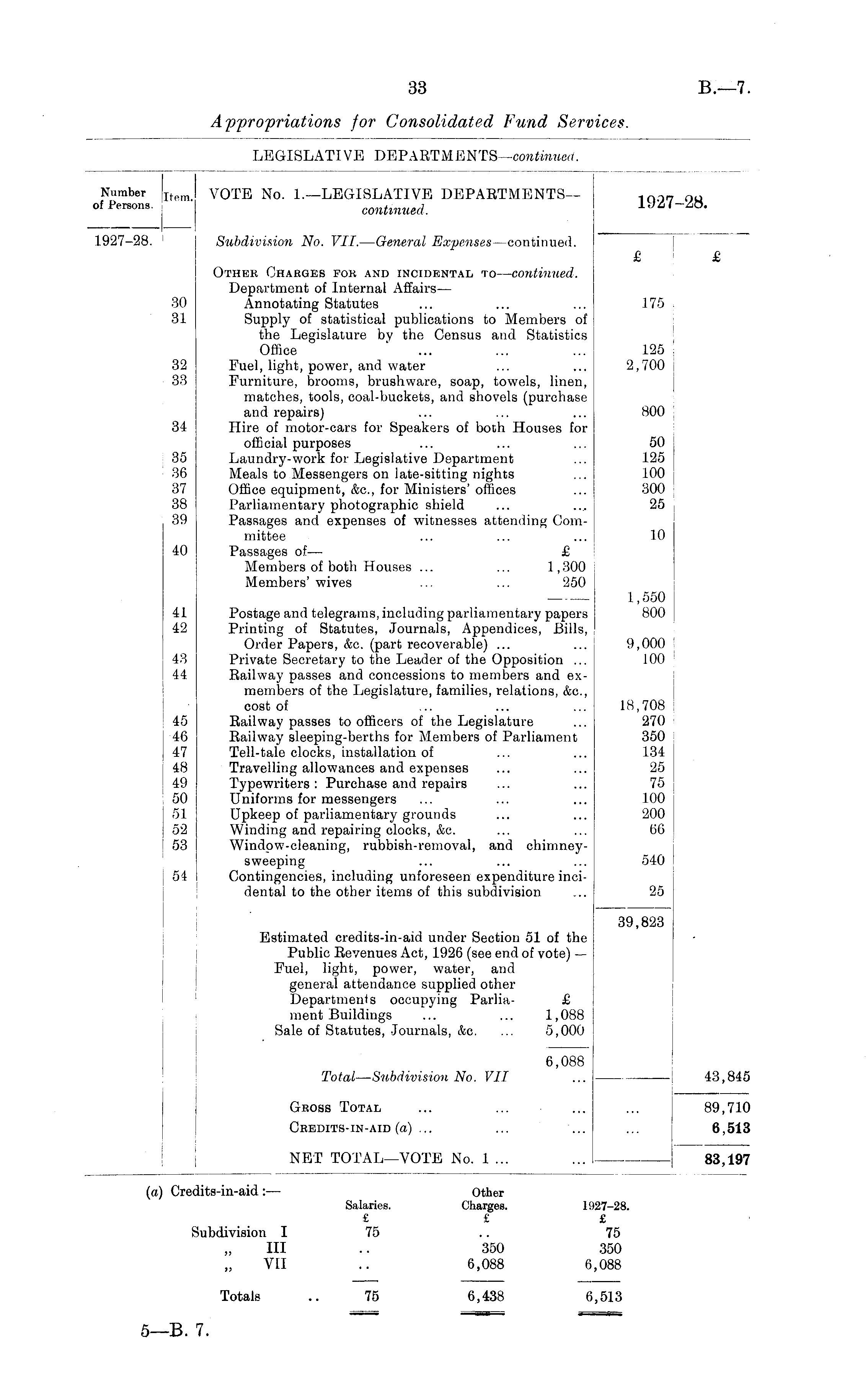 Number | Item J VOTE No. 1.—LEGISLATIVE DEPARTMENTS— 1nol7 ou of Persons, p j continued. 19-27-28. 1.927-28. 1 Subdivision No. VII.—General Expenses—continued. £ £ Other Charges fob and incidental to —continued. Department of Internal Affairs— 30 Annotating Statutes ... ... ... 175 31 Supply of statistical publications to Members of the Legislature by the Census and Statistics Office ... ... ... 125 32 Fuel, light, power, and water ... ... 2,700 33 Furniture, brooms, brushware, soap, towels, linen, matches, tools, coal-buckets, and shovels (purchase and repairs) ... ... ... 800 34 Hire of motor-cars for Speakers of both Houses for official purposes ... ... ... 50 35 Laundry-work for Legislative Department ... 125 36 Meals to Messengers on late-sitting nights ... 100 37 Office equipment, &c., for Ministers' offices ... 300 38 Parliamentary photographic shield ... .... 25 39 Passages and expenses of witnesses attending Committee ... ... ... 10 40 Passages of— £ Members of both Houses ... ... 1,300 Members' wives ... ... 250 1,550 41 Postage and telegrams, including parliamentary papers 800 42 Printing of Statutes, Journals, Appendices, Bills, Order Papers, &c. (part recoverable) ... ... 9,000 { 43 Private Secretary to the Leader of the Opposition ... 100 1 44 Railway passes and concessions to members and exmembers of the Legislature, families, relations, &c., cost of ... ... ... 18,708 45 Railway passes to officers of the Legislature ... 270 ! 46 Railway sleeping-berths for Members of Parliament 350 47 Tell-tale clocks, installation of ... ... 134 48 Travelling allowances and expenses ... ... 25 49 Typewriters: Purchase and repairs ... ... 75 50 Uniforms for messengers ... ... ... 100 51 Upkeep of parliamentary grounds ... ... 200 52 Winding and repairing clocks, &c. ... ... 66 53 Window-cleaning, rubbish-removal, and chimneysweeping ... ... ... 540 54 Contingencies, including unforeseen expenditure incidental to the other items of this subdivision ... 25 39,823 Estimated credits-in-aid under Section 51 of the Public Revenues Act, 1926 (see end of vote) — Fuel, light, power, water, and general attendance supplied other Departments occupying Parlia- £ ment Buildings ... ... 1,088 Sale of Statutes, Journals, &c. ... 5,000 6,088 Total—Subdivision No. VII ... j 43,845 Gross Total ... ... ... ... j 89,710 Credits-in-aid (a) ... ... ... ... 6,513 NET TOTAL—VOTE No. 1 ... ... — | 83,197
