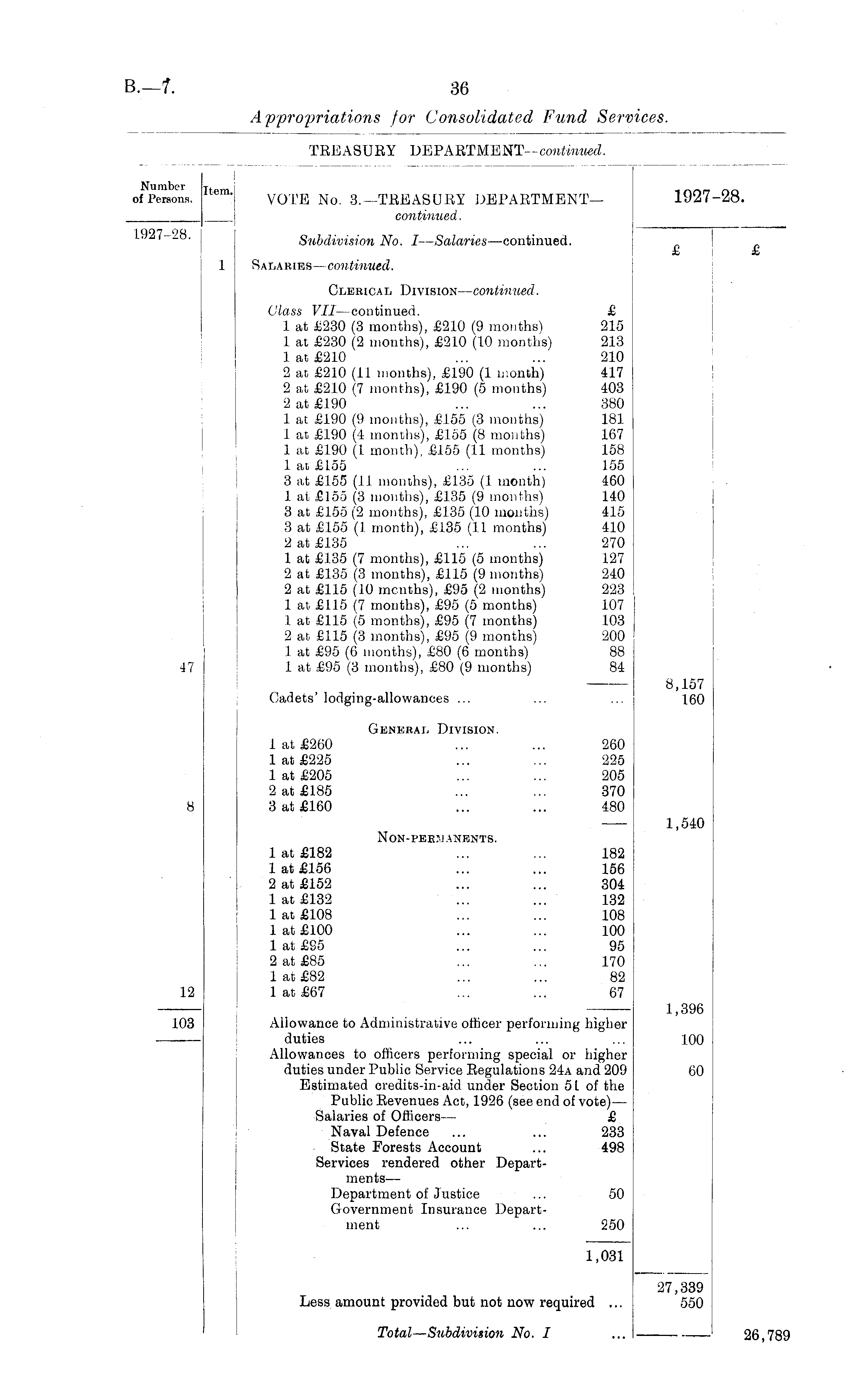 I Number T*„ m I i nr. of Persons. ; VOTE No. 3.—TREASURY DEPARTMENT— 1927-28. continued. 1927—98 Subdivision No. I—Salaries—continued. 1 Salaries—continued. Clerical Division —continued. Class VII—continued. £ 1 at £230 (3 months), £210 (9 months)" 215 1 at £230 (2 months), £210 (10 months) 213 1 at £210 ... ... 210 2 at £210 (11 months), £190 (1 month) 417 2 at £210 (7 months), £190 (5 months) 403 2 at £190 ... ... 380 1 at £190 (9 months), £155 (3 months) 181 1 at £190 (4 months), £155 (8 months) 167 1 at £190 (1 month), £155 (11 months) 158 1 at £155 ... ... 155 3 at £155 (11 months), £135 (1 month) 460 1 at £155 (3 months), £135 (9 months) 140 3 at £155 (2 months), £135 (10 months) 415 3 at £155 (1 month), £135 (11 months) 410 2 at £135 ... ... 270 1 at £135 (7 months), £115 (5 months) 127 2 at £135 (3 months), £115 (9 months) 240 2 at £115 (10 mcnths), £95 (2 months) 223 1 at £115 (7 months), £95 (5 months) 107 1 at £115 (5 months), £95 (7 months) 103 2 at £115 (3 months), £95 (9 months) 200 1 at £95 (6 months), £80 (6 months) 88 47 ■ 1 at £95 (3 months), £80 (9 months) 84 8,157 Cadets' lodging-allowances ... ... ... 160 General Division. 1 at £260 ... ... 260 1 at £225 ... ... 225 1 at £205 ... ... 205 2 at £185 ... ... .370 8 3 at £160 ... ... 480 1,540 Non-peemanents. 1 at £182 ... ... 182 1 at £156 ... ... 156 2 at £152 ... ... 304 1 at £132 ... ... 132 1 at £108 ... ... 108 1 at £100 ... ... 100 1 at £95 ... ... 95 2 at £85 ... ... 170 1 at £82 ... ... 82 12 | 1 at £67 ... ... 67 1,396 103 Allowance to Administrative officer performing higher duties ... ... ... 100 Allowances to officers performing special or higher duties under Public Service Regulations 24a and 209 60 Estimated credits-in-aid under Section 5 L of the Public Revenues Act, 1926 (see end of vote) — Salaries of Officers— £ Naval Defence ... ... 233 State Forests Account ... 498 Services rendered other Departments — Department of Justice ... 50 Government Insurance Department ... ... 250 1,031 27,339 Less amount provided but not now required ... 550 1 Total—Subdivision No. I ... 26,789