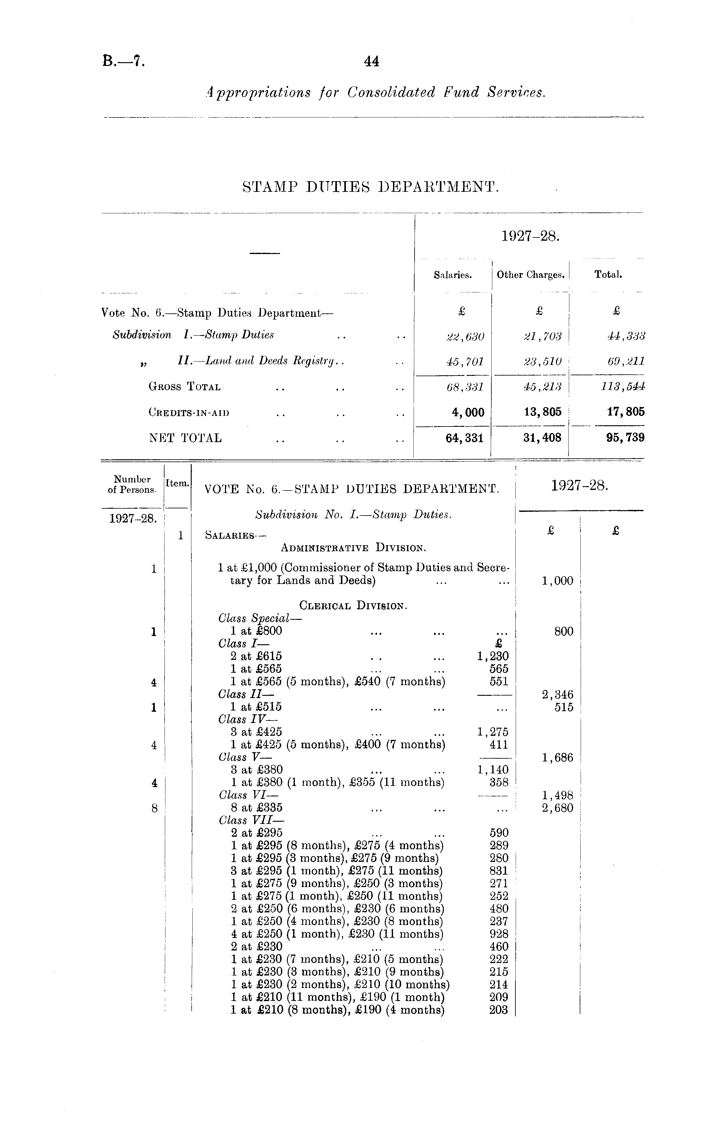 1927-28. Salaries. j Other Charges. I Total. Vote No. 6. —Stamp Duties Department — £ £ £ Subdivision I.—Stam-p Duties .. .. 22,630 21,703 44,333 „ II. —Land and Deeds Registry.. .. 45,701 23,510 69,211 GROSS Total .. .. .. 68,331 45,213 113,544 CREDITS-in-AID .. .. 4,000 13,805 17,805 NET TOTAL .. .. 64,331 31,408 95,739 Item - VOTE No. 6.—STAMP DUTIES DEPARTMENT. 1927-28. 1927-28 Subdivision No. I.—Stamp Duties. ~ 1 Salaries— Administrative Division. 1 1 at £1,000 (Commissioner of Stamp Duties and Secretary for Lands and Deeds) ... ... 1,000 Clerical Division. Glass Special— 1 1 at £800 ... ... ... 800 Class I— £ 2 at £615 .. ... 1,230 1 at £565 ... ... 565 4 1 at £565 (5 months), £510 (7 months) 551 Class II— 2,346 1 1 at £515 ... ... ... 515 Class IV— 3 at £425 ... ... 1,275 4 1 at £425 (5 months), £400 (7 months) 411 Class V — —— 1,686 3 at £380 ... ... 1,140 4 1 at £380 (1 month), £355 (11 months) 358 Class VI— 1,498 8 8 at £335 ... ... ... 2,680 Class VII — 2 at £295 590 1 at £295 (8 months), £275 (4 months) 289 1 at £295 (3 months), £275 (9 months) 280 3 at £295 (1 month), £275 (11 months) 831 1 at £275 (9 months), £250 (3 months) 271 1 at £275 (1 month), £250 (11 months) 252 2 at £250 (6 months), £230 (6 months) 480 1 at £250 (4 months), £230 (8 months) 237 4 at £250 (1 month), £230 (11 months) 928 2 at £230 ... ... 460 1 at £230 (7 months), £210 (5 months) 222 1 at £230 (3 months), £210 (9 months) 215 1 at £230 (2 months), £210 (10 months) 214 1 at £210 (11 months), £190 (1 month) 209 1 at £210 (8 months), £190 (4 months) 203